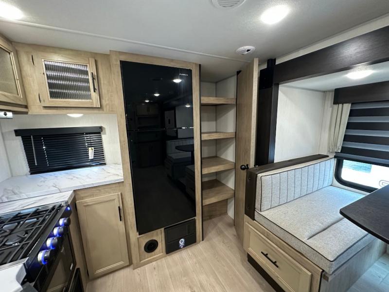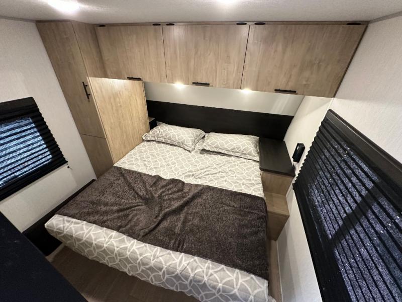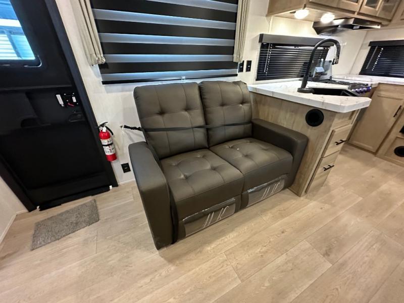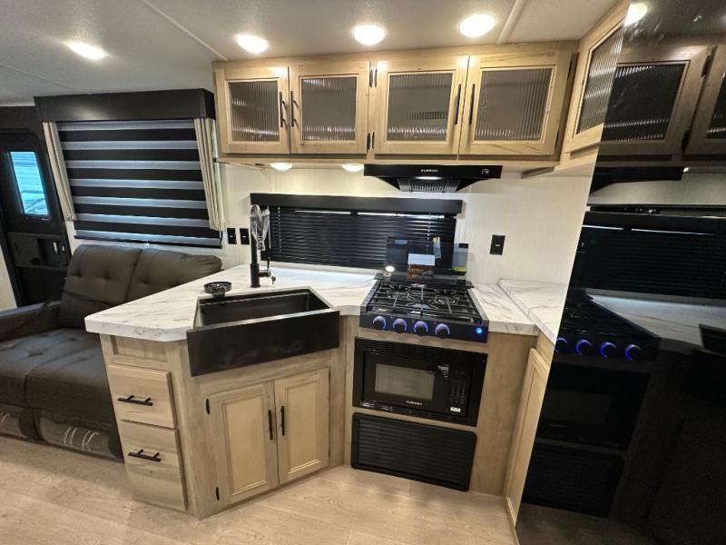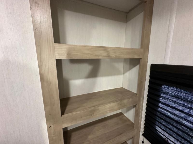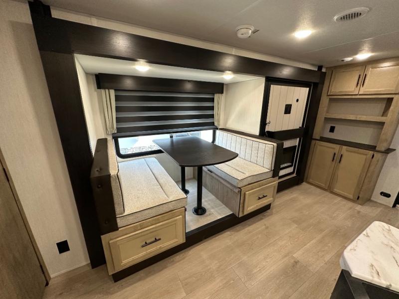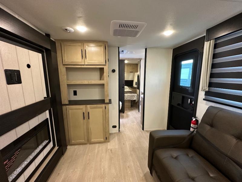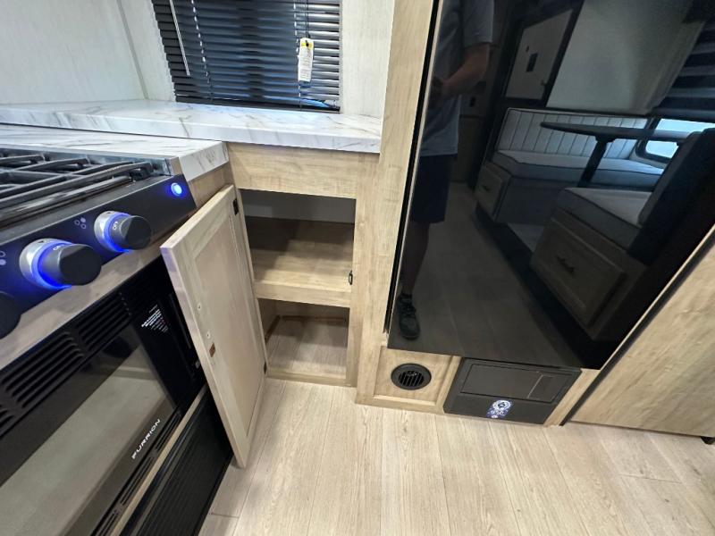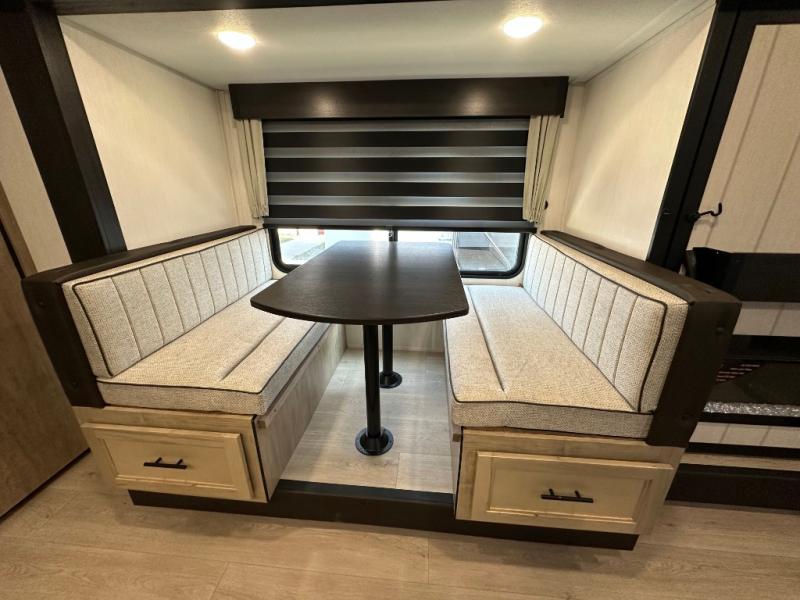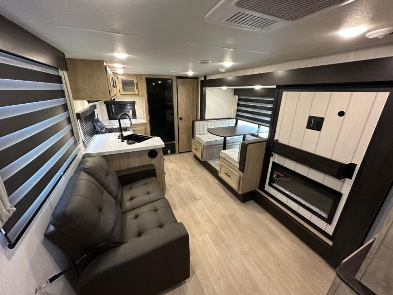 You'll love every minute spent in this single slide out travel trailer, whether you're cooking dinner on the outside kitchen or in the rear kitchen, relaxing on the sofa across from the fireplace, or sleeping on the RV king bed in the front master bedroom! There are hidden shelves behind the fireplace for convenient storage, and the booth dinette within the slide provides a place to dine together. The walk-thru bath is spacious, and includes a tub/shower, toilet, and sink with counter space.