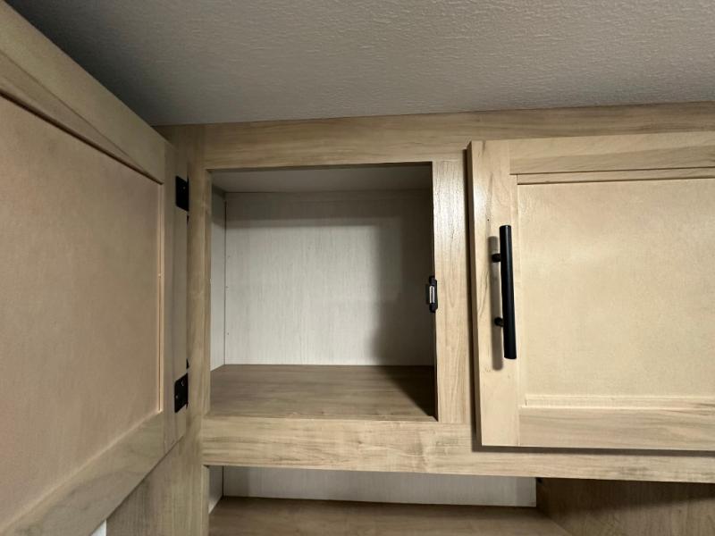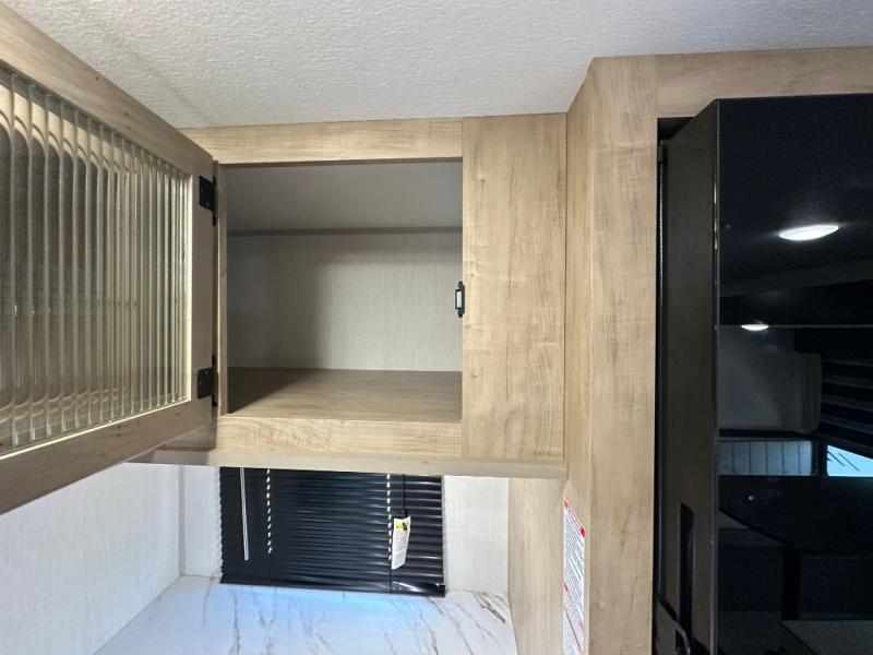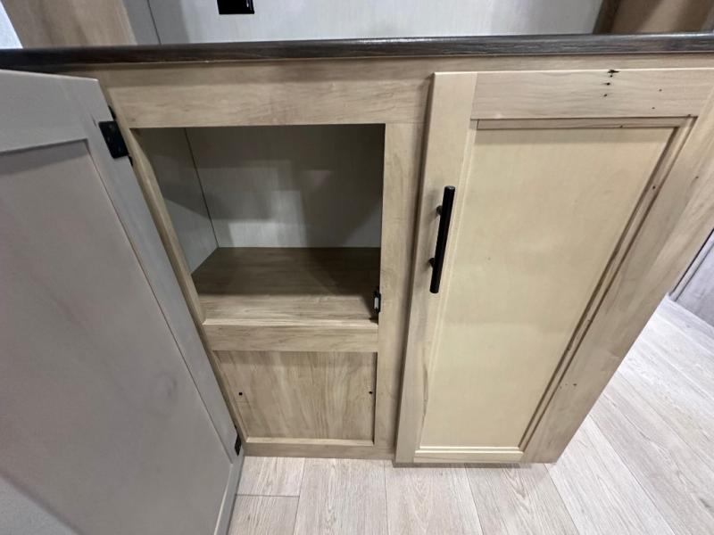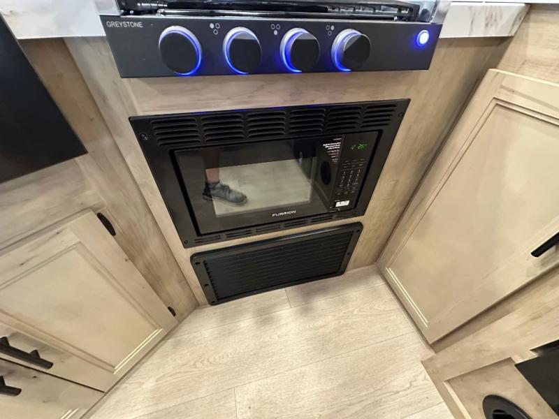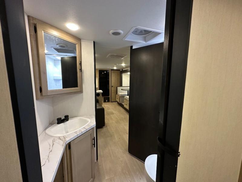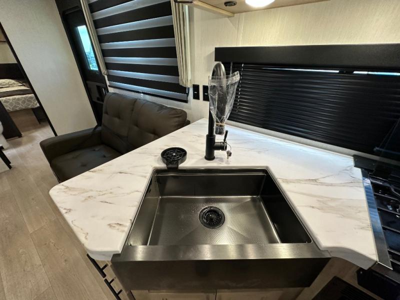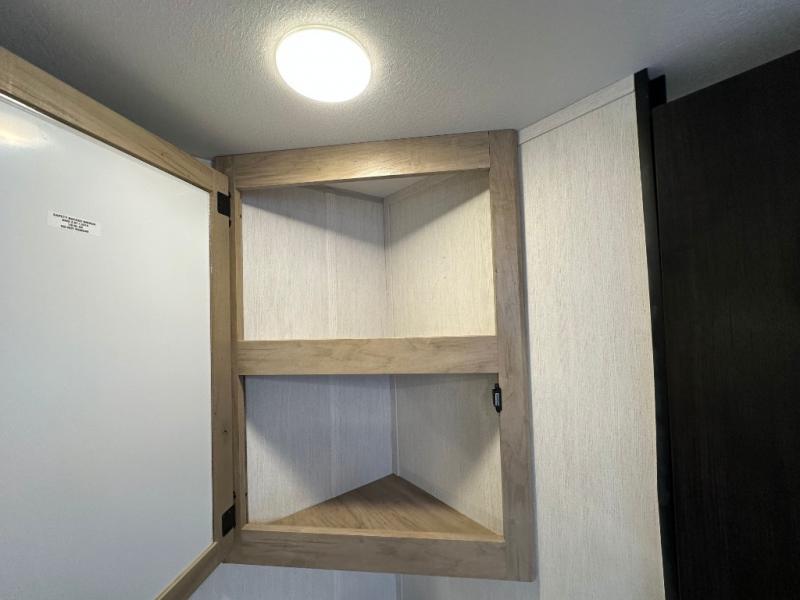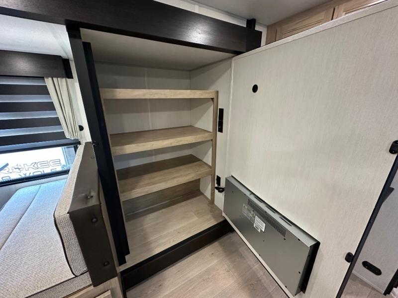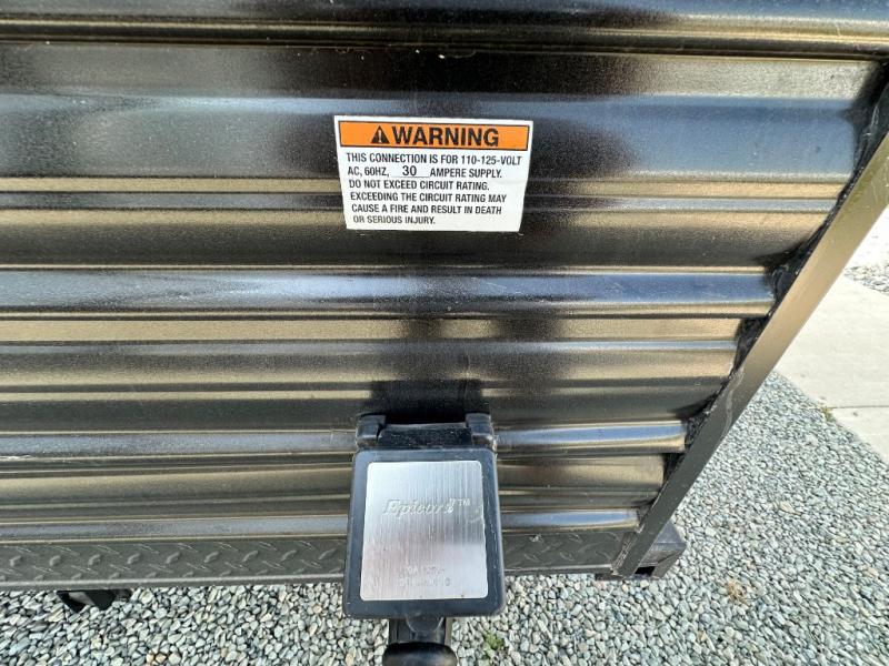 You'll love every minute spent in this single slide out travel trailer, whether you're cooking dinner on the outside kitchen or in the rear kitchen, relaxing on the sofa across from the fireplace, or sleeping on the RV king bed in the front master bedroom! There are hidden shelves behind the fireplace for convenient storage, and the booth dinette within the slide provides a place to dine together. The walk-thru bath is spacious, and includes a tub/shower, toilet, and sink with counter space.