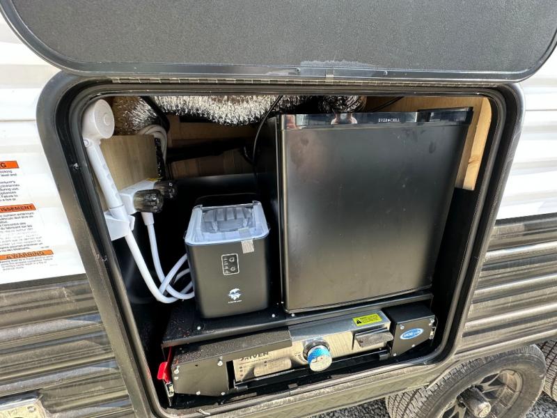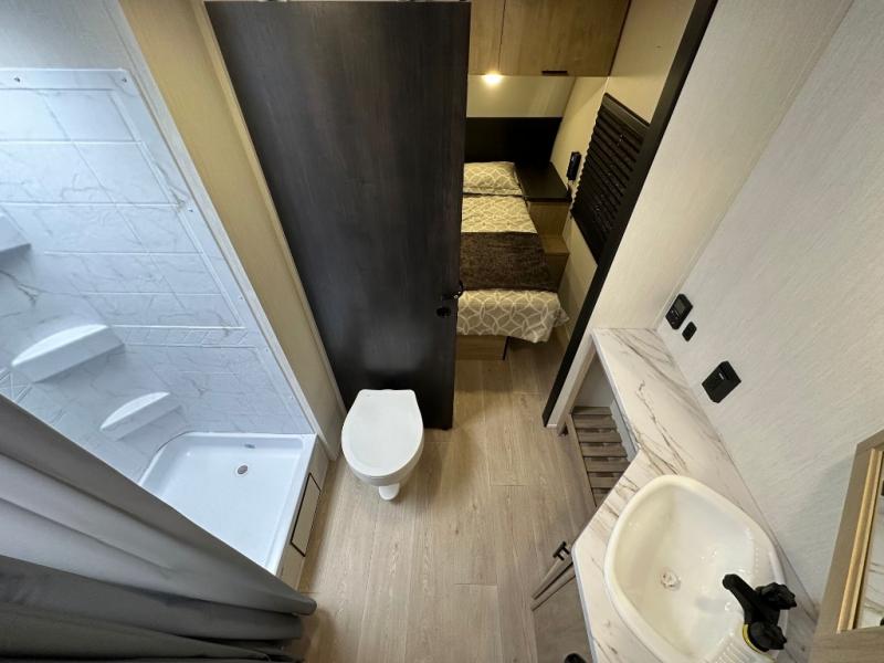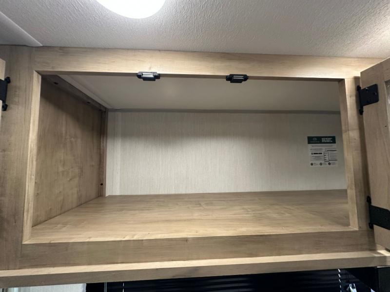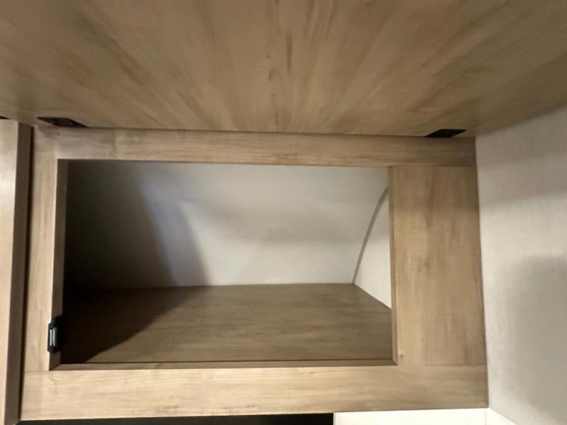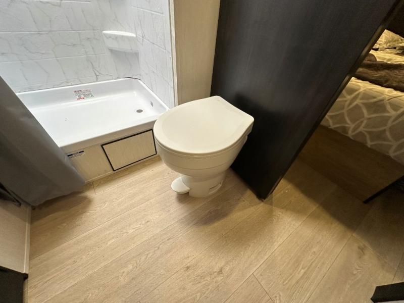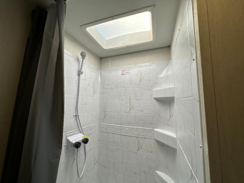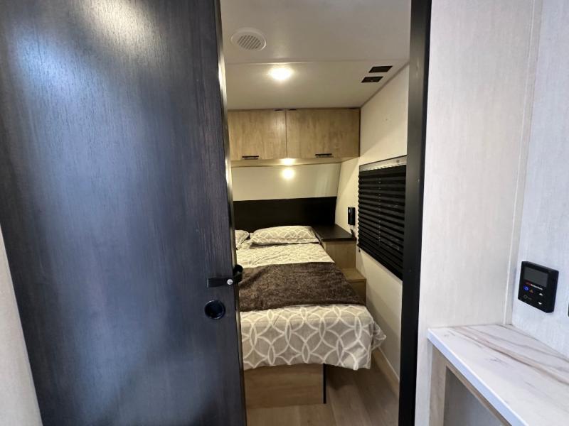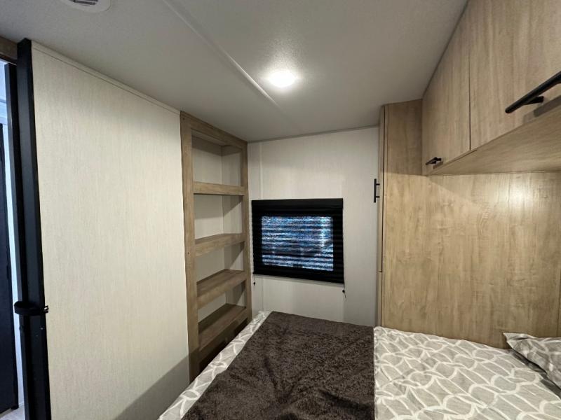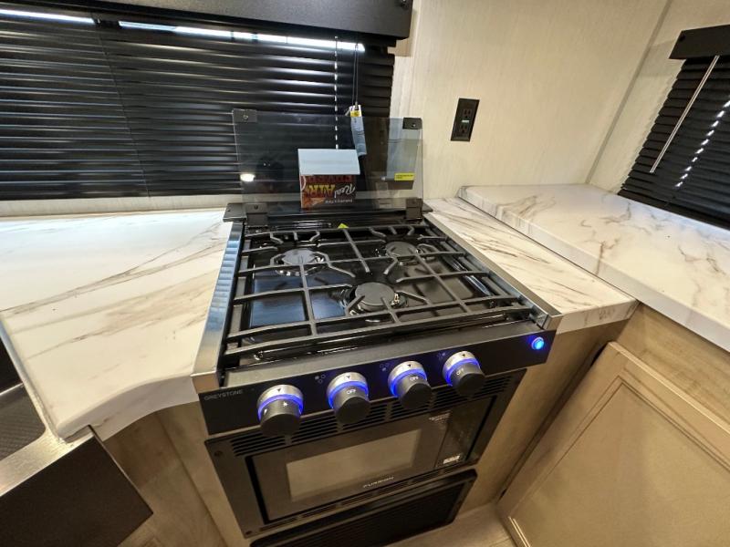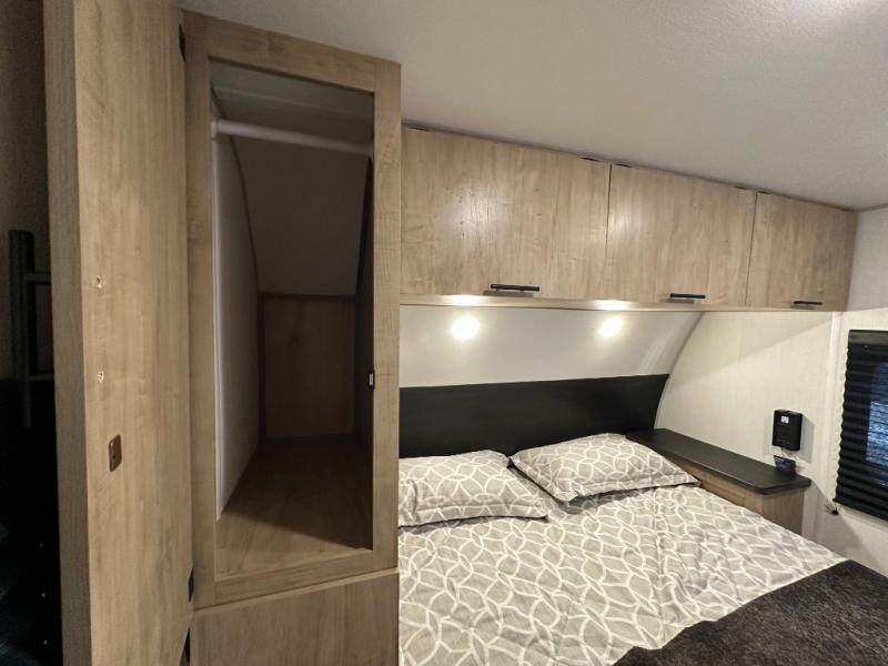 You'll love every minute spent in this single slide out travel trailer, whether you're cooking dinner on the outside kitchen or in the rear kitchen, relaxing on the sofa across from the fireplace, or sleeping on the RV king bed in the front master bedroom! There are hidden shelves behind the fireplace for convenient storage, and the booth dinette within the slide provides a place to dine together. The walk-thru bath is spacious, and includes a tub/shower, toilet, and sink with counter space.