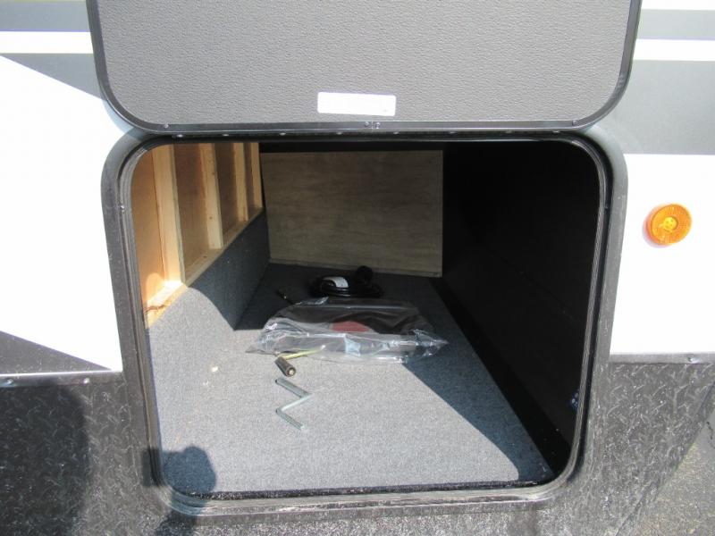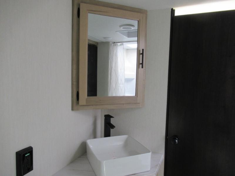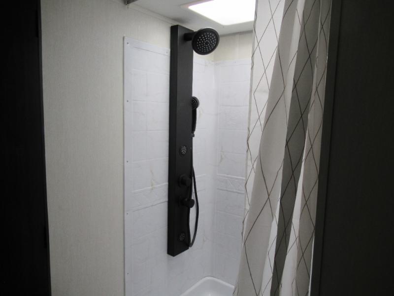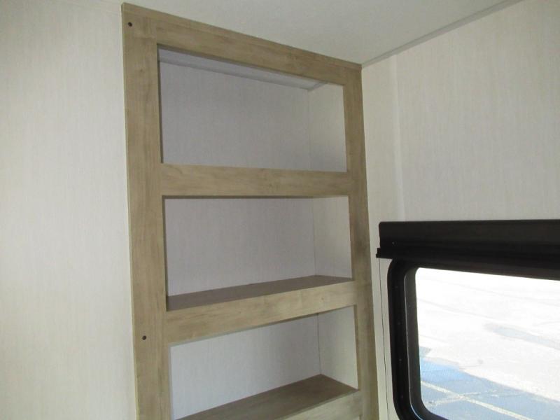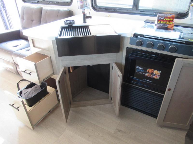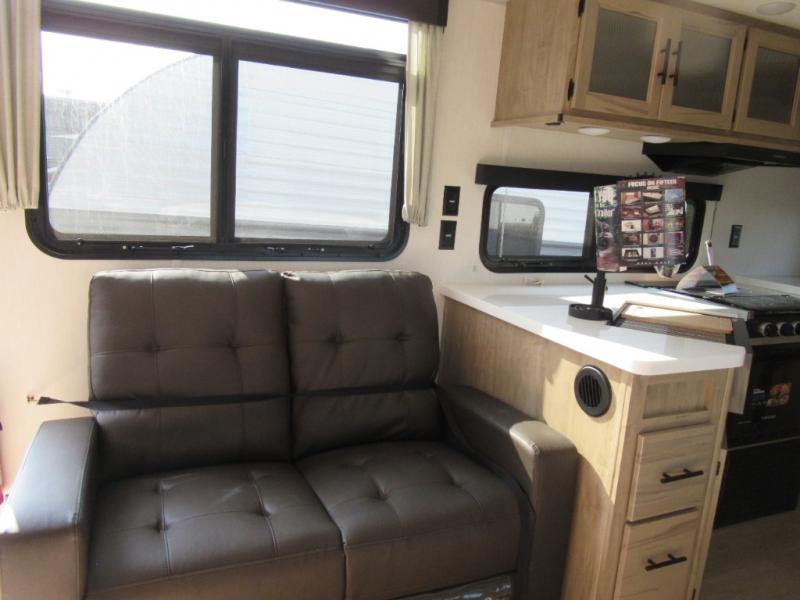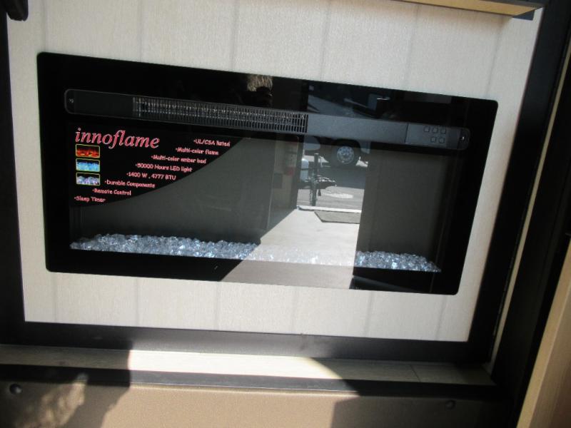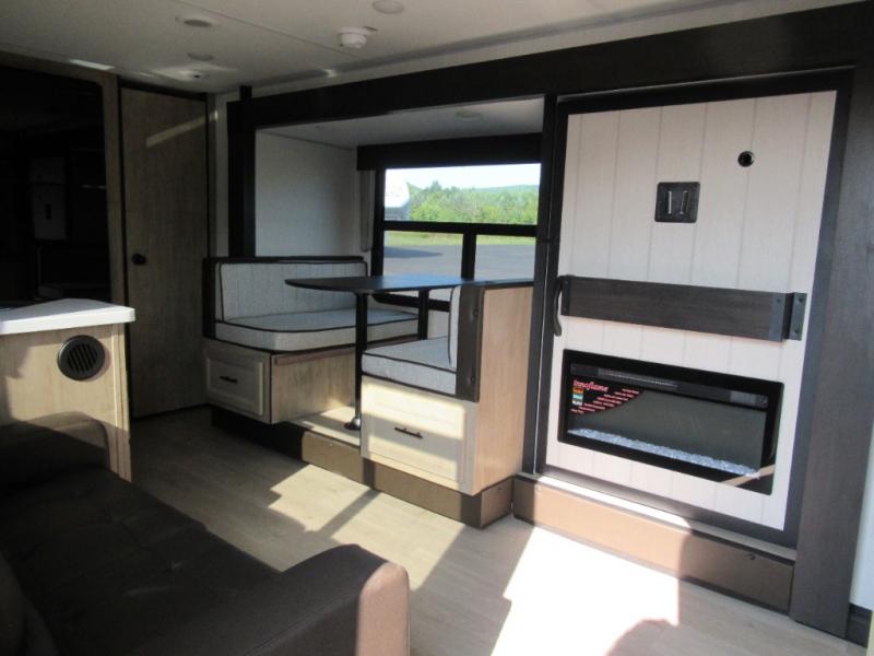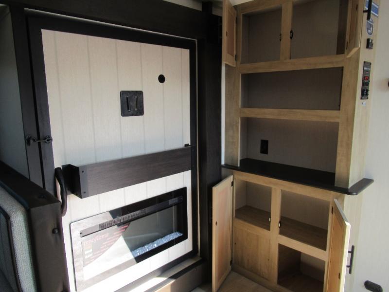 You'll love every minute spent in this single slide out travel trailer, whether you're cooking dinner on the outside kitchen or in the rear kitchen, relaxing on the sofa across from the fireplace, or sleeping on the RV king bed in the front master bedroom! There is a hidden pantry behind the fireplace for convenient storage, and the booth dinette within the slide provides a place to dine together. The walk-thru bath is spacious, and includes a tub/shower, toilet, and sink with counter space.