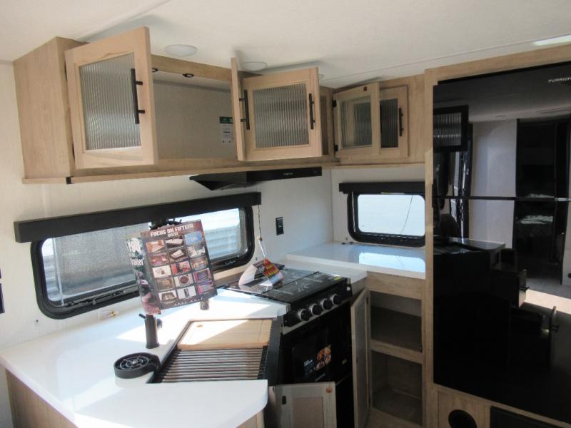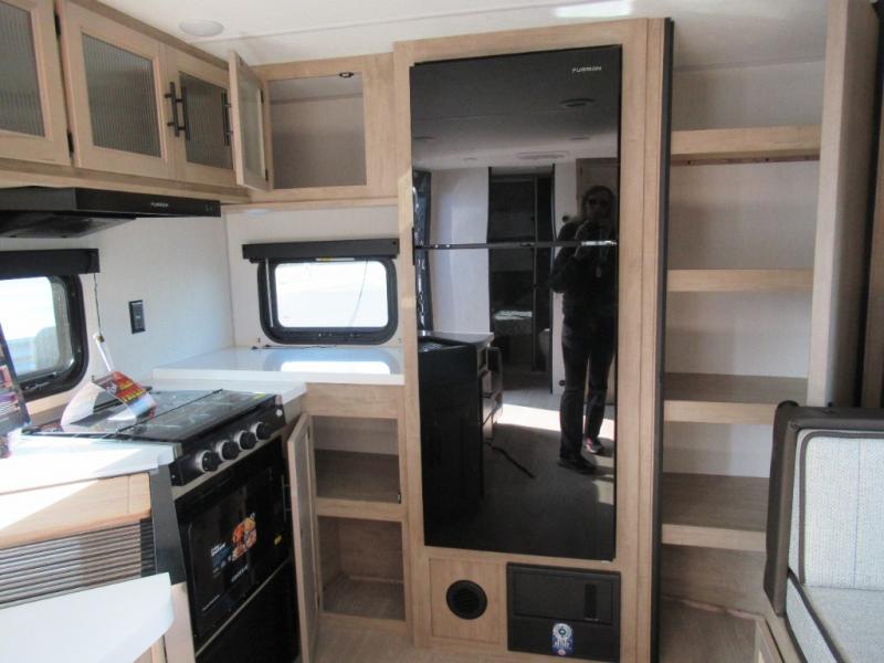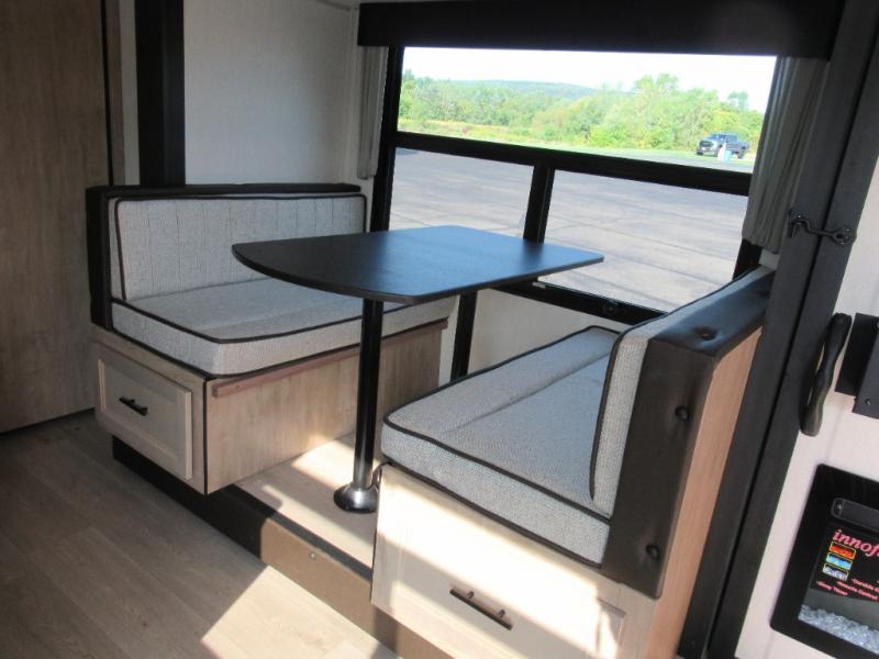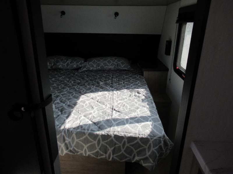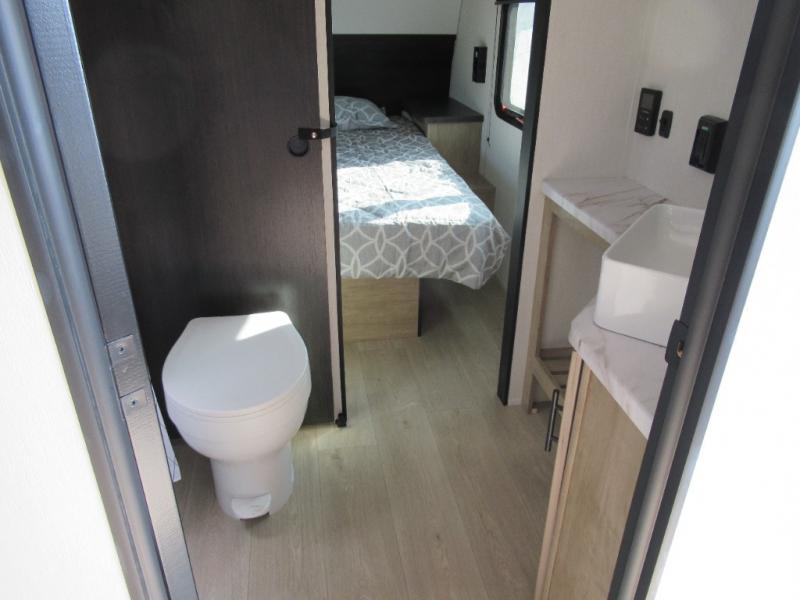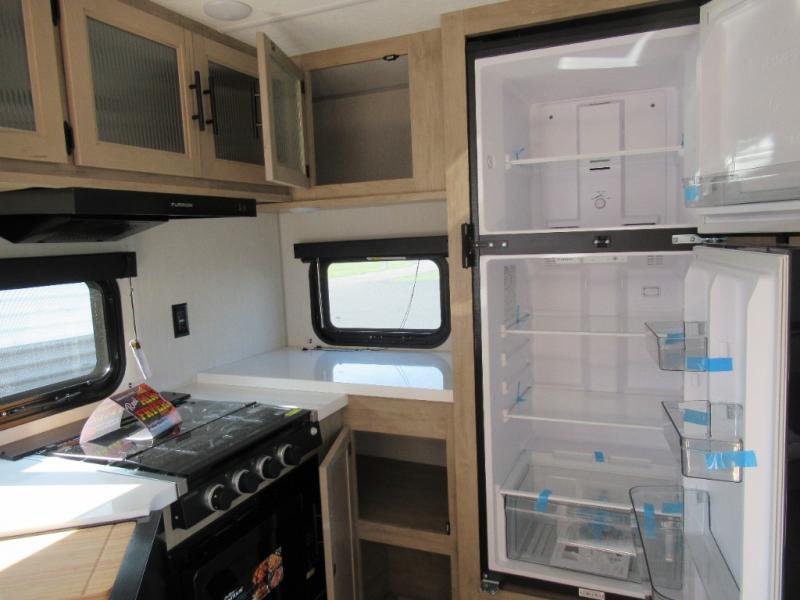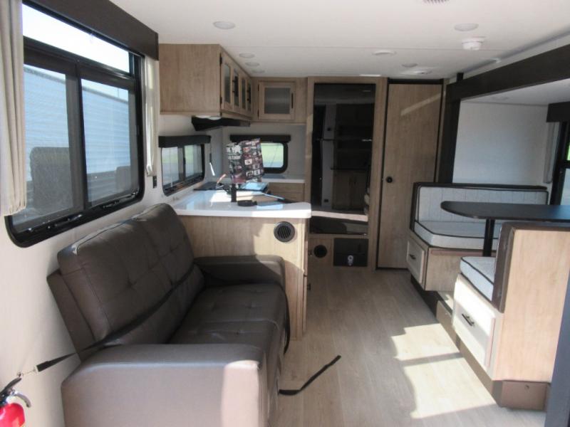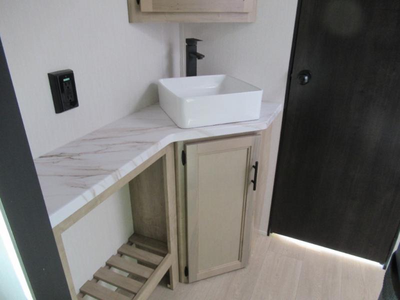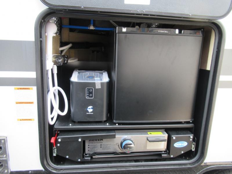 You'll love every minute spent in this single slide out travel trailer, whether you're cooking dinner on the outside kitchen or in the rear kitchen, relaxing on the sofa across from the fireplace, or sleeping on the RV king bed in the front master bedroom! There is a hidden pantry behind the fireplace for convenient storage, and the booth dinette within the slide provides a place to dine together. The walk-thru bath is spacious, and includes a tub/shower, toilet, and sink with counter space.