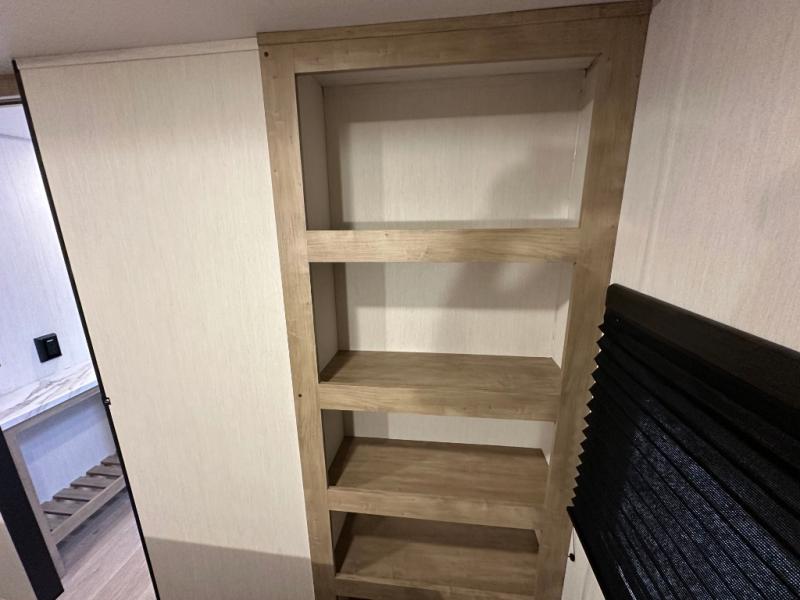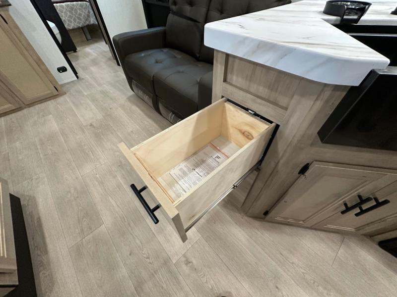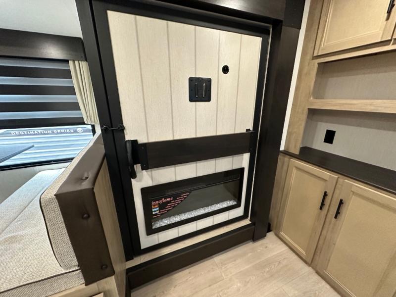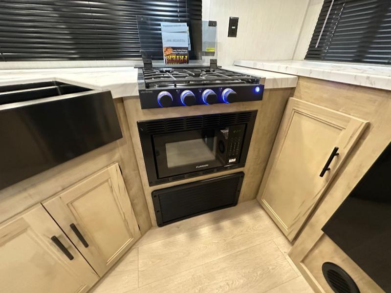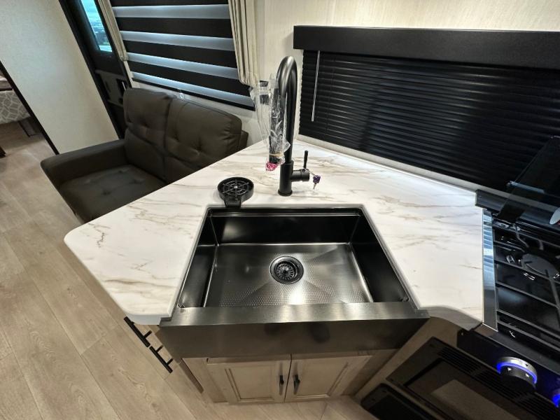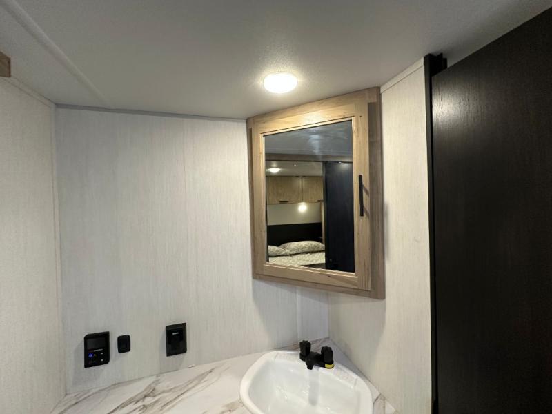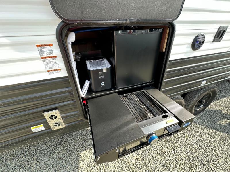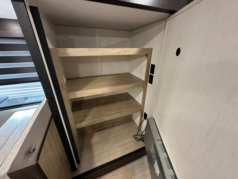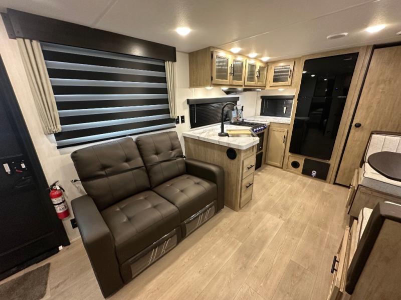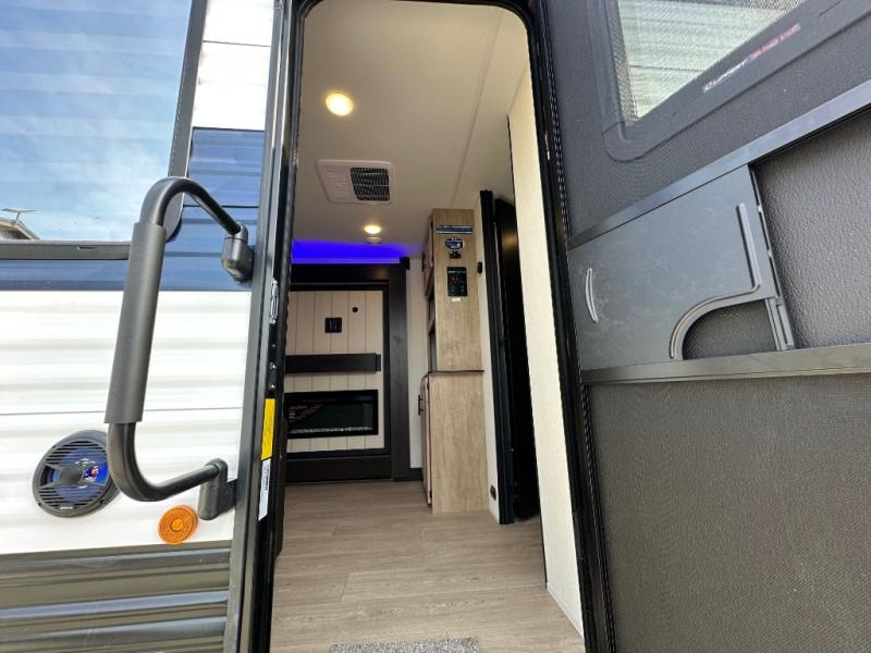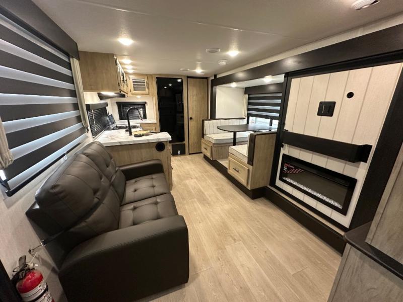 You'll love every minute spent in this single slide out travel trailer, whether you're cooking dinner on the outside kitchen or in the rear kitchen, relaxing on the sofa across from the fireplace, or sleeping on the RV king bed in the front master bedroom! There are hidden shelves behind the fireplace for convenient storage, and the booth dinette within the slide provides a place to dine together. The walk-thru bath is spacious, and includes a tub/shower, toilet, and sink with counter space.