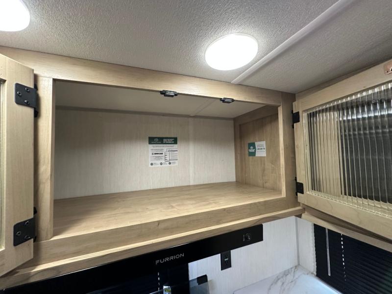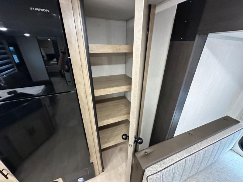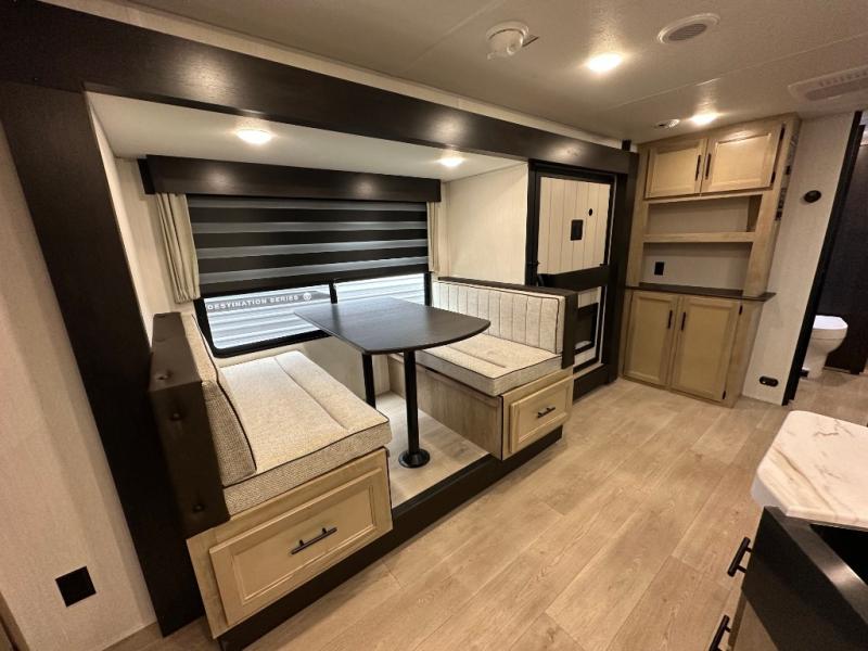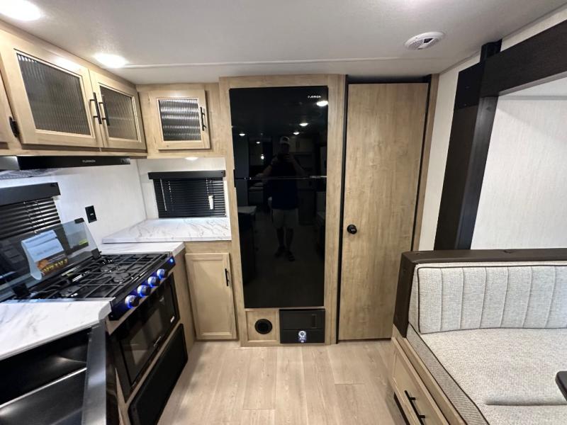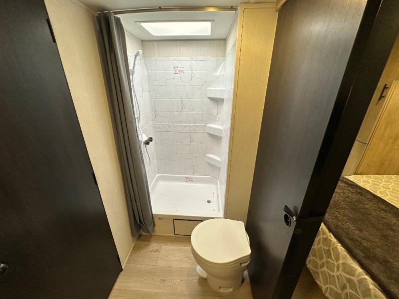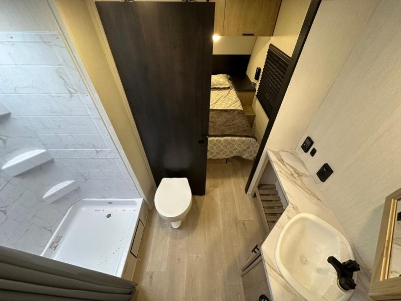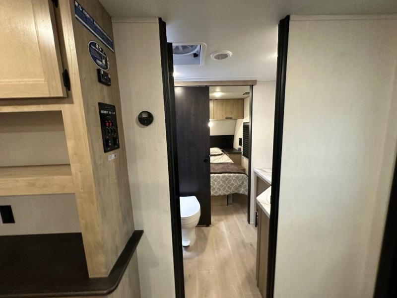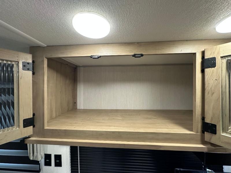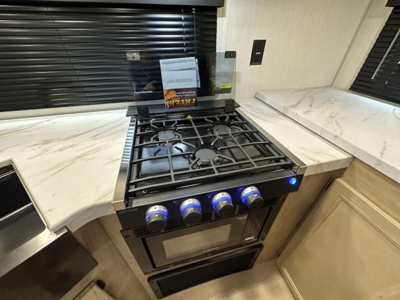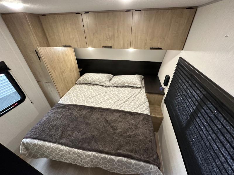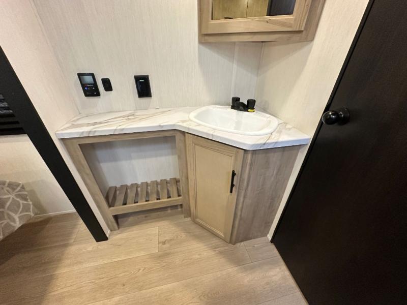 You'll love every minute spent in this single slide out travel trailer, whether you're cooking dinner on the outside kitchen or in the rear kitchen, relaxing on the sofa across from the fireplace, or sleeping on the RV king bed in the front master bedroom! There are hidden shelves behind the fireplace for convenient storage, and the booth dinette within the slide provides a place to dine together. The walk-thru bath is spacious, and includes a tub/shower, toilet, and sink with counter space.