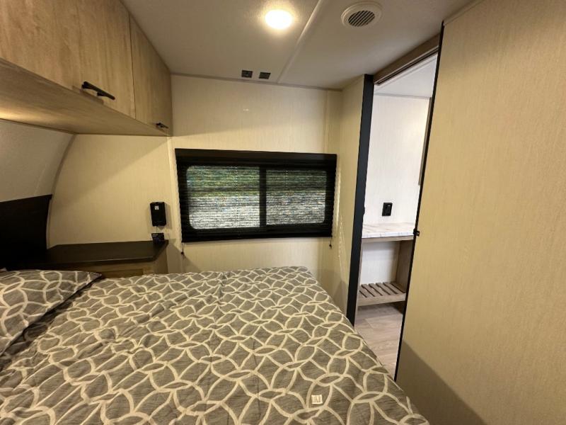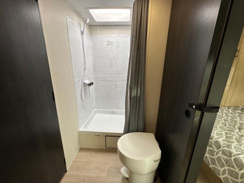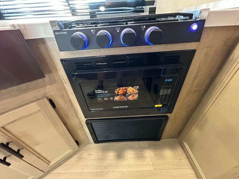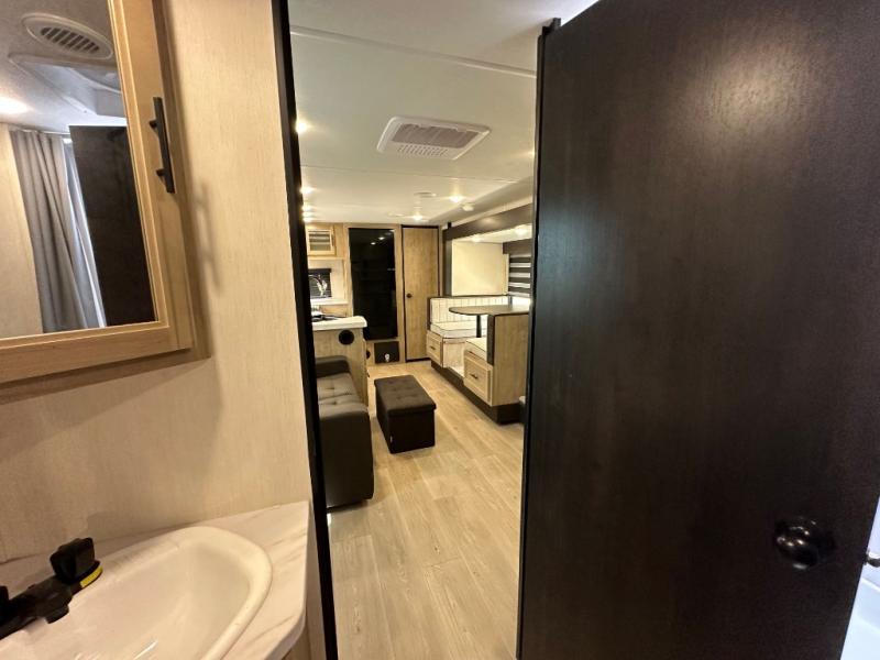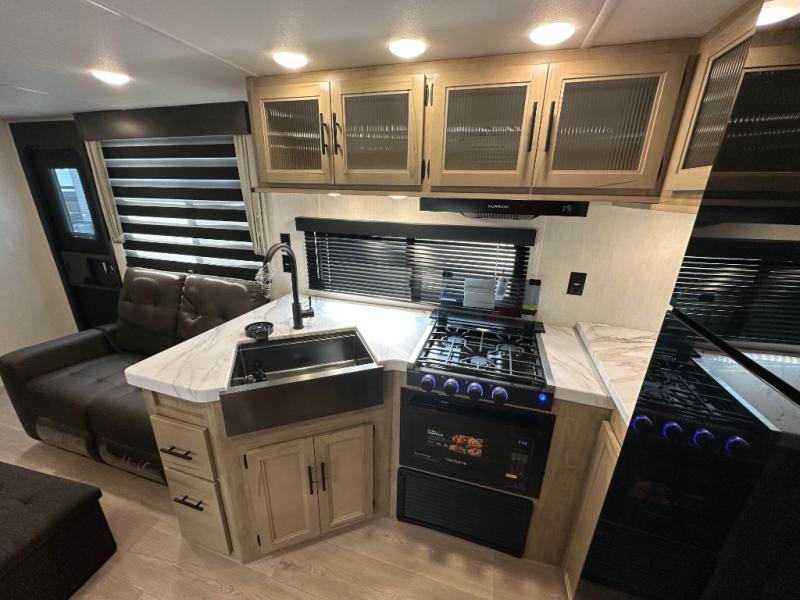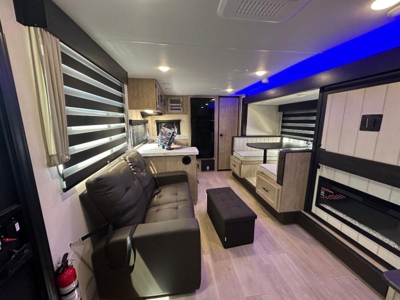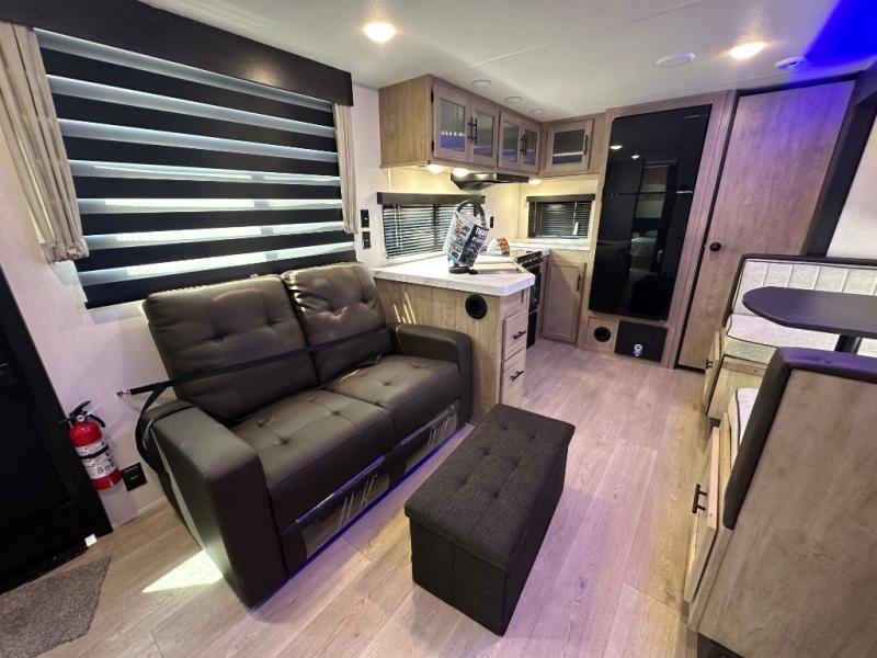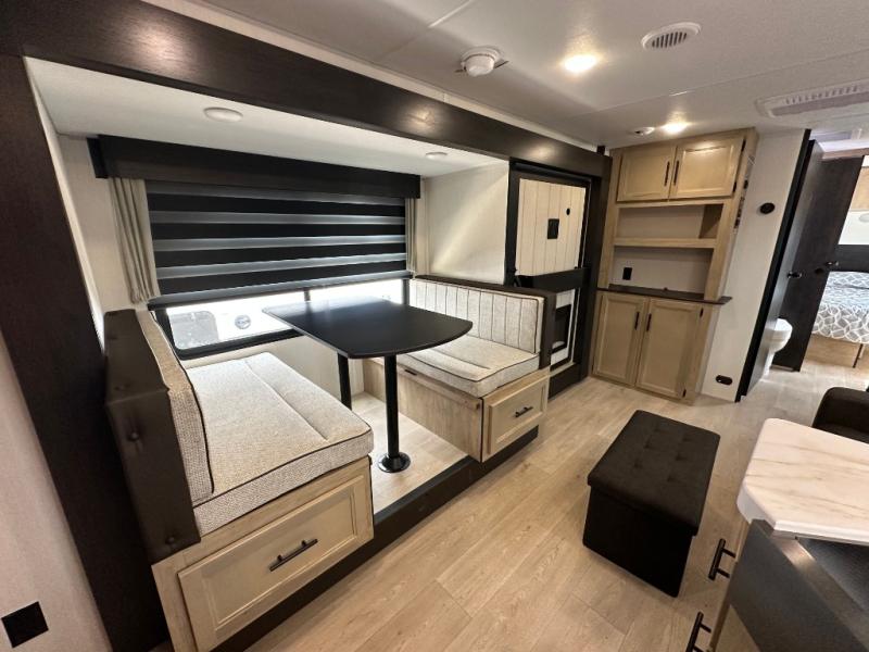 You'll love every minute spent in this single slide out travel trailer, whether you're cooking dinner on the outside kitchen or in the rear kitchen, relaxing on the sofa across from the fireplace, or sleeping on the RV king bed in the front master bedroom! There are hidden shelves behind the fireplace for convenient storage, and the booth dinette within the slide provides a place to dine together. The walk-thru bath is spacious, and includes a tub/shower, toilet, and sink with counter space.