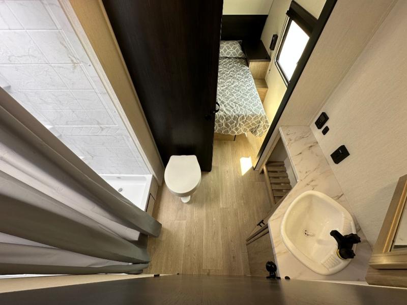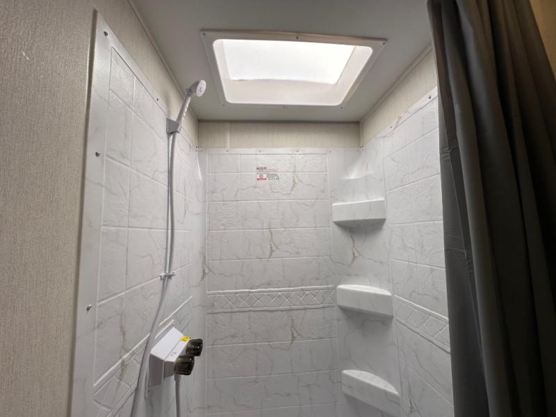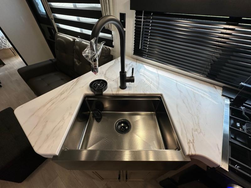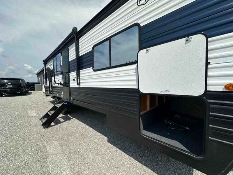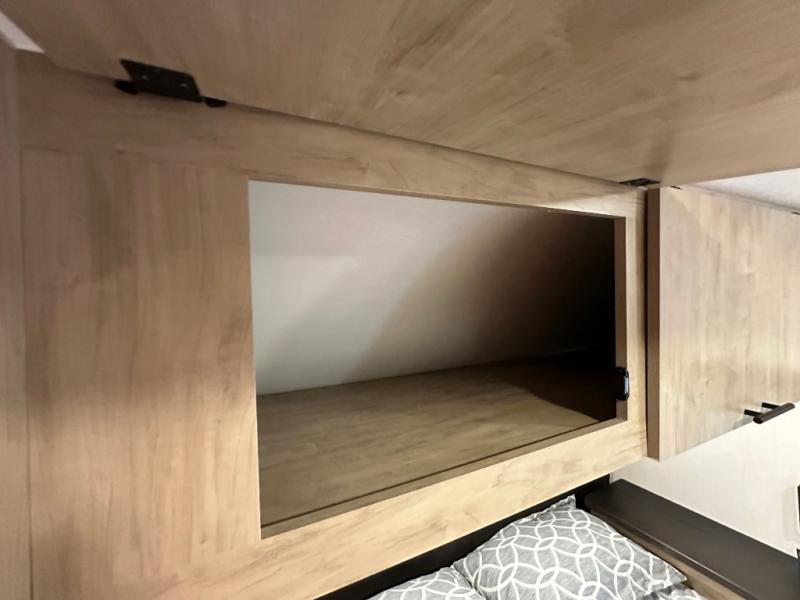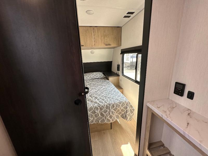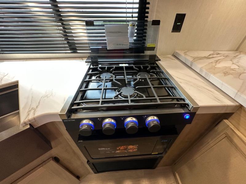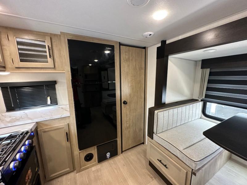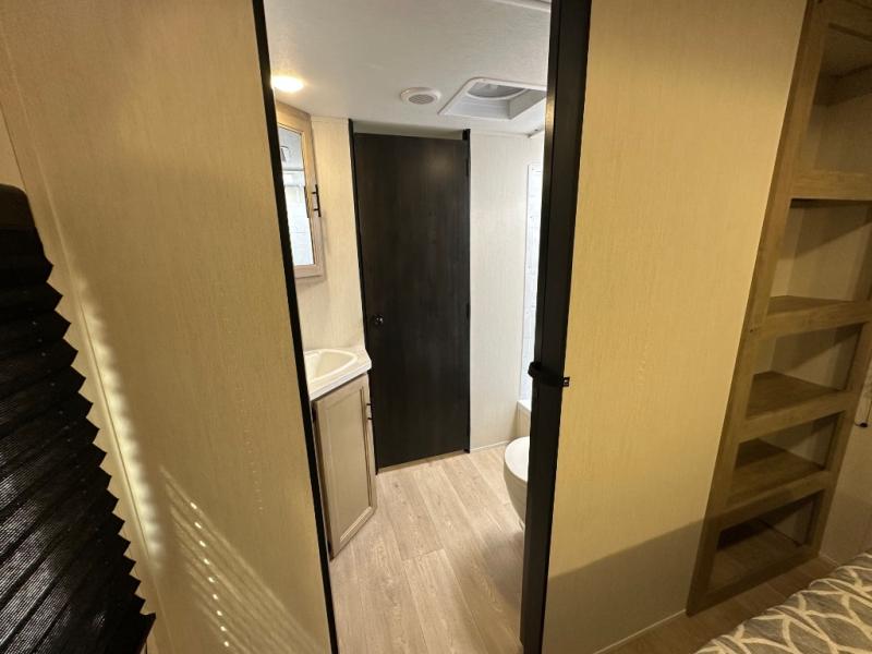 You'll love every minute spent in this single slide out travel trailer, whether you're cooking dinner on the outside kitchen or in the rear kitchen, relaxing on the sofa across from the fireplace, or sleeping on the RV king bed in the front master bedroom! There are hidden shelves behind the fireplace for convenient storage, and the booth dinette within the slide provides a place to dine together. The walk-thru bath is spacious, and includes a tub/shower, toilet, and sink with counter space.
