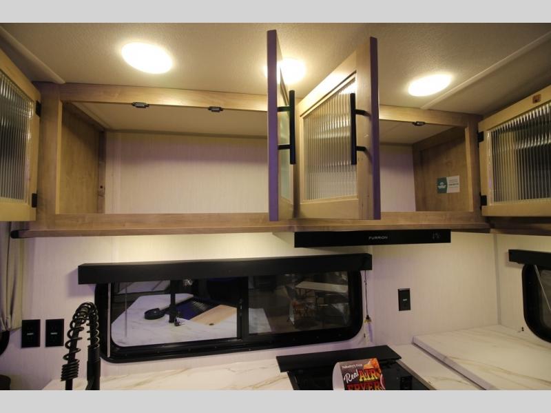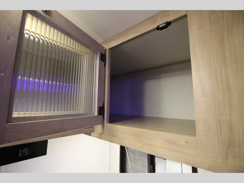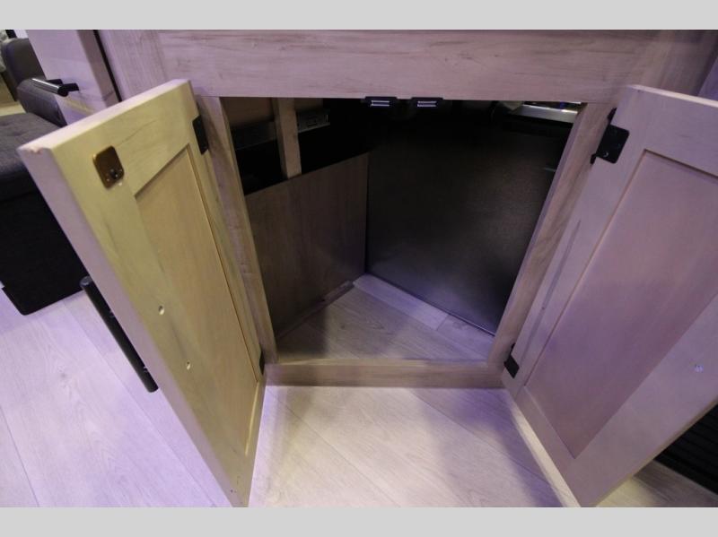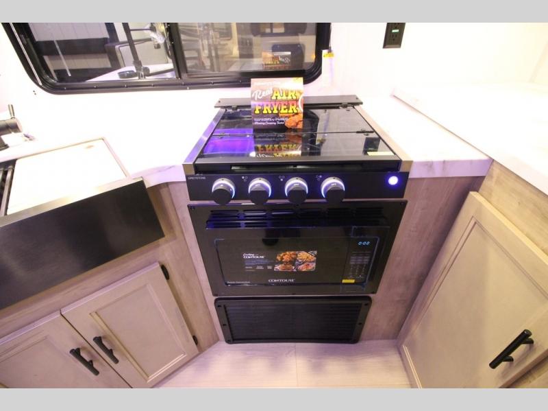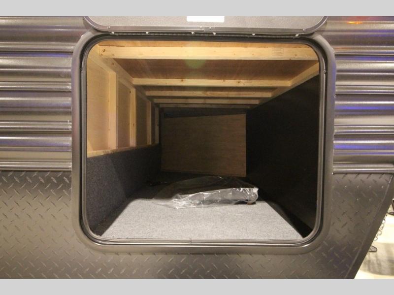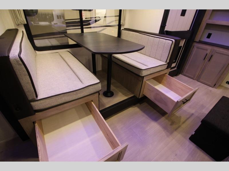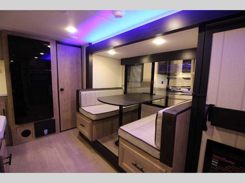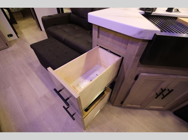 You'll love every minute spent in this single slide out travel trailer, whether you're cooking dinner on the outside kitchen or in the rear kitchen, relaxing on the sofa across from the fireplace, or sleeping on the RV king bed in the front master bedroom! There is a hidden pantry behind the fireplace for convenient storage, and the booth dinette within the slide provides a place to dine together. The walk-thru bath is spacious, and includes a tub/shower, toilet, and sink with counter space.