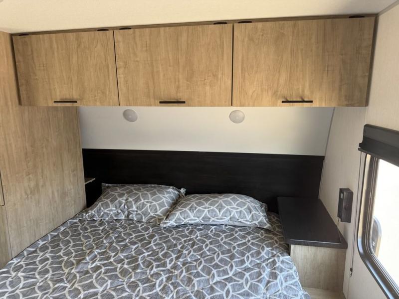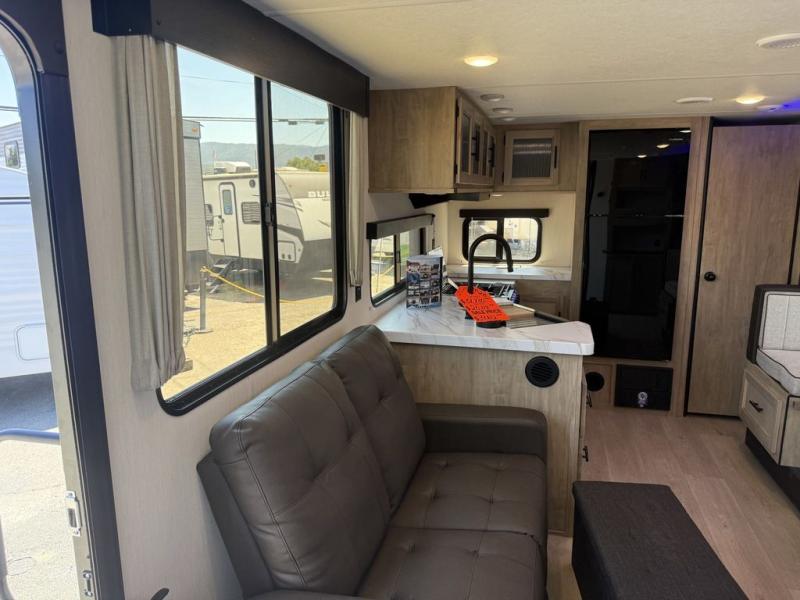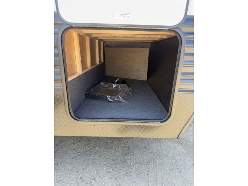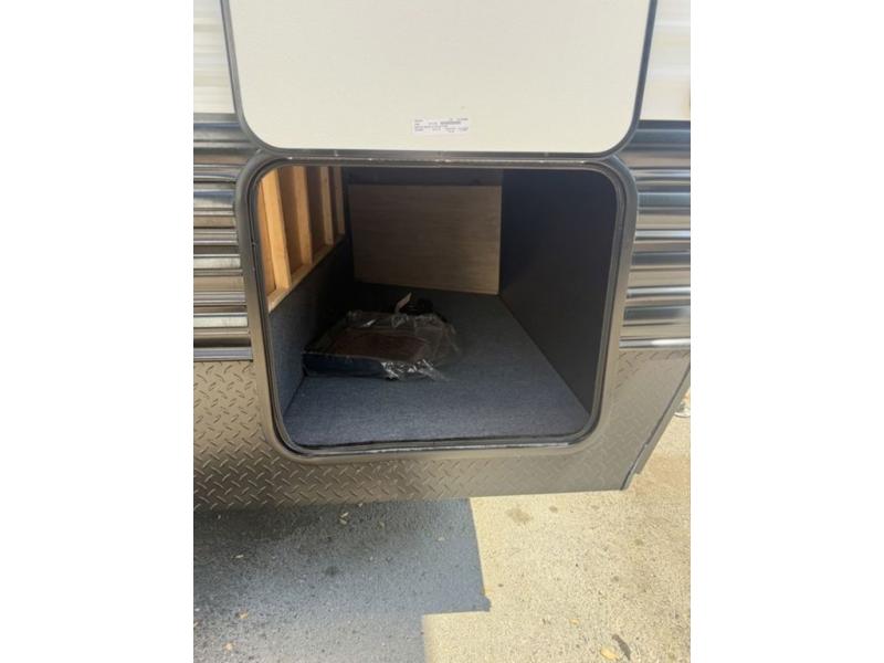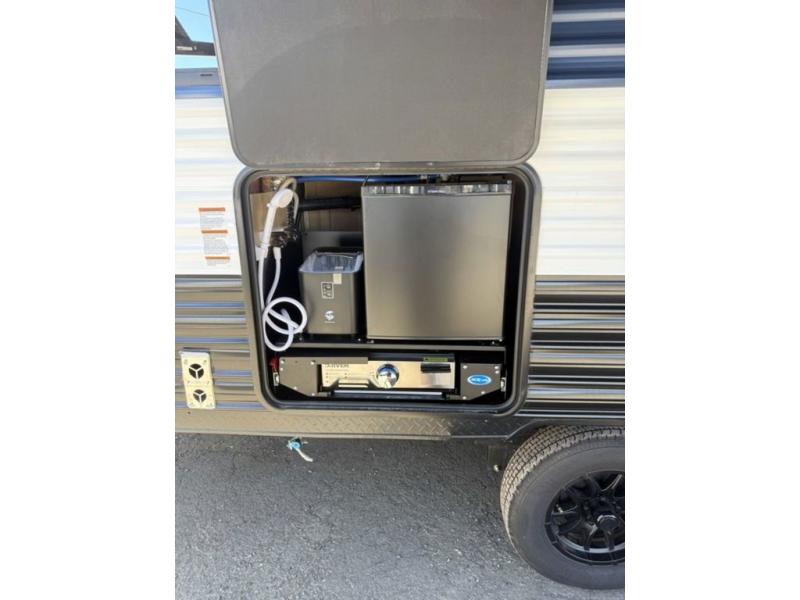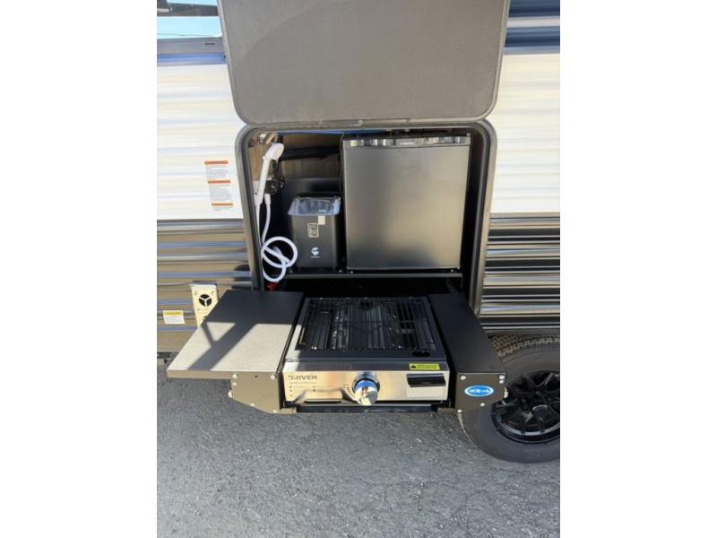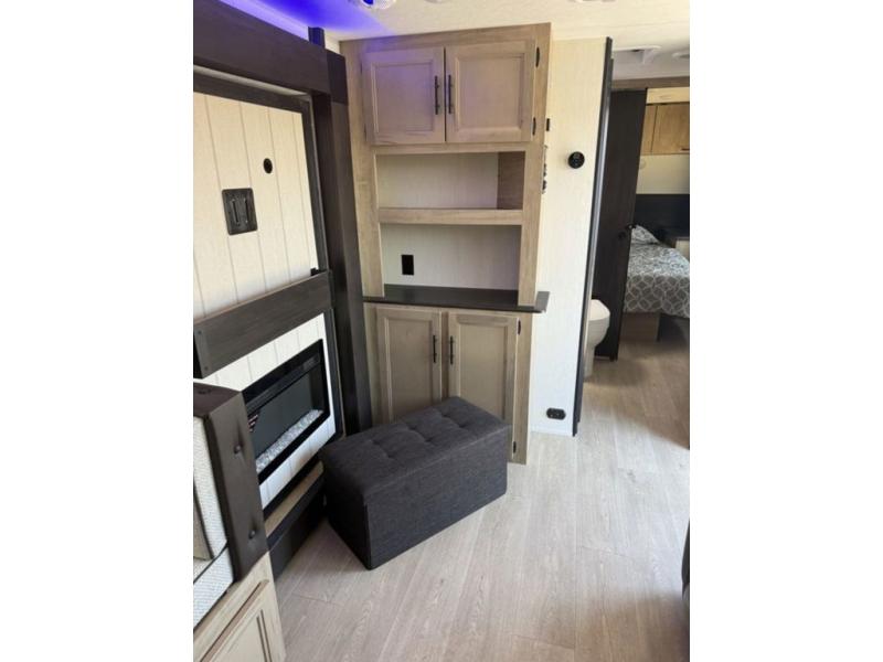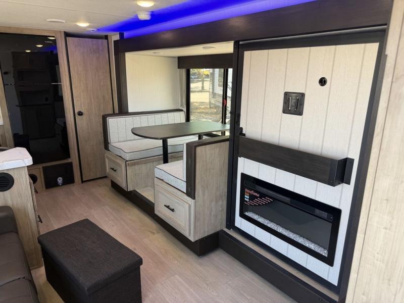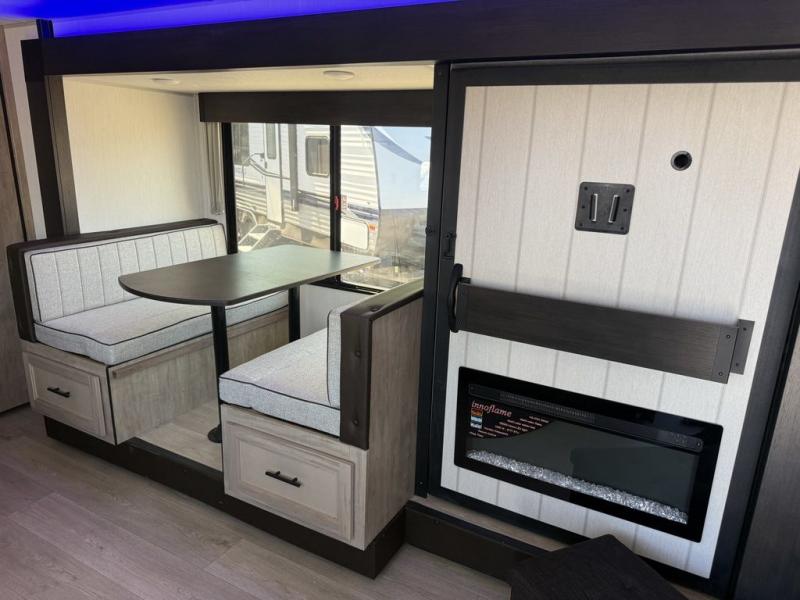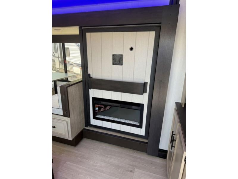 You'll love every minute spent in this single slide out travel trailer, whether you're cooking dinner on the outside kitchen or in the rear kitchen, relaxing on the sofa across from the fireplace, or sleeping on the RV king bed in the front master bedroom! There is a hidden pantry behind the fireplace for convenient storage, and the booth dinette within the slide provides a place to dine together. The walk-thru bath is spacious, and includes a tub/shower, toilet, and sink with counter space.