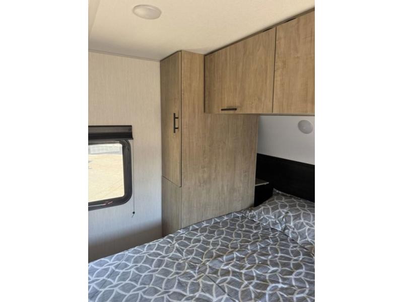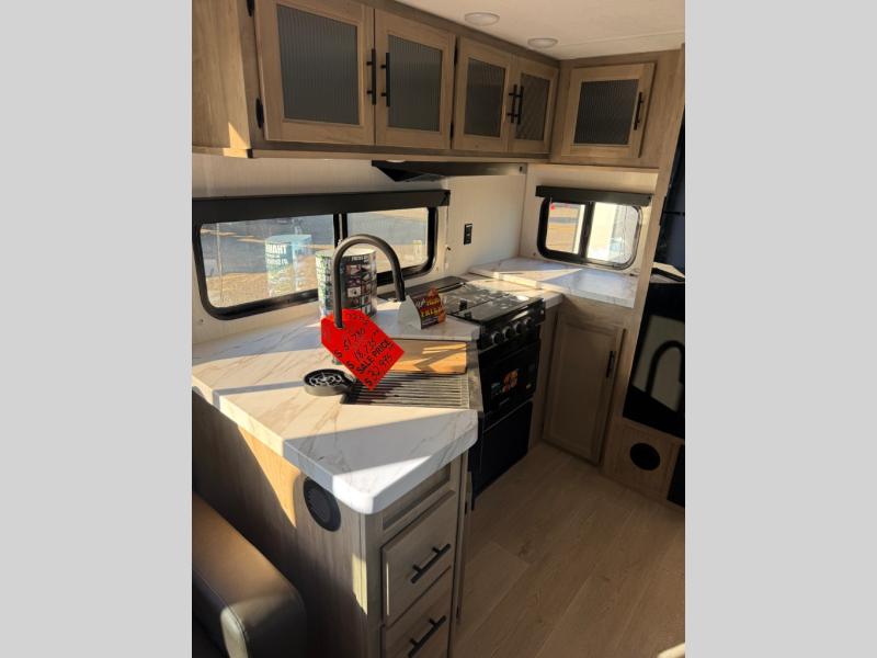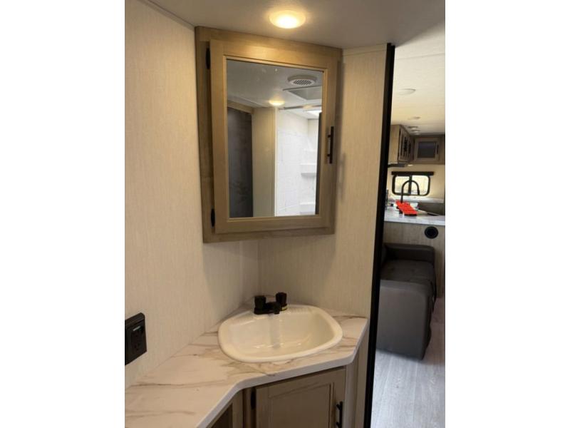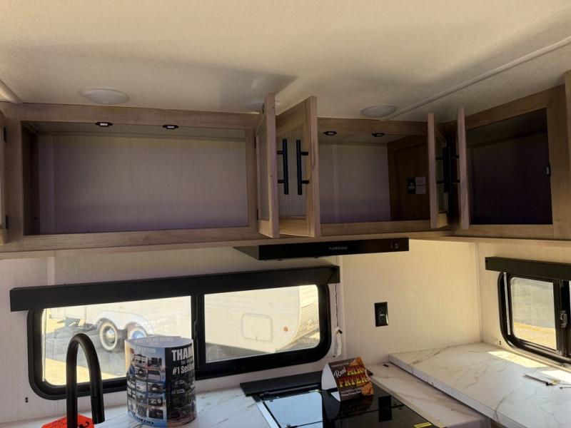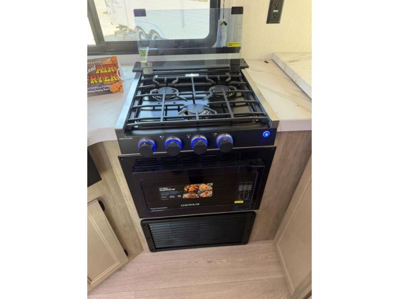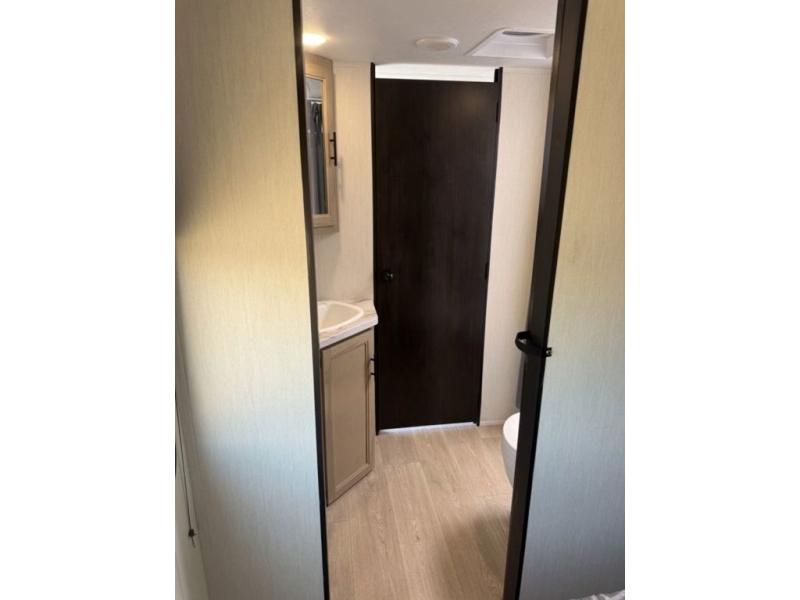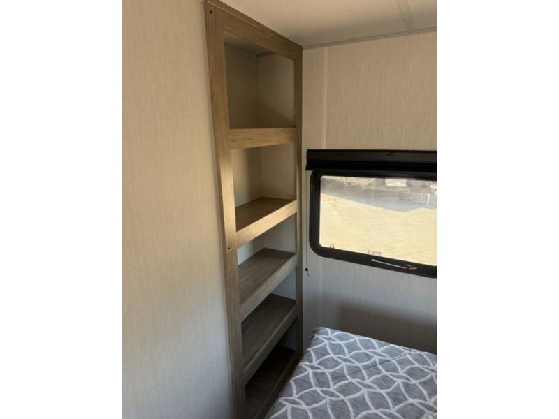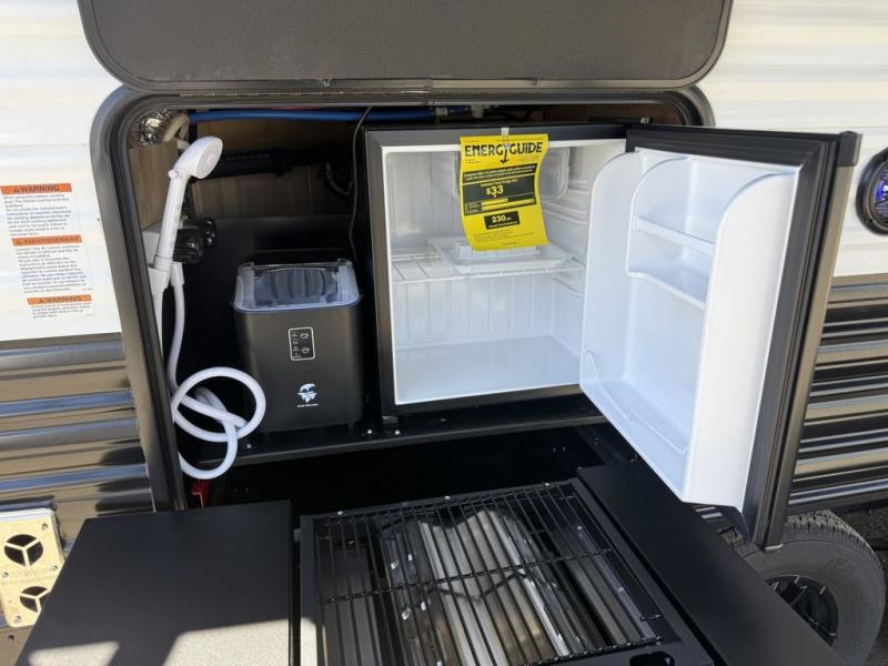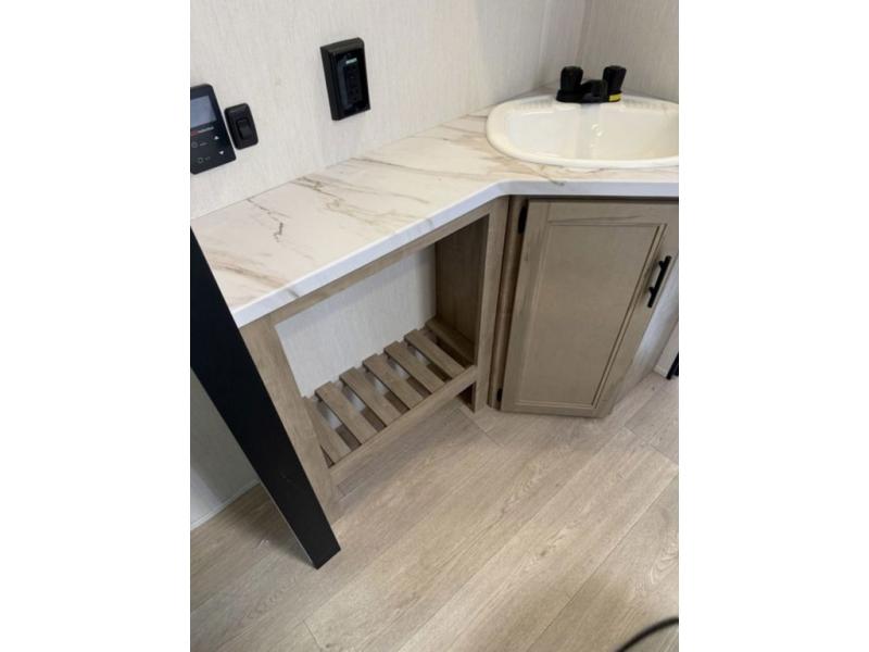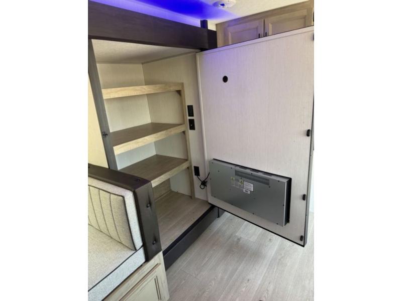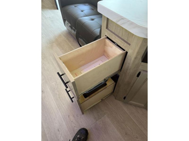 You'll love every minute spent in this single slide out travel trailer, whether you're cooking dinner on the outside kitchen or in the rear kitchen, relaxing on the sofa across from the fireplace, or sleeping on the RV king bed in the front master bedroom! There is a hidden pantry behind the fireplace for convenient storage, and the booth dinette within the slide provides a place to dine together. The walk-thru bath is spacious, and includes a tub/shower, toilet, and sink with counter space.
