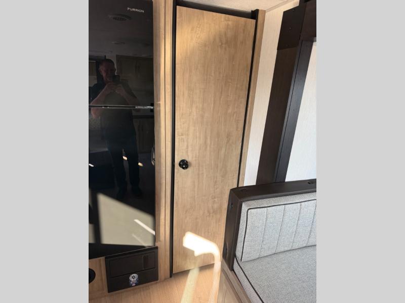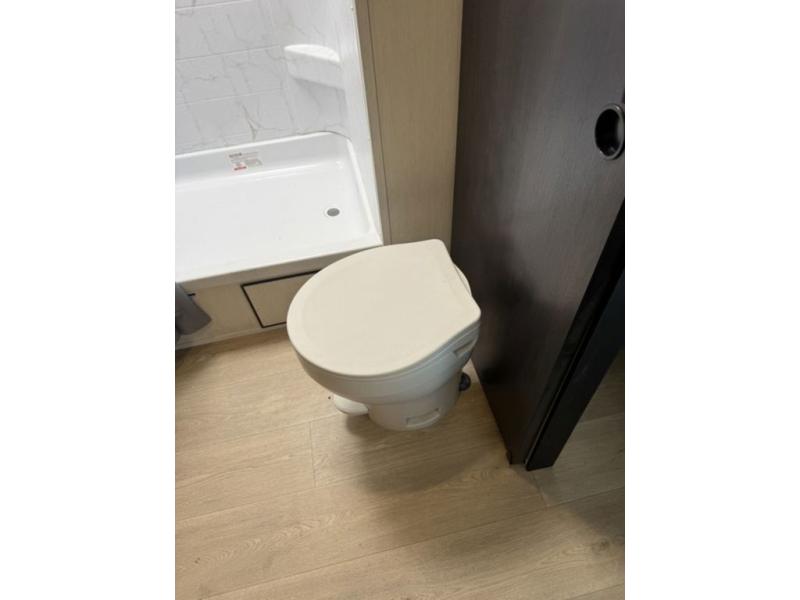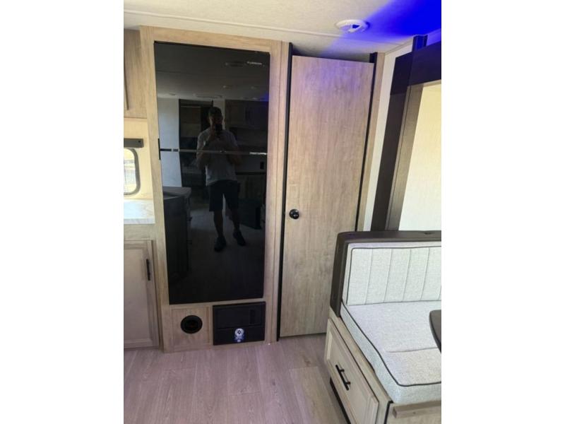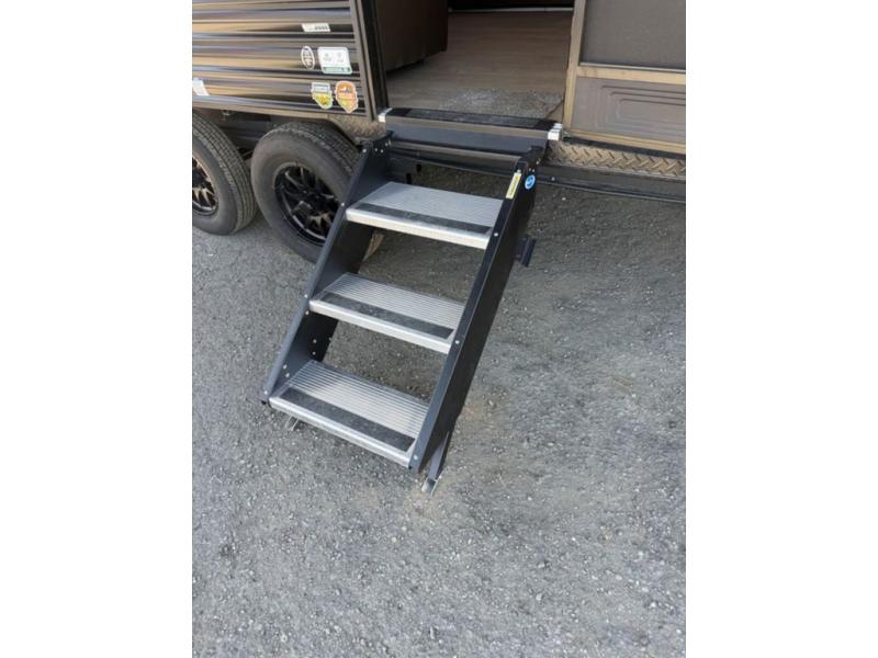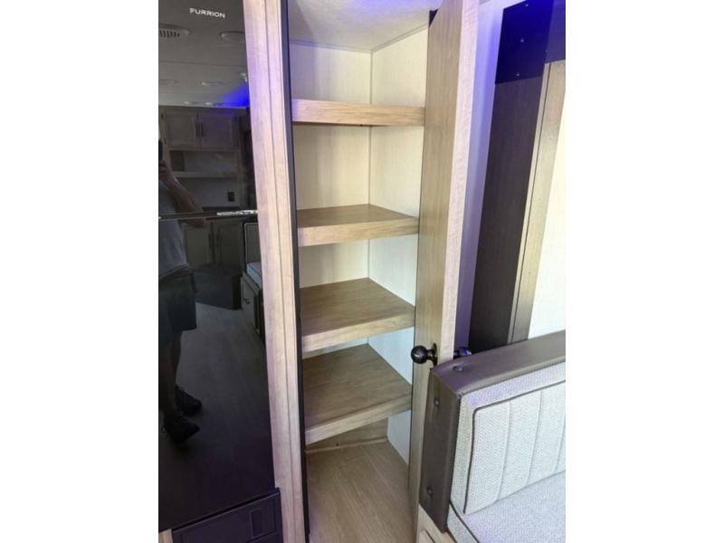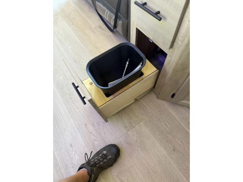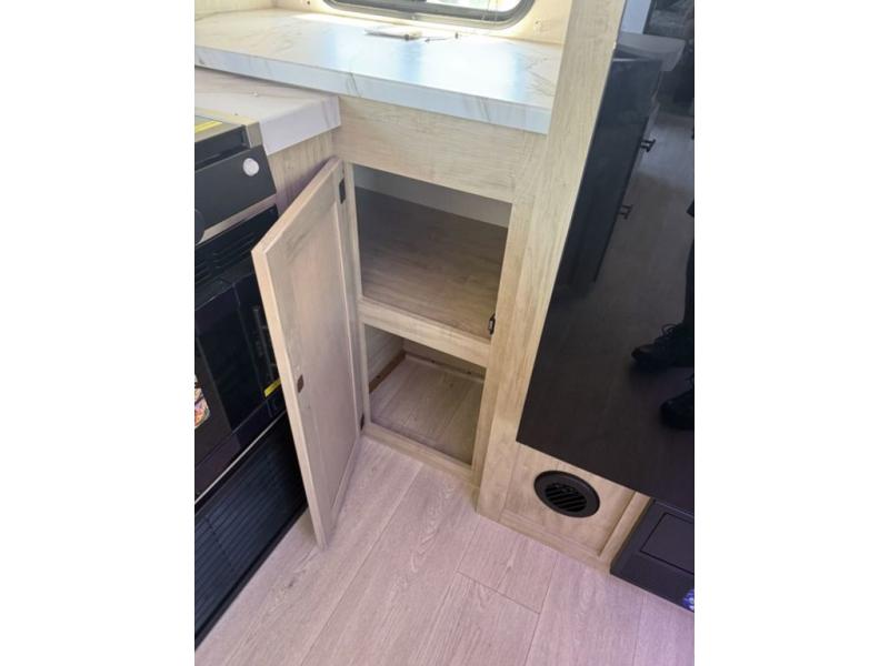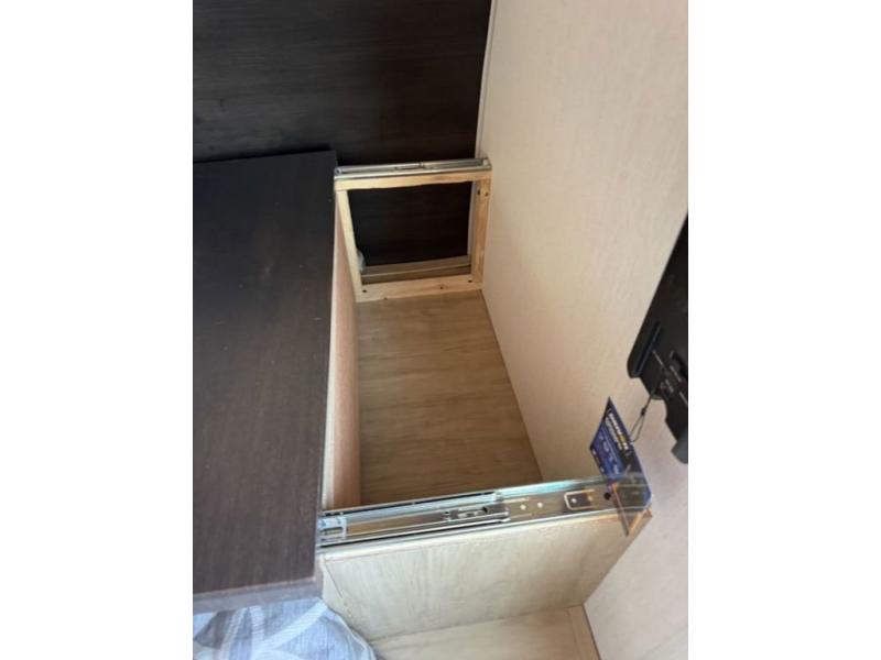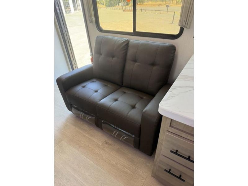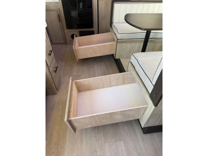 You'll love every minute spent in this single slide out travel trailer, whether you're cooking dinner on the outside kitchen or in the rear kitchen, relaxing on the sofa across from the fireplace, or sleeping on the RV king bed in the front master bedroom! There is a hidden pantry behind the fireplace for convenient storage, and the booth dinette within the slide provides a place to dine together. The walk-thru bath is spacious, and includes a tub/shower, toilet, and sink with counter space.