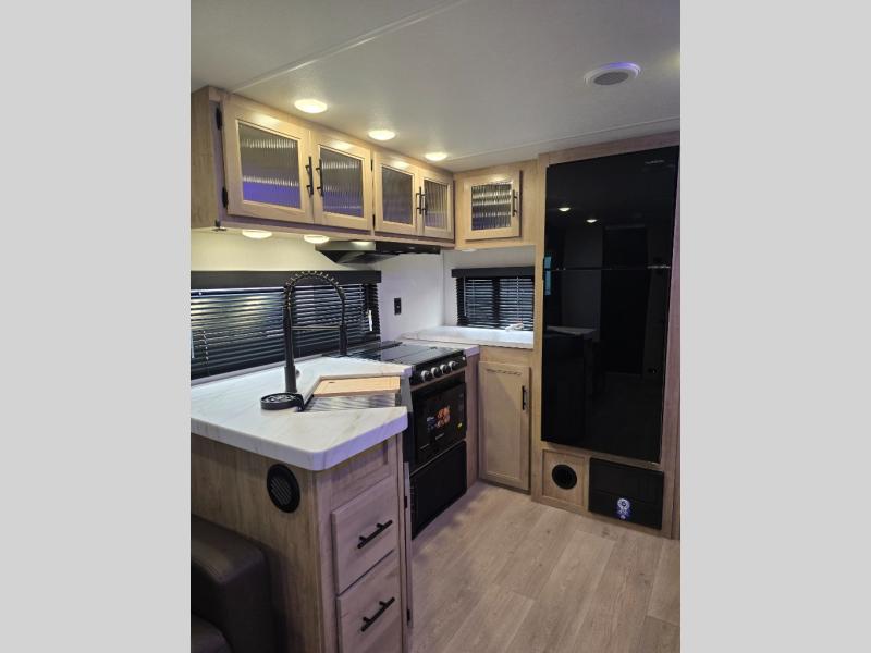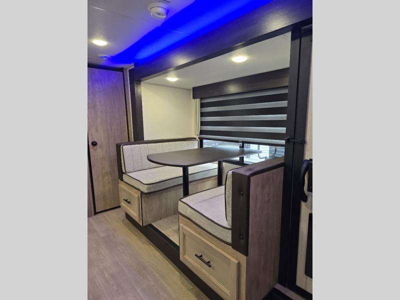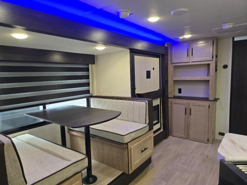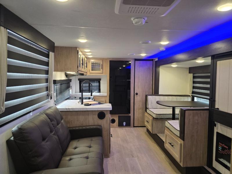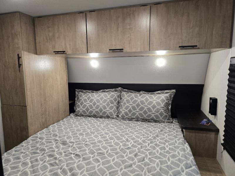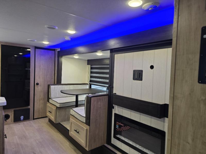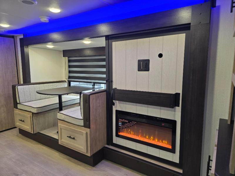 You'll love every minute spent in this single slide out travel trailer, whether you're cooking dinner on the outside kitchen or in the rear kitchen, relaxing on the sofa across from the fireplace, or sleeping on the RV king bed in the front master bedroom! There is a hidden pantry behind the fireplace for convenient storage, and the booth dinette within the slide provides a place to dine together. The walk-thru bath is spacious, and includes a tub/shower, toilet, and sink with counter space.