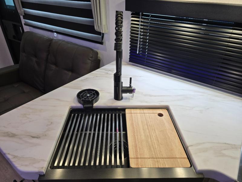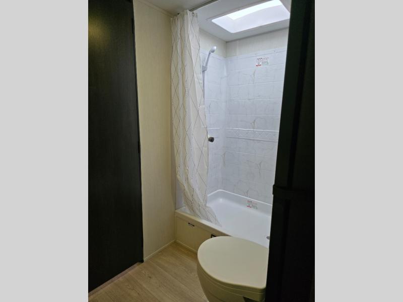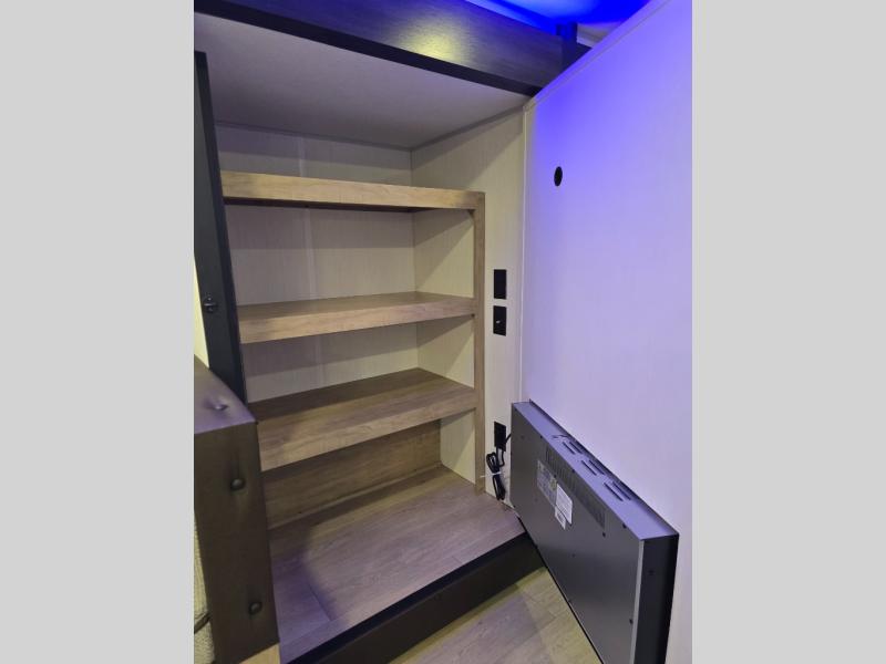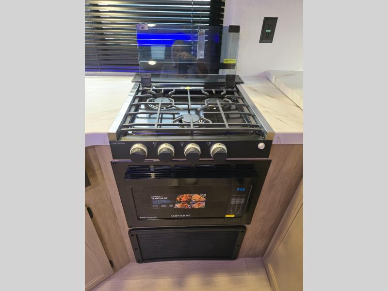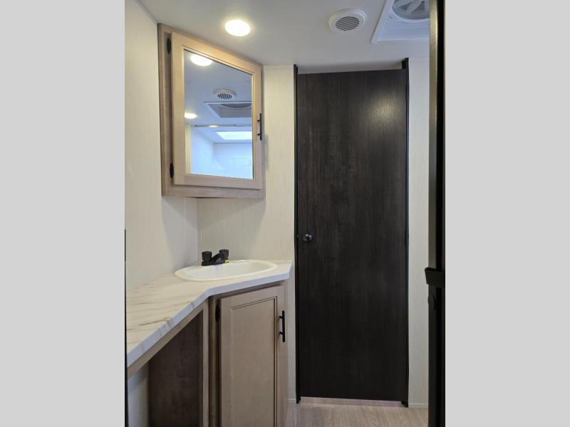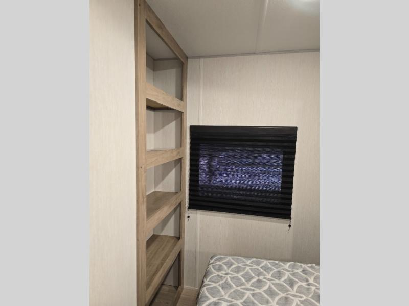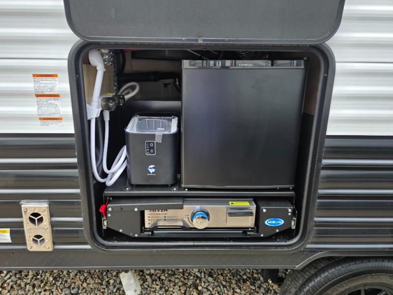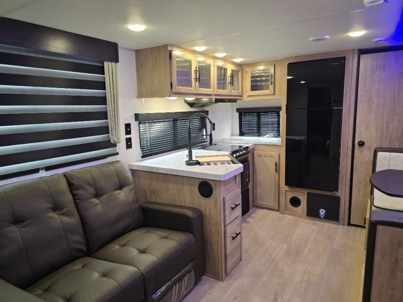You'll love every minute spent in this single slide out travel trailer, whether you're cooking dinner on the outside kitchen or in the rear kitchen, relaxing on the sofa across from the fireplace, or sleeping on the RV king bed in the front master bedroom! There is a hidden pantry behind the fireplace for convenient storage, and the booth dinette within the slide provides a place to dine together. The walk-thru bath is spacious, and includes a tub/shower, toilet, and sink with counter space.