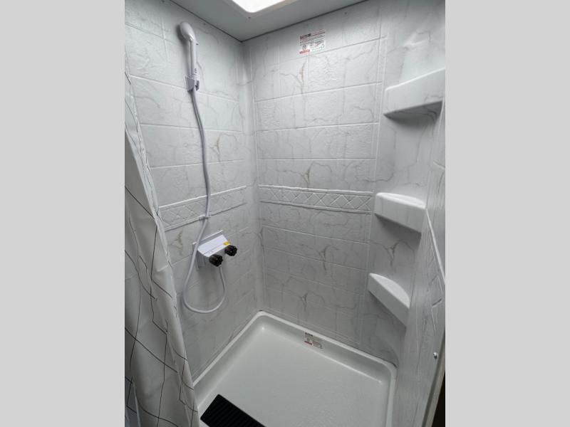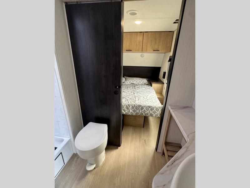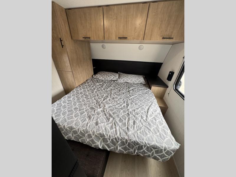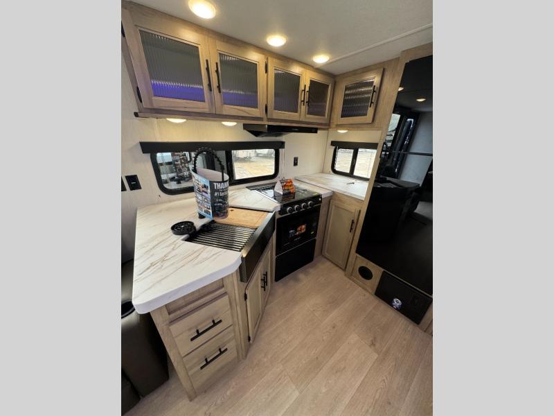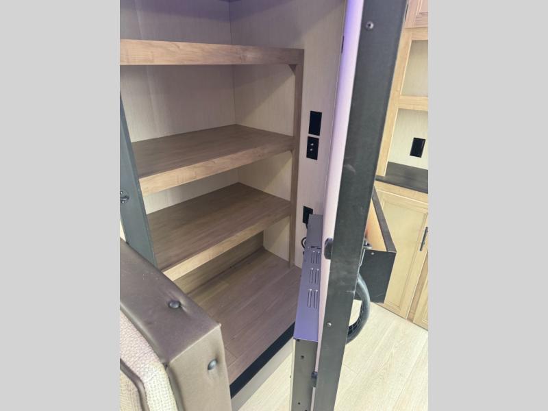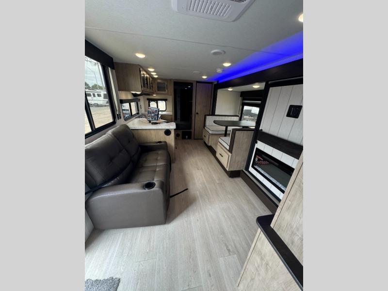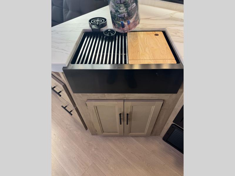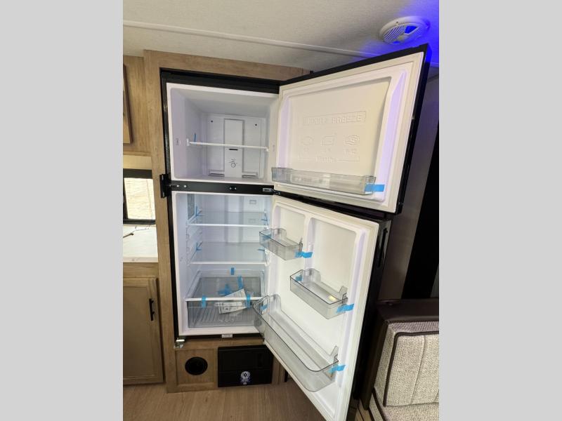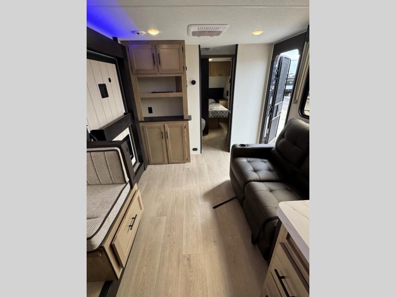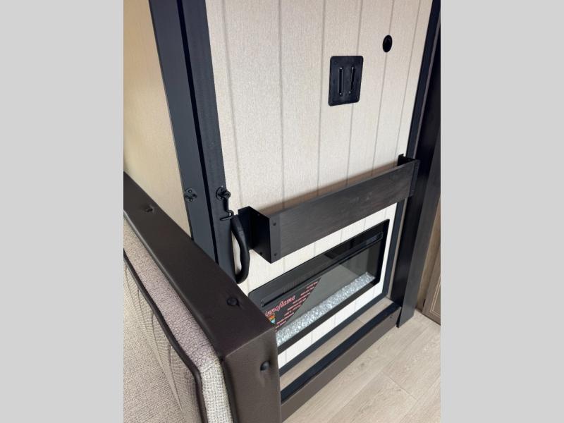 You'll love every minute spent in this single slide out travel trailer, whether you're cooking dinner on the outside kitchen or in the rear kitchen, relaxing on the sofa across from the fireplace, or sleeping on the RV king bed in the front master bedroom! There is a hidden pantry behind the fireplace for convenient storage, and the booth dinette within the slide provides a place to dine together. The walk-thru bath is spacious, and includes a tub/shower, toilet, and sink with counter space.