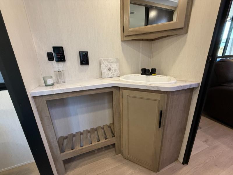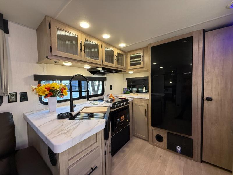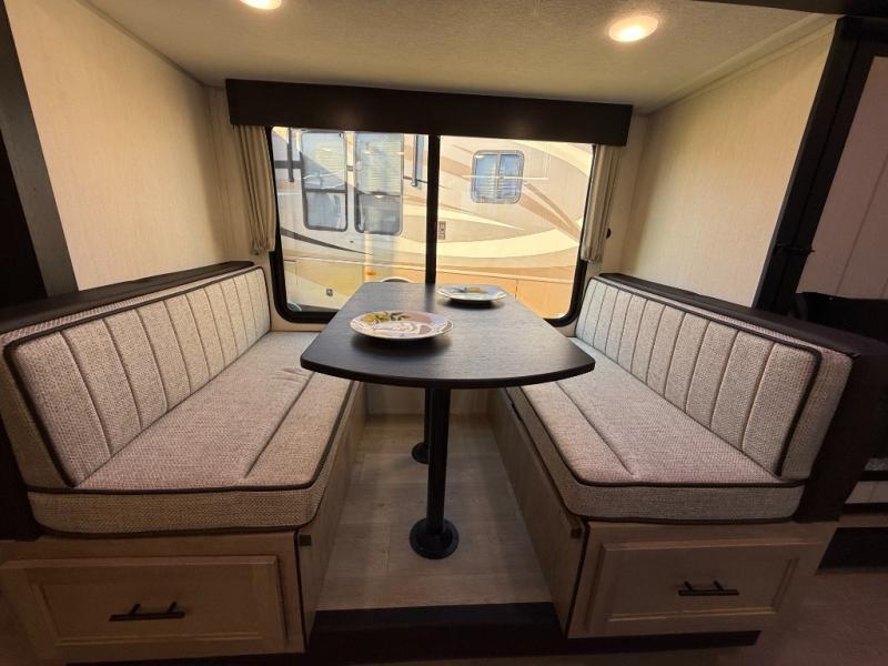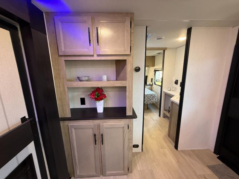You'll love every minute spent in this single slide out travel trailer, whether you're cooking dinner on the outside kitchen or in the rear kitchen, relaxing on the sofa across from the fireplace, or sleeping on the RV king bed in the front master bedroom! There is a hidden pantry behind the fireplace for convenient storage, and the booth dinette within the slide provides a place to dine together. The walk-thru bath is spacious, and includes a tub/shower, toilet, and sink with counter space.