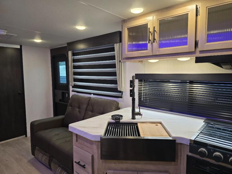 You'll love every minute spent in this single slide out travel trailer, whether you're cooking dinner on the outside kitchen or in the rear kitchen, relaxing on the sofa across from the fireplace, or sleeping on the RV king bed in the front master bedroom! There is a hidden pantry behind the fireplace for convenient storage, and the booth dinette within the slide provides a place to dine together. The walk-thru bath is spacious, and includes a tub/shower, toilet, and sink with counter space.