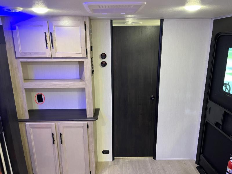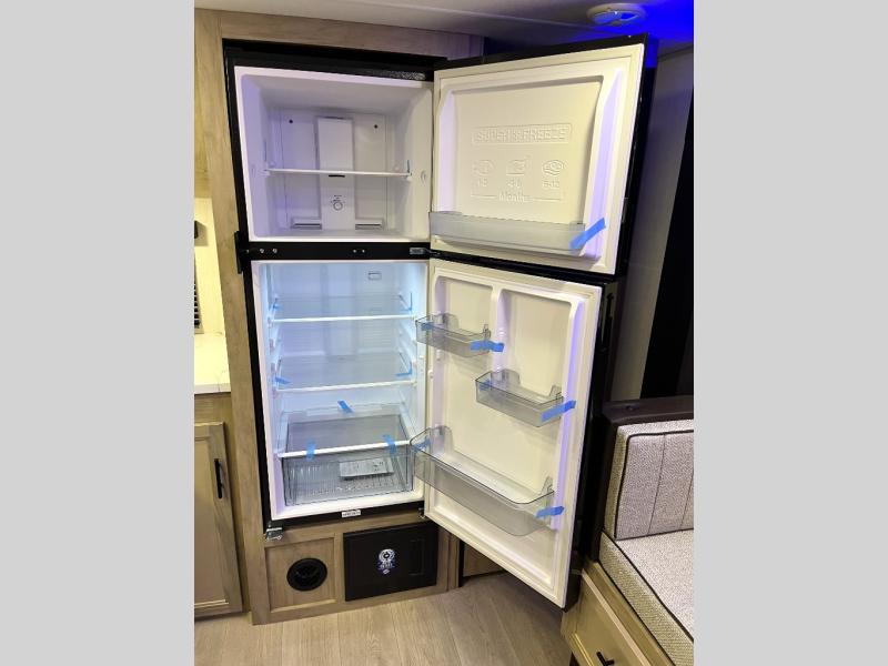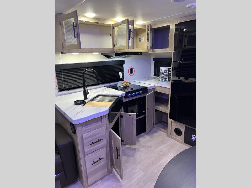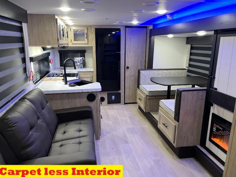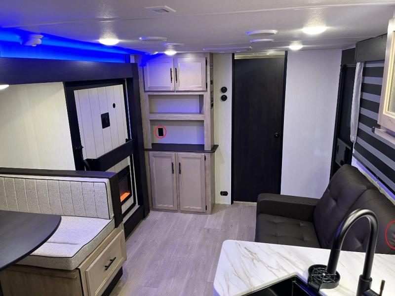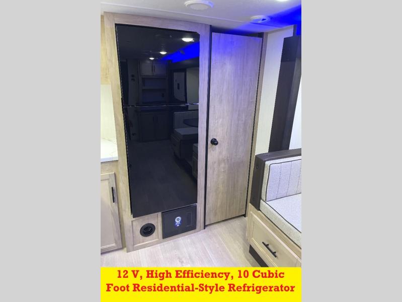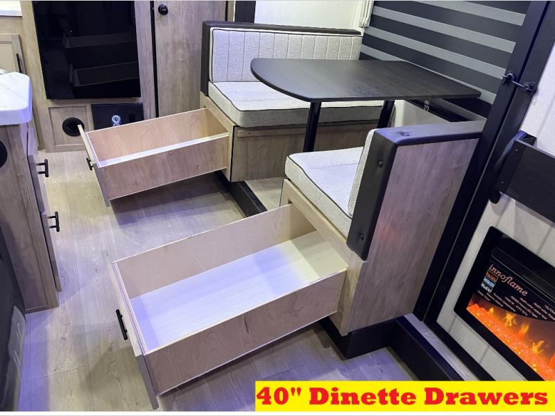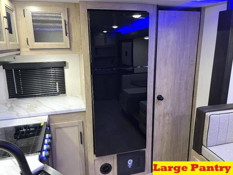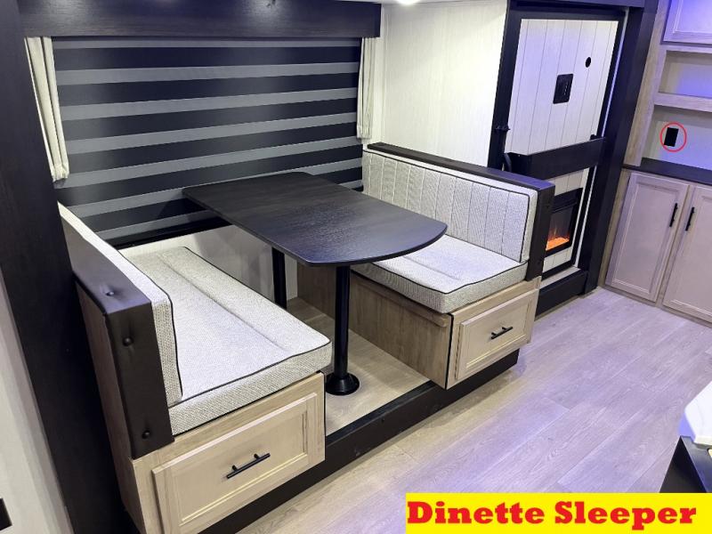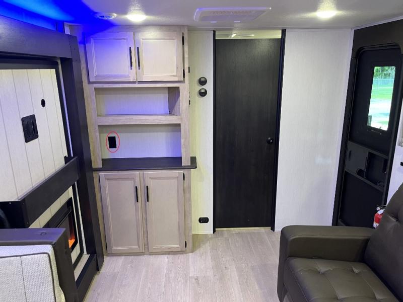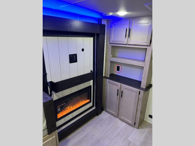 You'll love every minute spent in this single slide out travel trailer, whether you're cooking dinner on the outside kitchen or in the rear kitchen, relaxing on the sofa across from the fireplace, or sleeping on the RV king bed in the front master bedroom! There is a hidden pantry behind the fireplace for convenient storage, and the booth dinette within the slide provides a place to dine together. The walk-thru bath is spacious, and includes a tub/shower, toilet, and sink with counter space.