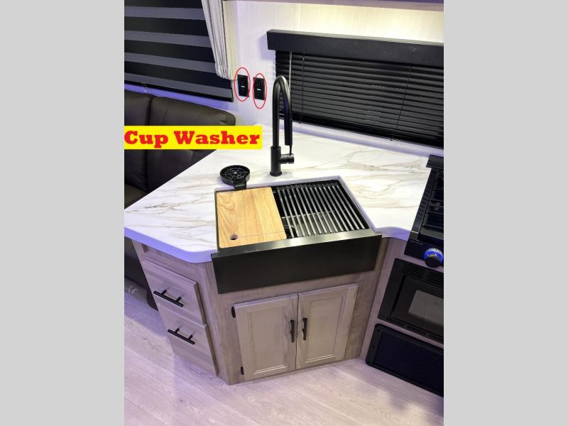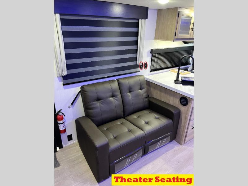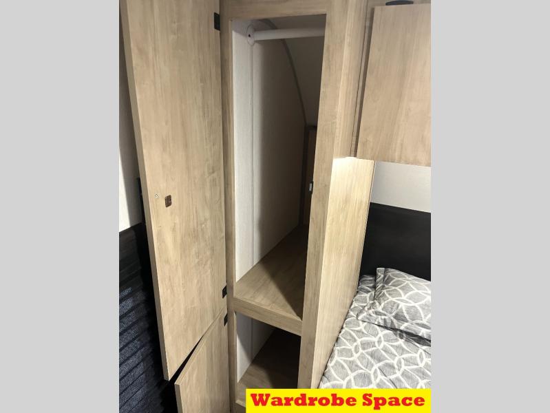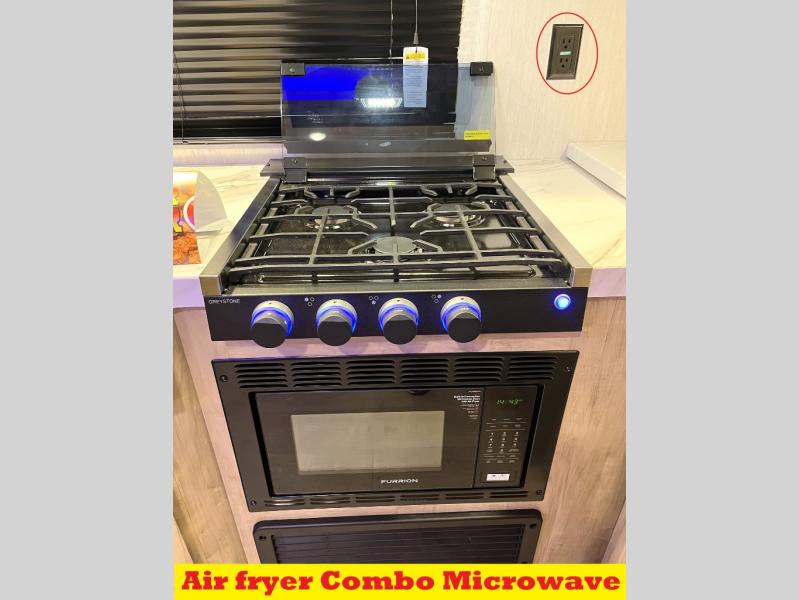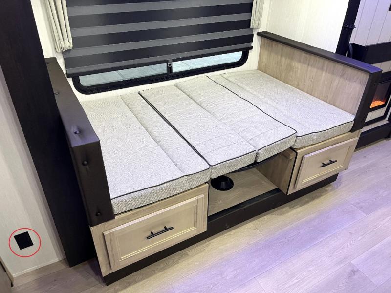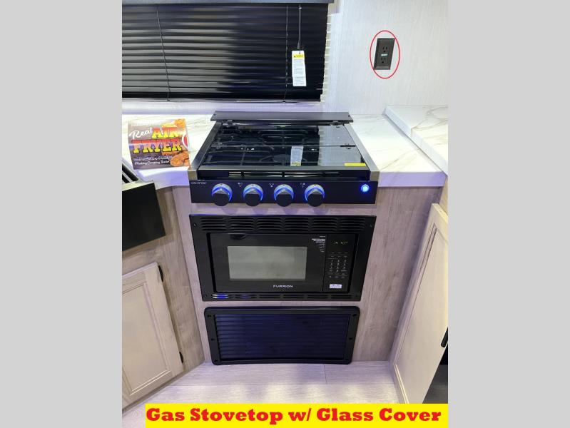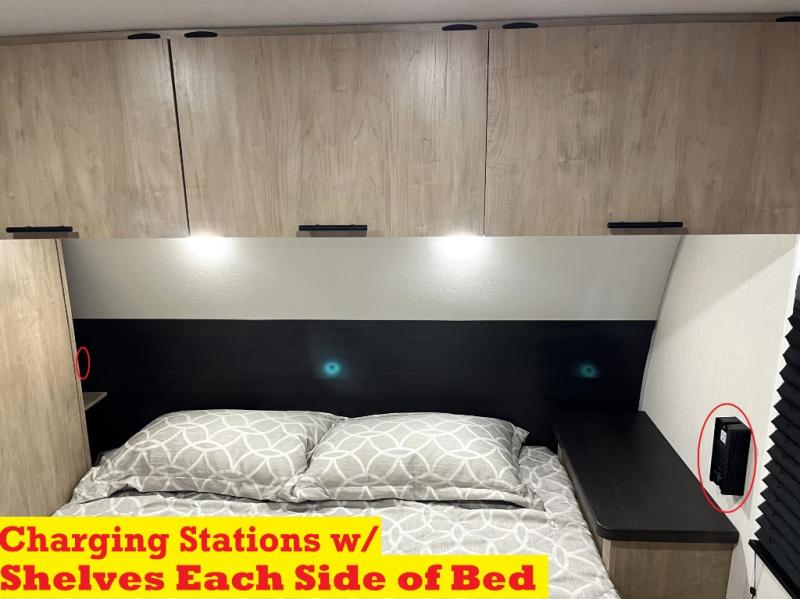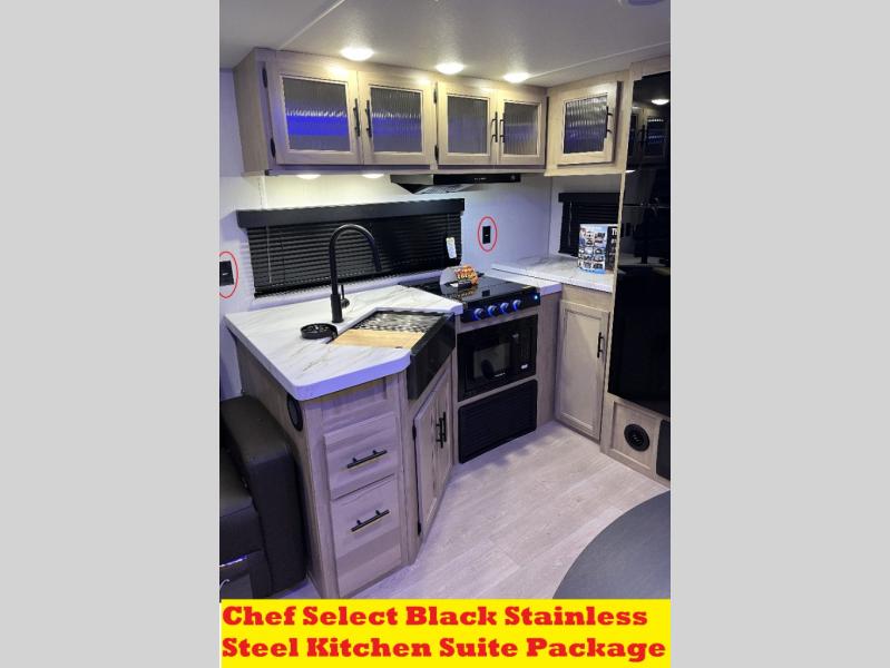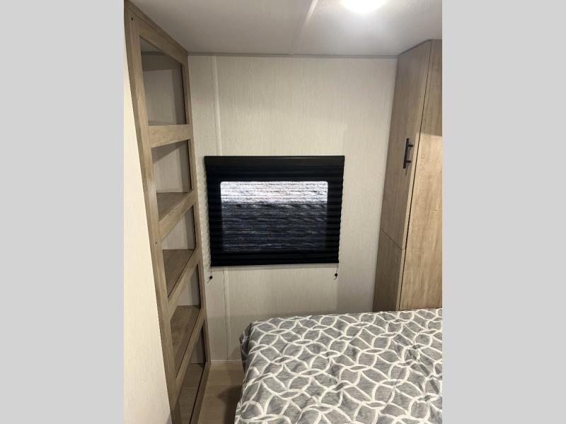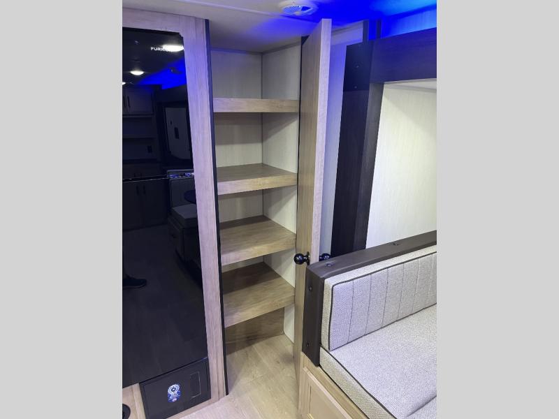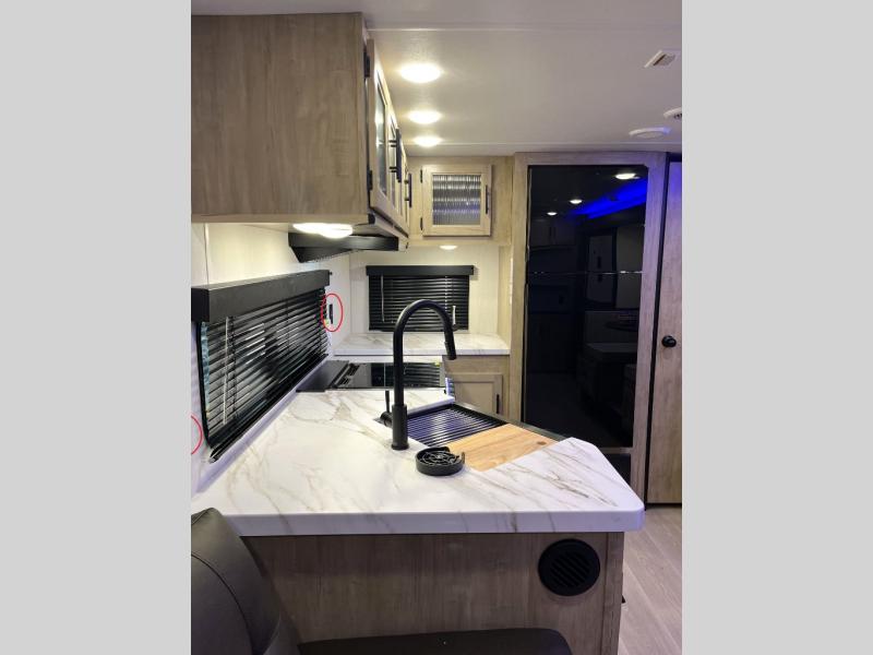 You'll love every minute spent in this single slide out travel trailer, whether you're cooking dinner on the outside kitchen or in the rear kitchen, relaxing on the sofa across from the fireplace, or sleeping on the RV king bed in the front master bedroom! There is a hidden pantry behind the fireplace for convenient storage, and the booth dinette within the slide provides a place to dine together. The walk-thru bath is spacious, and includes a tub/shower, toilet, and sink with counter space.