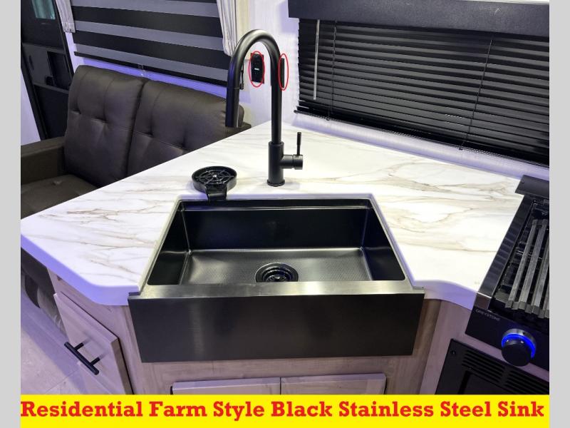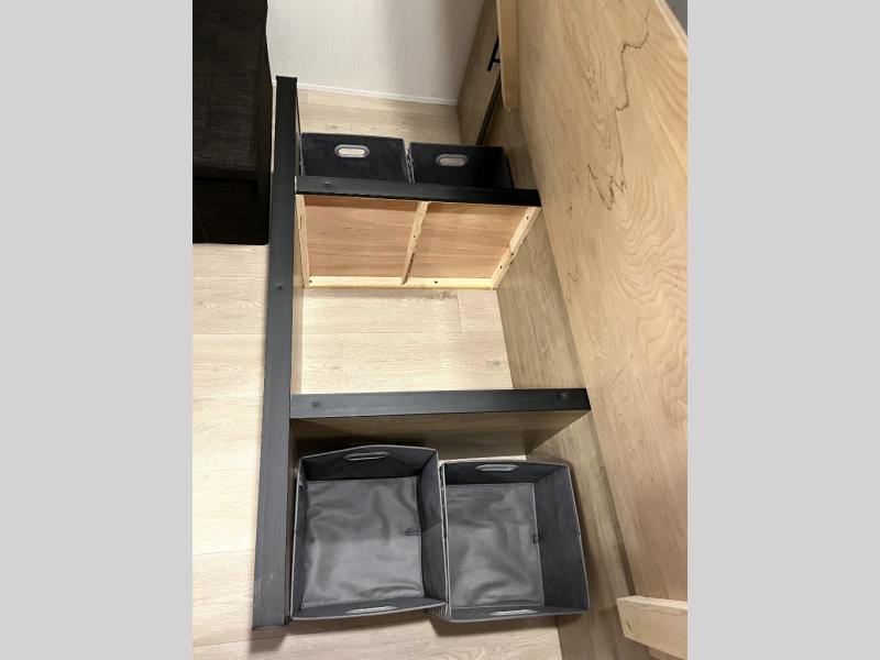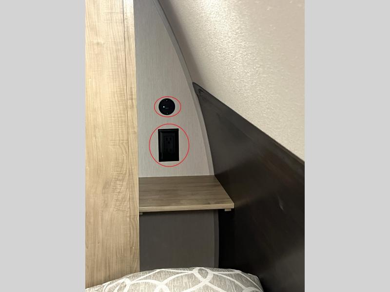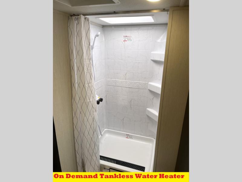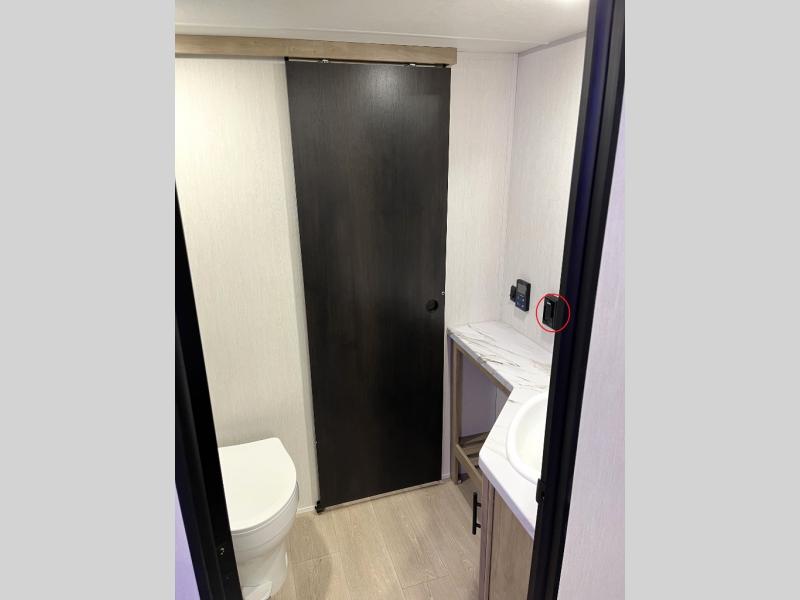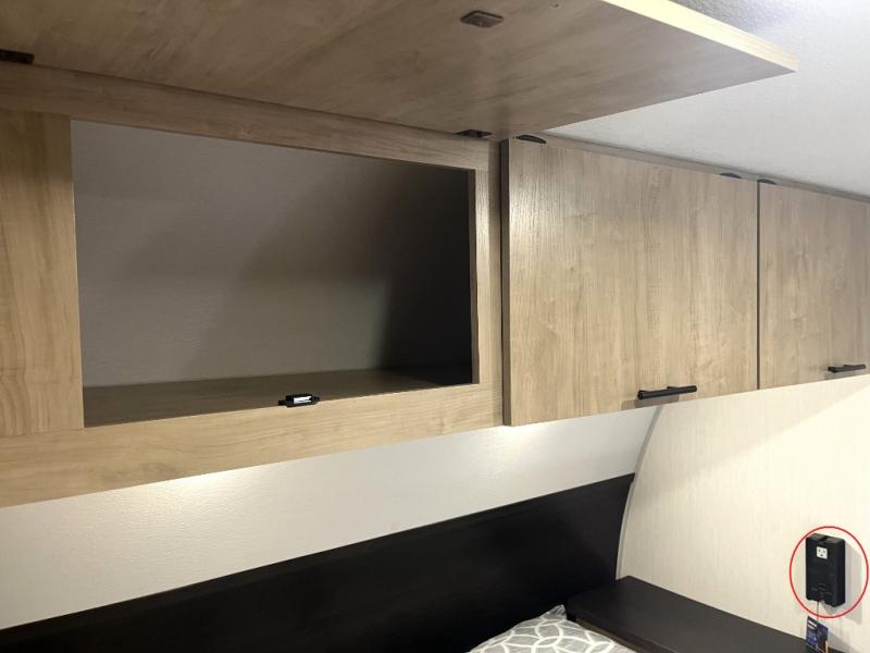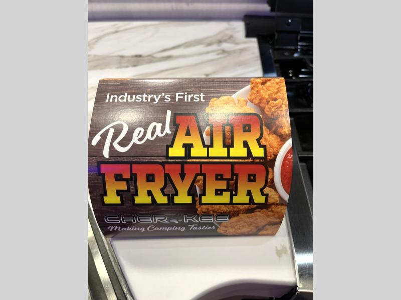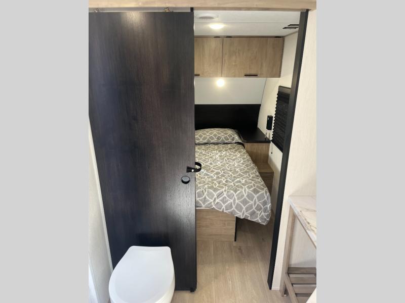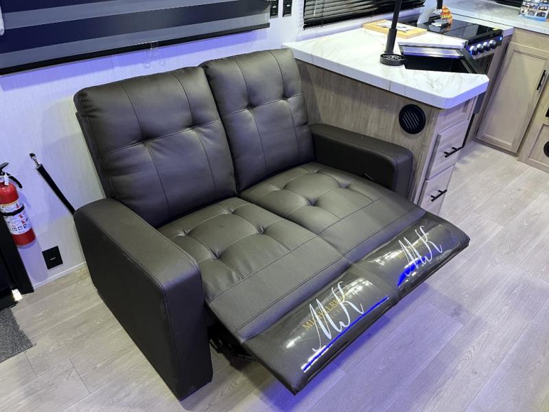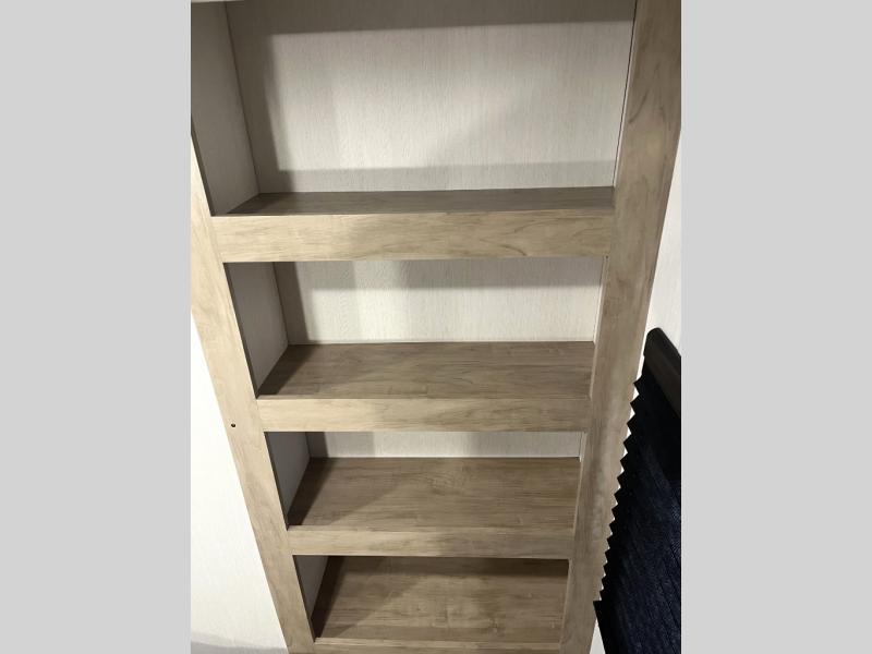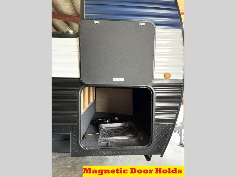 You'll love every minute spent in this single slide out travel trailer, whether you're cooking dinner on the outside kitchen or in the rear kitchen, relaxing on the sofa across from the fireplace, or sleeping on the RV king bed in the front master bedroom! There is a hidden pantry behind the fireplace for convenient storage, and the booth dinette within the slide provides a place to dine together. The walk-thru bath is spacious, and includes a tub/shower, toilet, and sink with counter space.