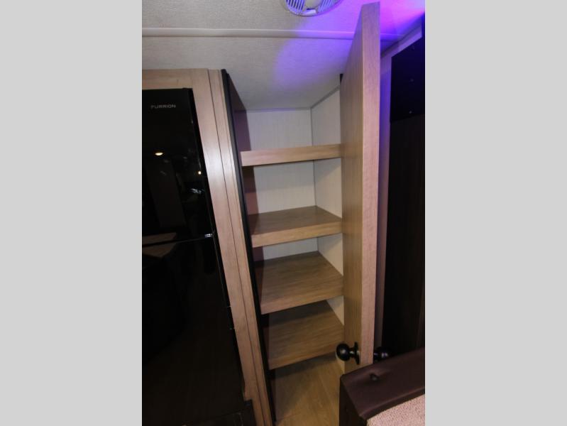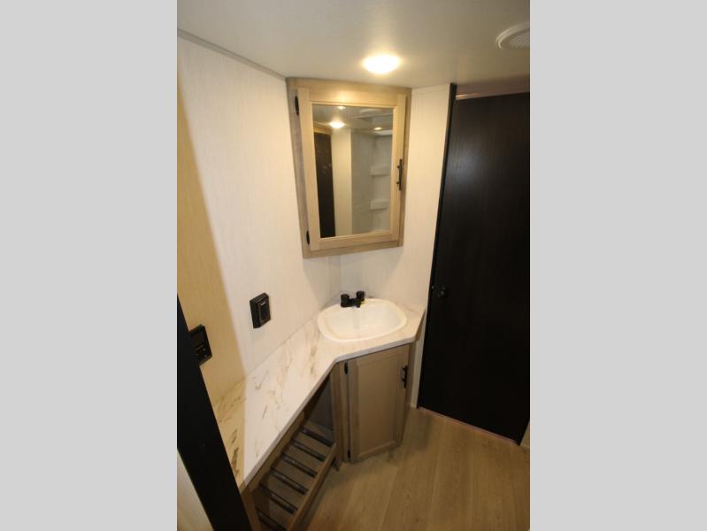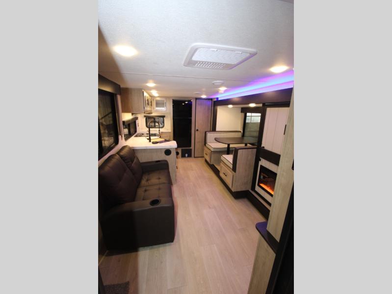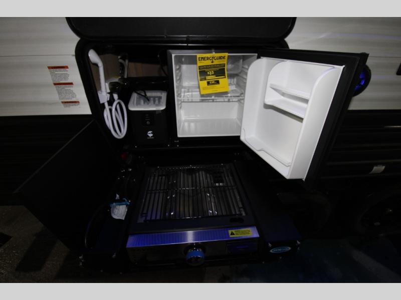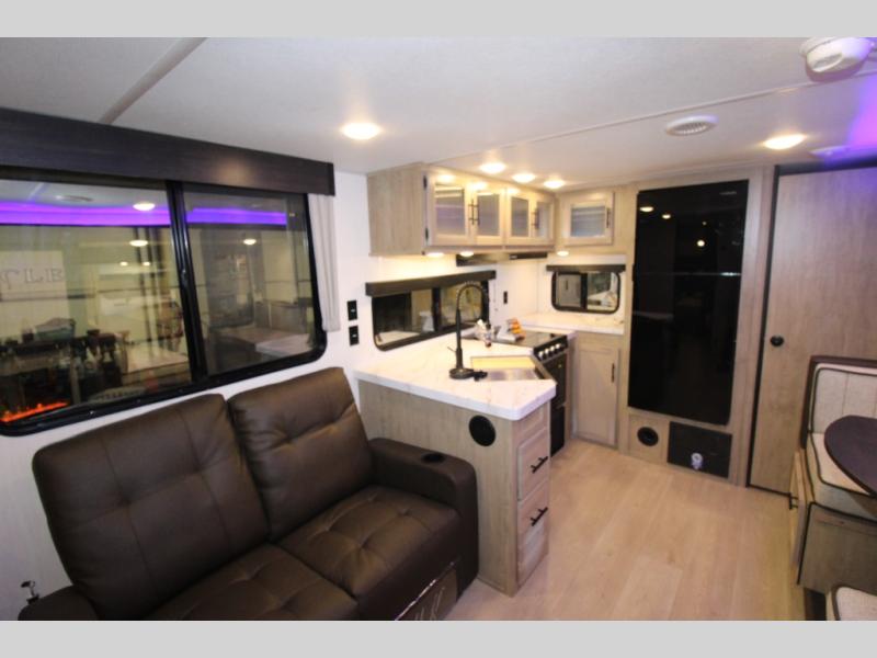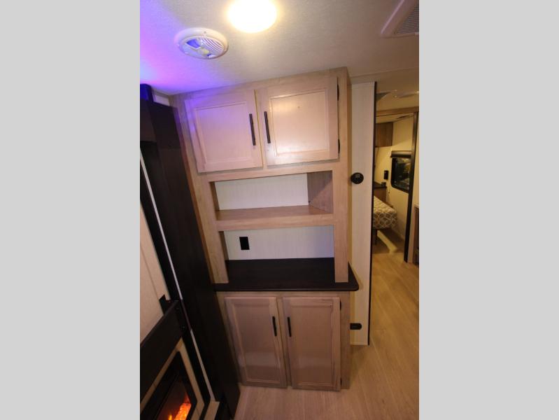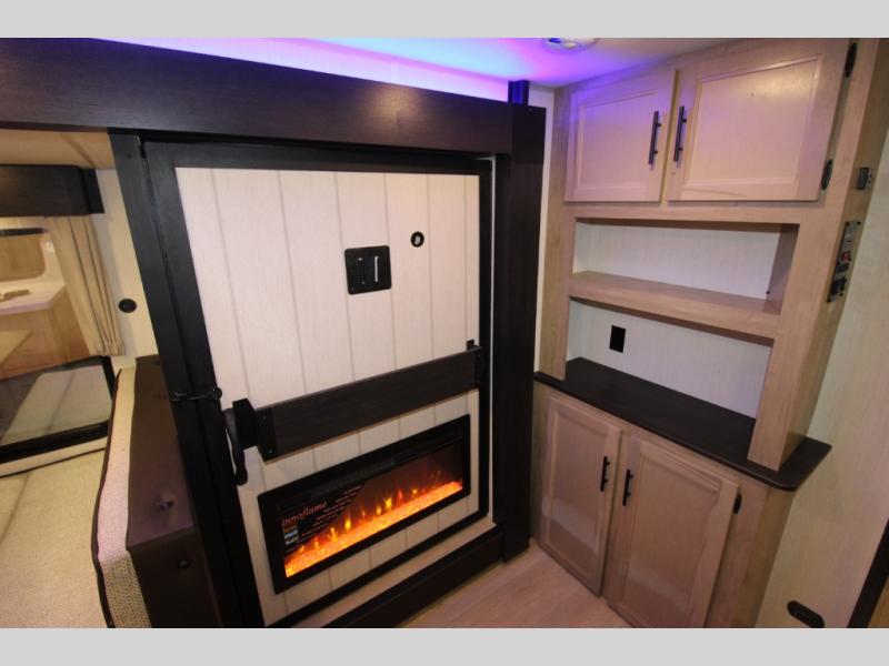You'll love every minute spent in this single slide out travel trailer, whether you're cooking dinner on the outside kitchen or in the rear kitchen, relaxing on the sofa across from the fireplace, or sleeping on the RV king bed in the front master bedroom! There is a hidden pantry behind the fireplace for convenient storage, and the booth dinette within the slide provides a place to dine together. The walk-thru bath is spacious, and includes a tub/shower, toilet, and sink with counter space.