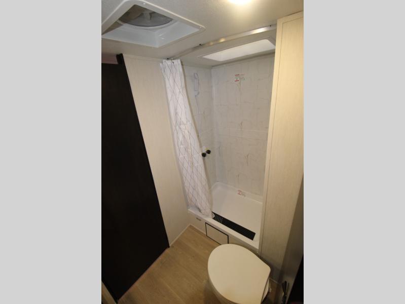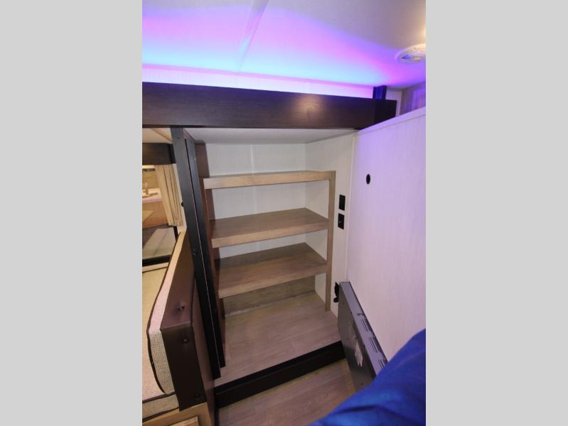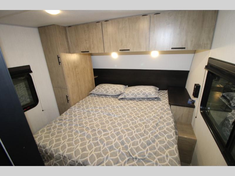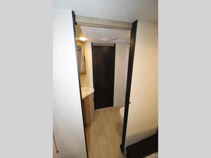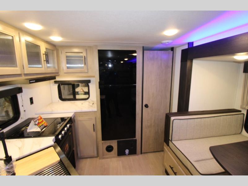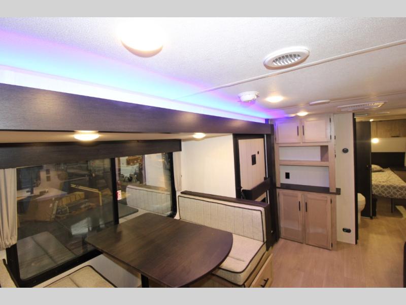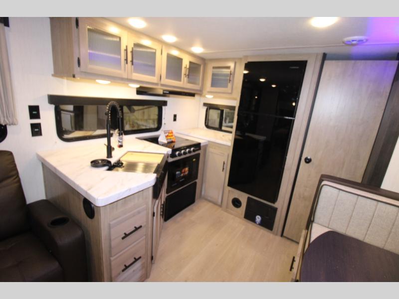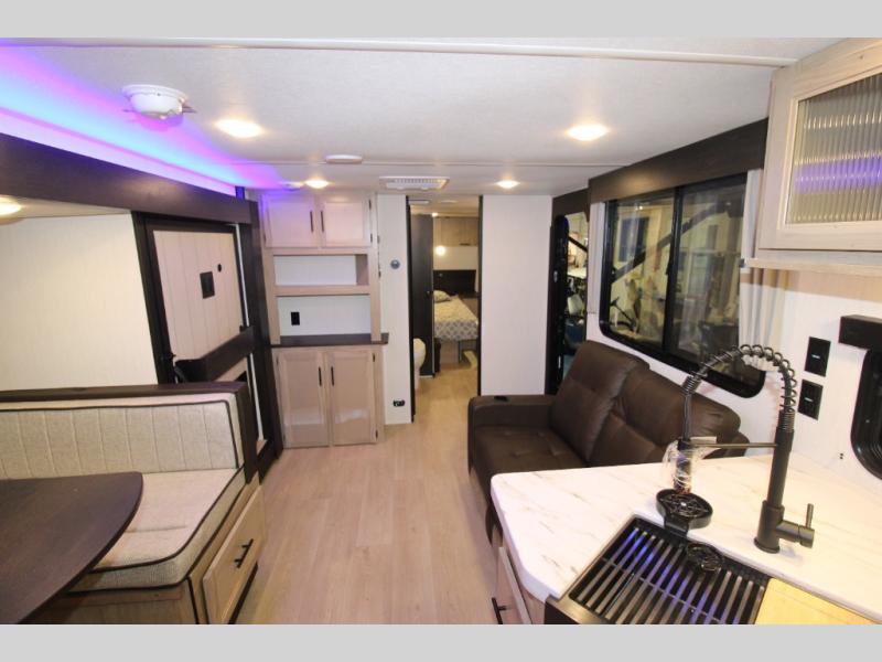 You'll love every minute spent in this single slide out travel trailer, whether you're cooking dinner on the outside kitchen or in the rear kitchen, relaxing on the sofa across from the fireplace, or sleeping on the RV king bed in the front master bedroom! There is a hidden pantry behind the fireplace for convenient storage, and the booth dinette within the slide provides a place to dine together. The walk-thru bath is spacious, and includes a tub/shower, toilet, and sink with counter space.