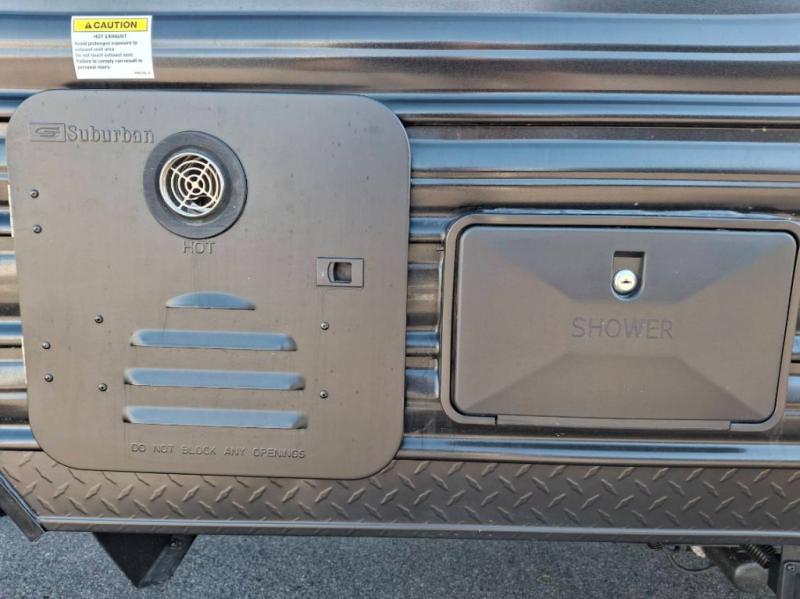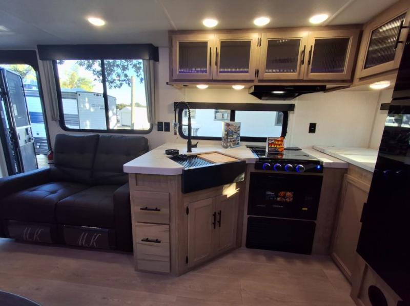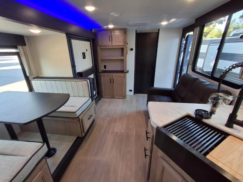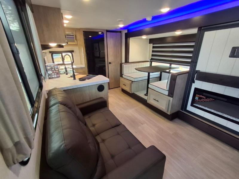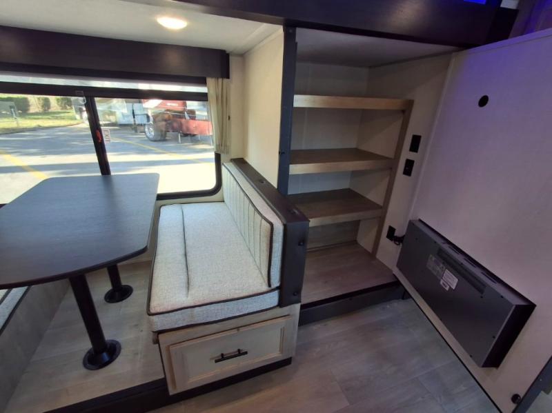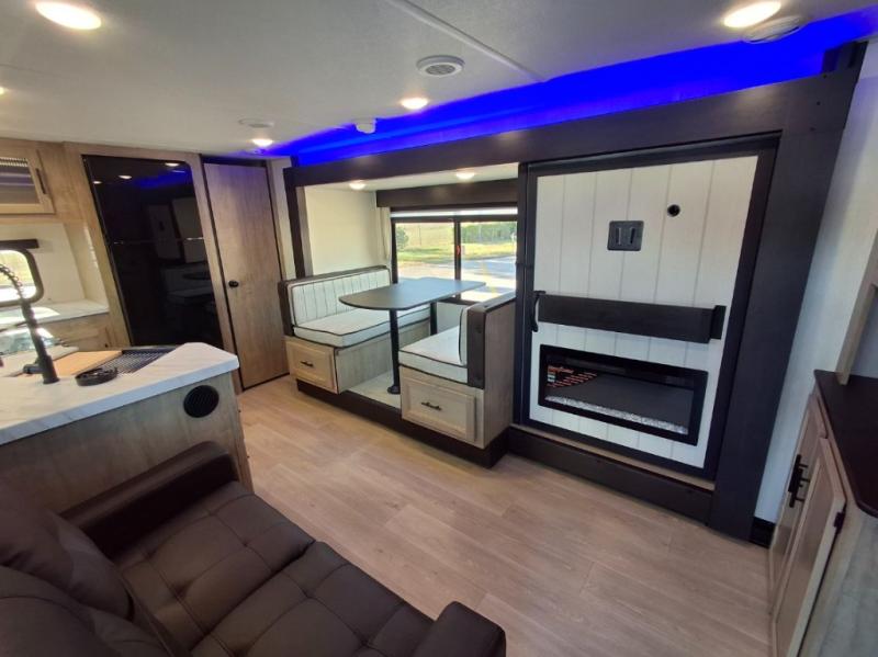 You'll love every minute spent in this single slide out travel trailer, whether you're cooking dinner on the outside kitchen or in the rear kitchen, relaxing on the sofa across from the fireplace, or sleeping on the RV king bed in the front master bedroom! There is a hidden pantry behind the fireplace for convenient storage, and the booth dinette within the slide provides a place to dine together. The walk-thru bath is spacious, and includes a tub/shower, toilet, and sink with counter space.