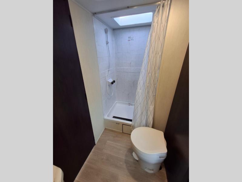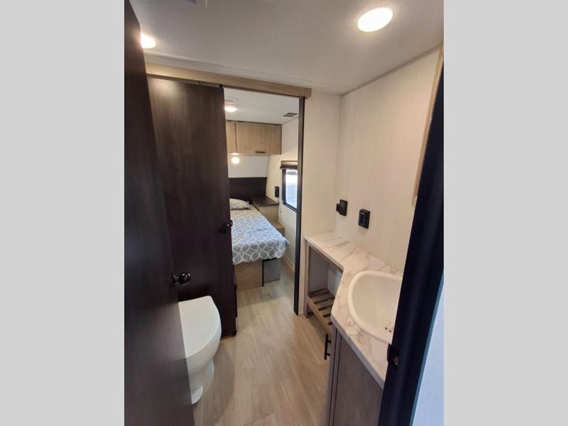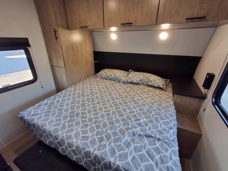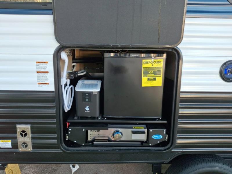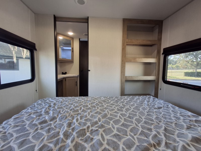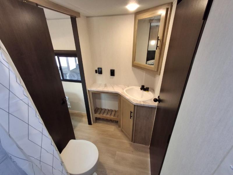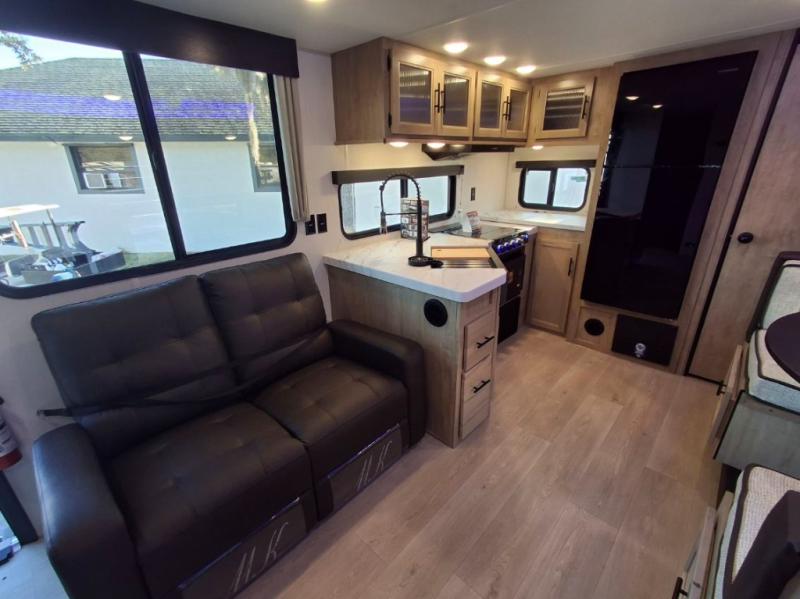 You'll love every minute spent in this single slide out travel trailer, whether you're cooking dinner on the outside kitchen or in the rear kitchen, relaxing on the sofa across from the fireplace, or sleeping on the RV king bed in the front master bedroom! There is a hidden pantry behind the fireplace for convenient storage, and the booth dinette within the slide provides a place to dine together. The walk-thru bath is spacious, and includes a tub/shower, toilet, and sink with counter space.