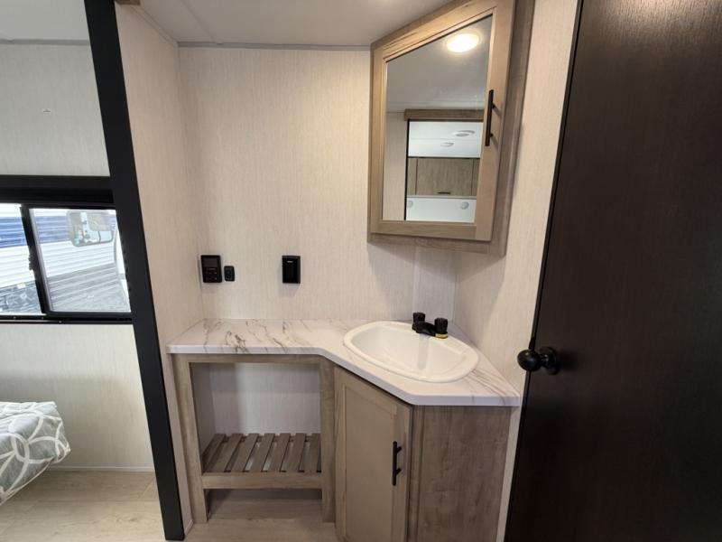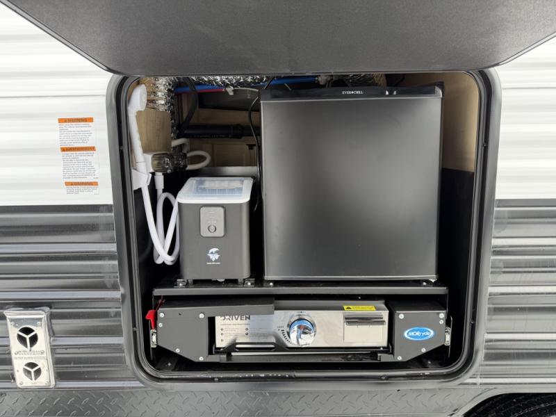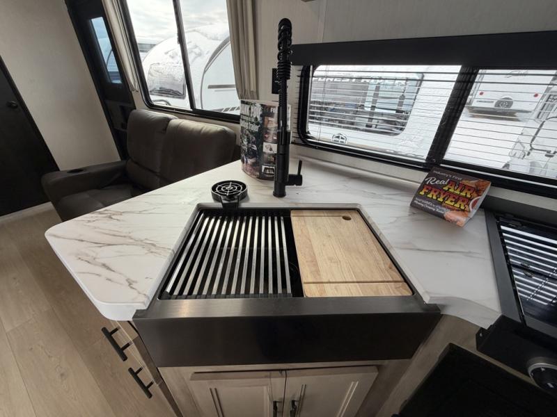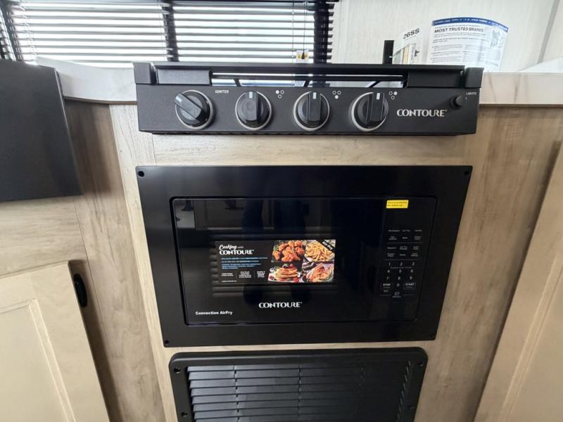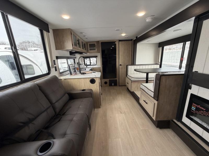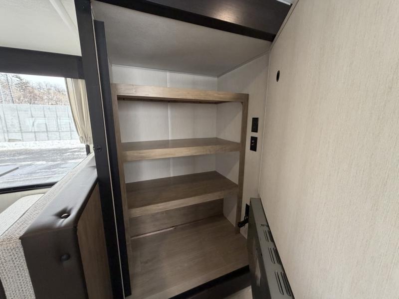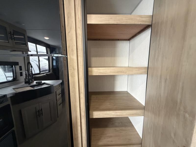 You'll love every minute spent in this single slide out travel trailer, whether you're cooking dinner on the outside kitchen or in the rear kitchen, relaxing on the sofa across from the fireplace, or sleeping on the RV king bed in the front master bedroom! There is a hidden pantry behind the fireplace for convenient storage, and the booth dinette within the slide provides a place to dine together. The walk-thru bath is spacious, and includes a tub/shower, toilet, and sink with counter space.
