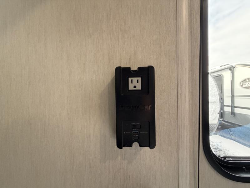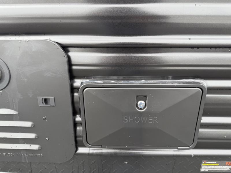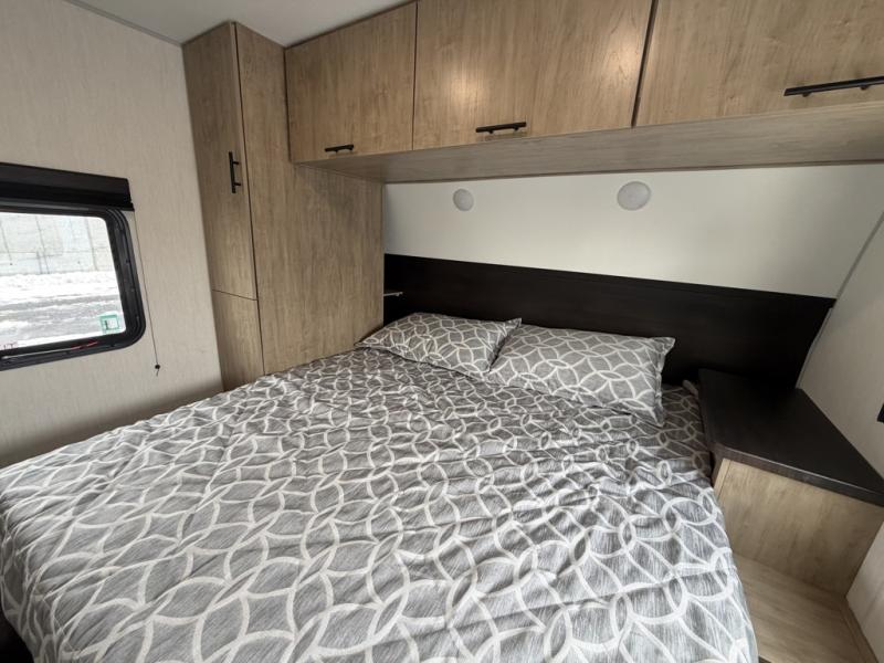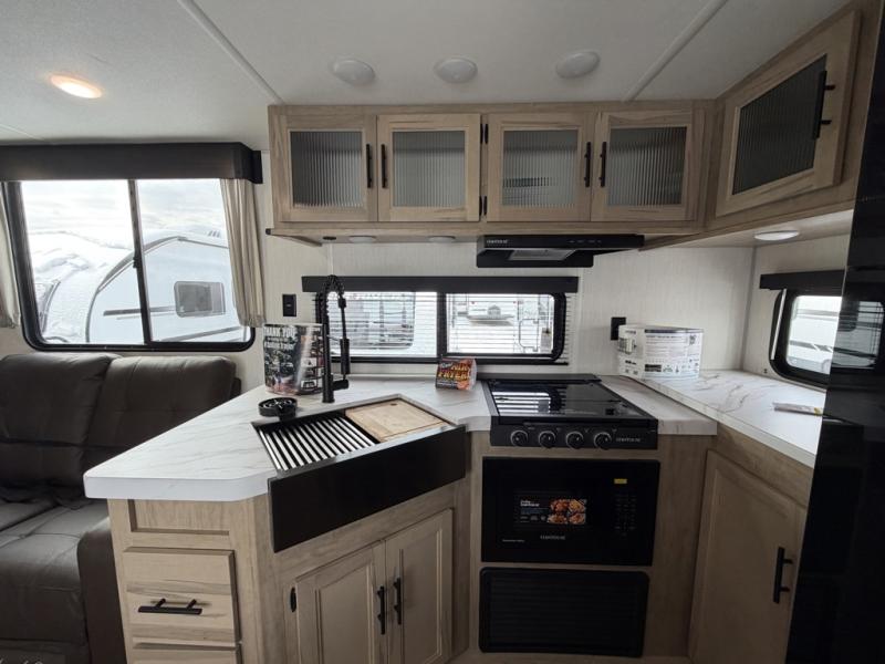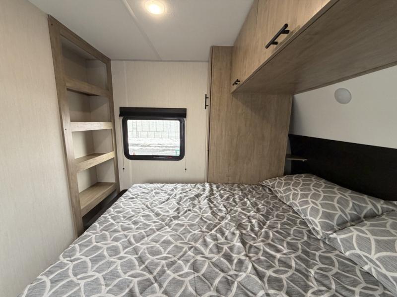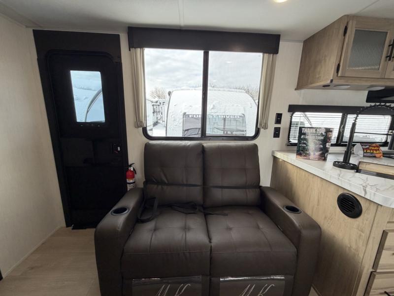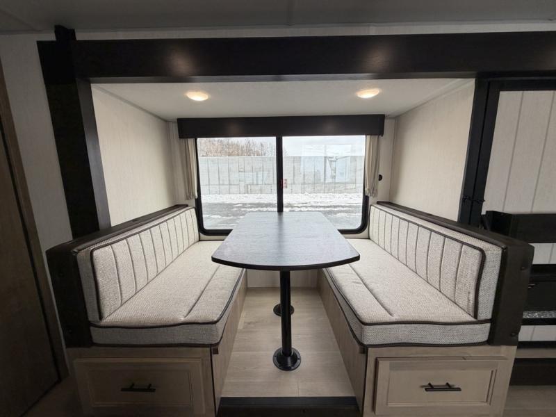 You'll love every minute spent in this single slide out travel trailer, whether you're cooking dinner on the outside kitchen or in the rear kitchen, relaxing on the sofa across from the fireplace, or sleeping on the RV king bed in the front master bedroom! There is a hidden pantry behind the fireplace for convenient storage, and the booth dinette within the slide provides a place to dine together. The walk-thru bath is spacious, and includes a tub/shower, toilet, and sink with counter space.