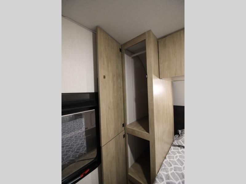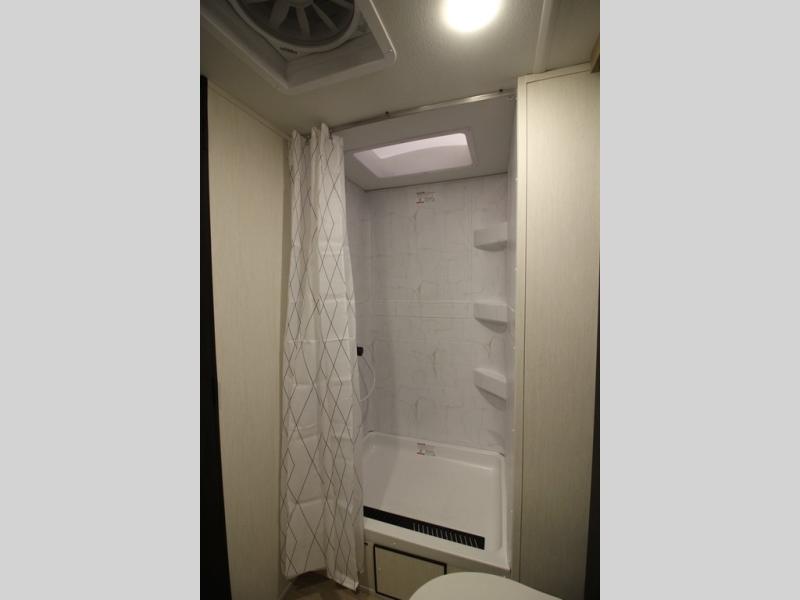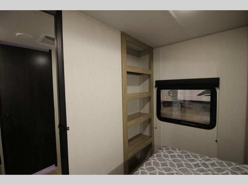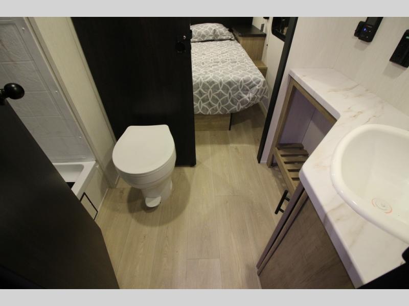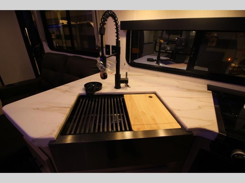 You'll love every minute spent in this single slide out travel trailer, whether you're cooking dinner on the outside kitchen or in the rear kitchen, relaxing on the sofa across from the fireplace, or sleeping on the RV king bed in the front master bedroom! There is a hidden pantry behind the fireplace for convenient storage, and the booth dinette within the slide provides a place to dine together. The walk-thru bath is spacious, and includes a tub/shower, toilet, and sink with counter space.