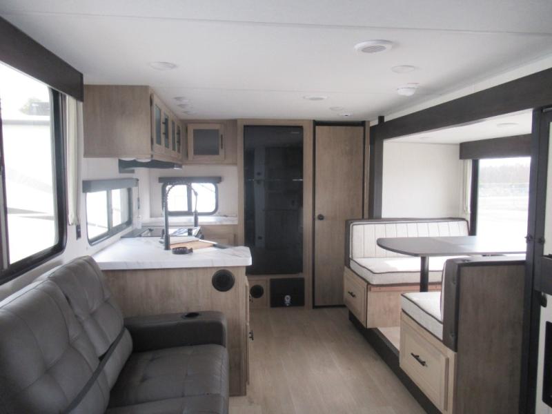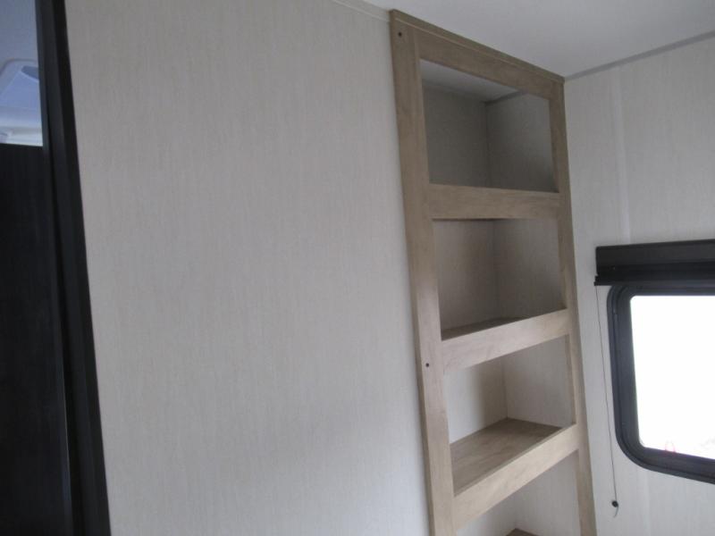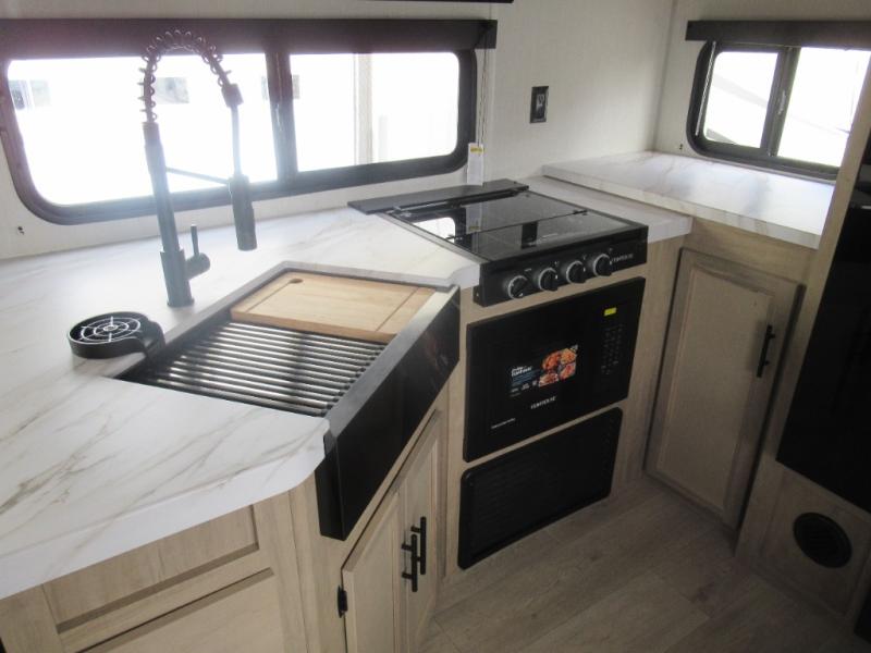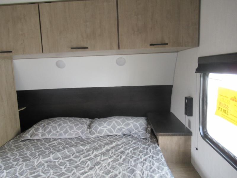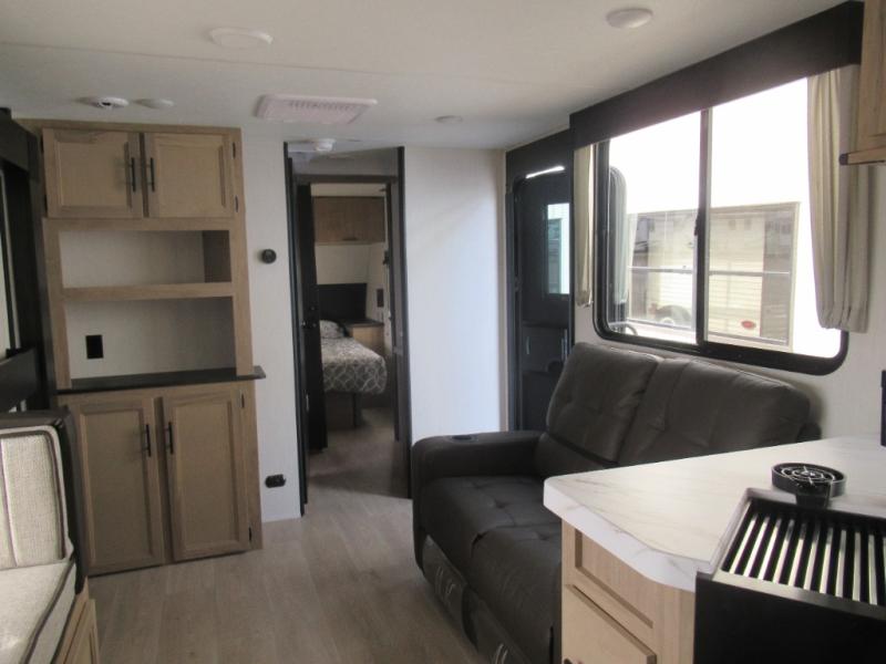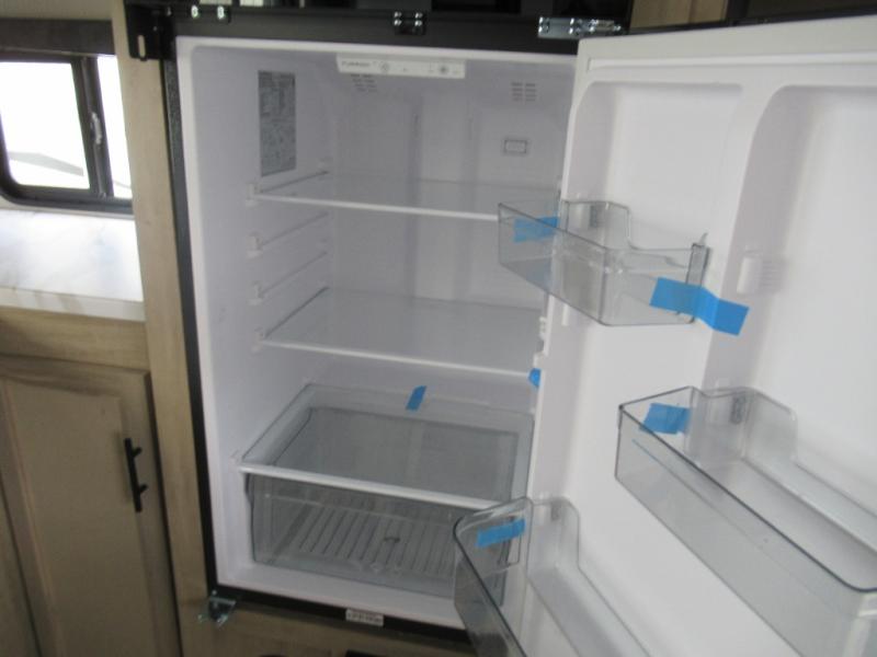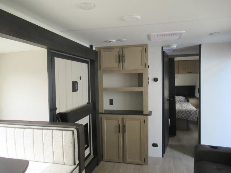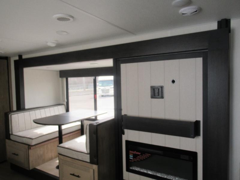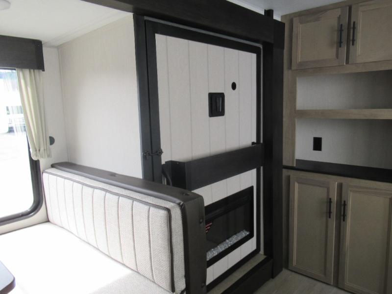 You'll love every minute spent in this single slide out travel trailer, whether you're cooking dinner on the outside kitchen or in the rear kitchen, relaxing on the sofa across from the fireplace, or sleeping on the RV king bed in the front master bedroom! There is a hidden pantry behind the fireplace for convenient storage, and the booth dinette within the slide provides a place to dine together. The walk-thru bath is spacious, and includes a tub/shower, toilet, and sink with counter space.