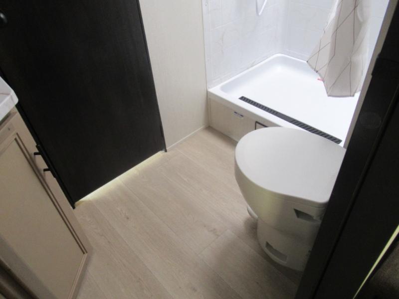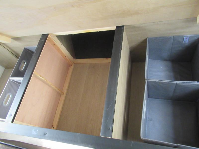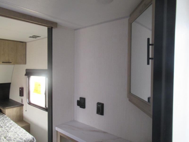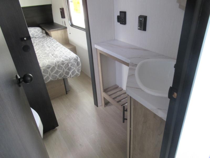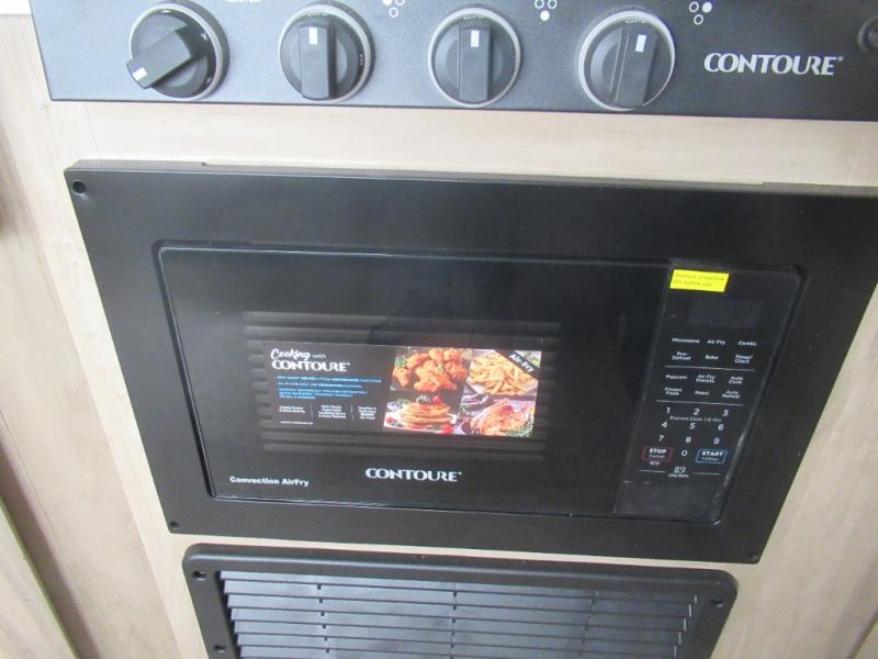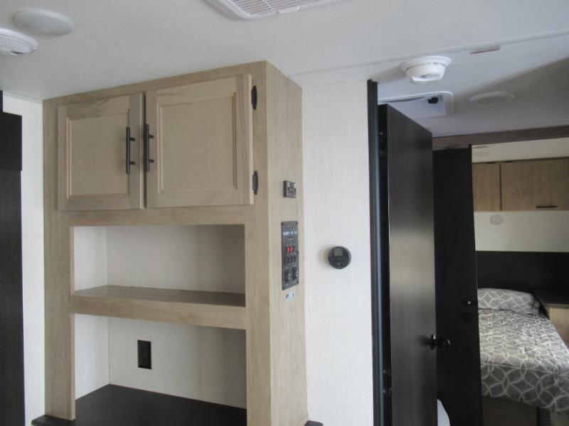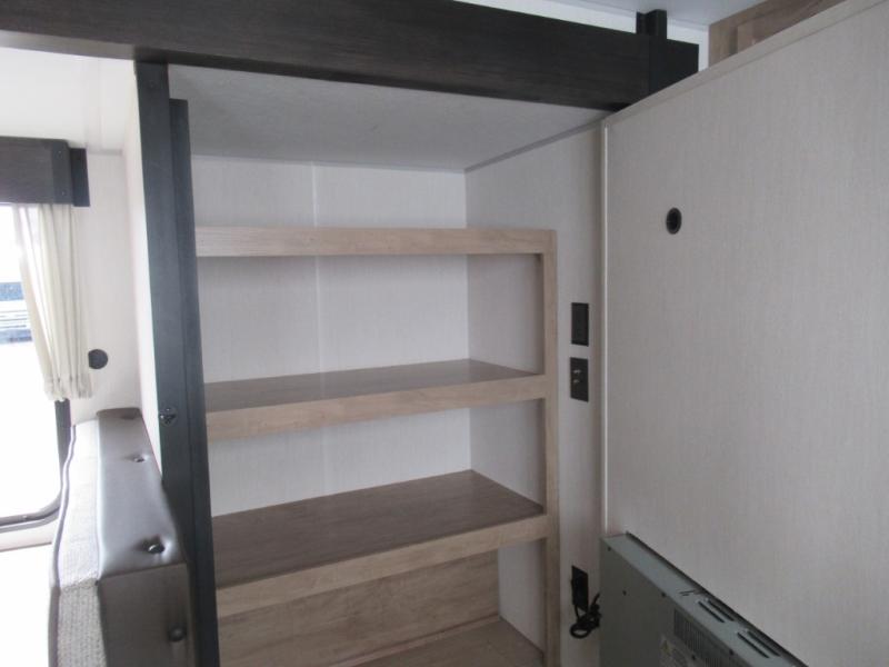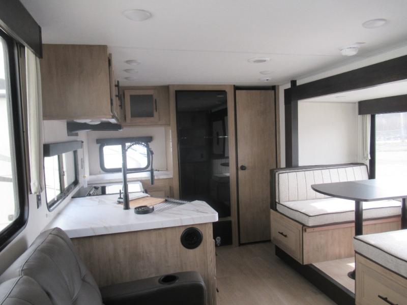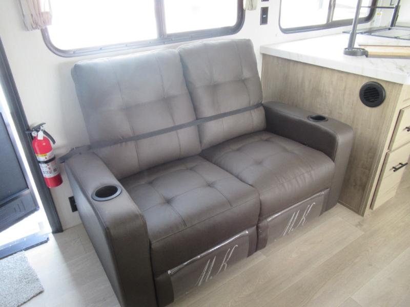 You'll love every minute spent in this single slide out travel trailer, whether you're cooking dinner on the outside kitchen or in the rear kitchen, relaxing on the sofa across from the fireplace, or sleeping on the RV king bed in the front master bedroom! There is a hidden pantry behind the fireplace for convenient storage, and the booth dinette within the slide provides a place to dine together. The walk-thru bath is spacious, and includes a tub/shower, toilet, and sink with counter space.