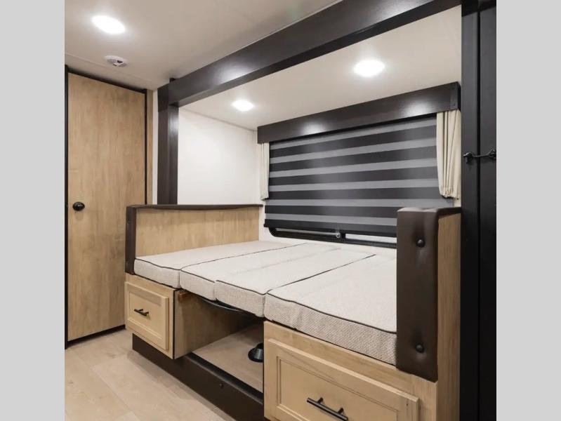 You'll love every minute spent in this single slide out travel trailer, whether you're cooking dinner on the outside kitchen or in the rear kitchen, relaxing on the sofa across from the fireplace, or sleeping on the RV king bed in the front master bedroom! There is a hidden pantry behind the fireplace for convenient storage, and the booth dinette within the slide provides a place to dine together. The walk-thru bath is spacious, and includes a tub/shower, toilet, and sink with counter space.