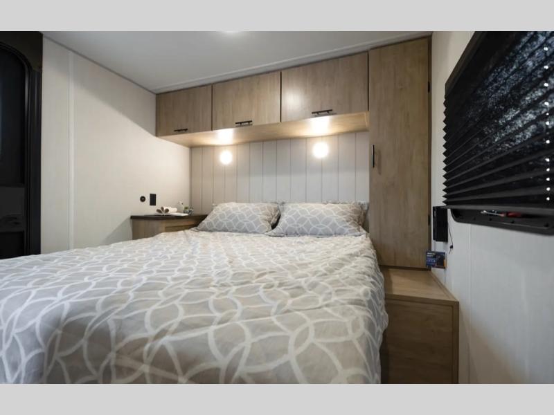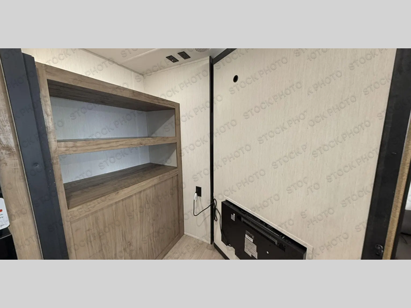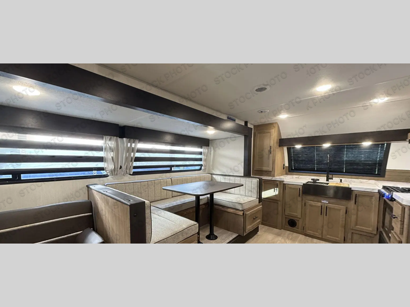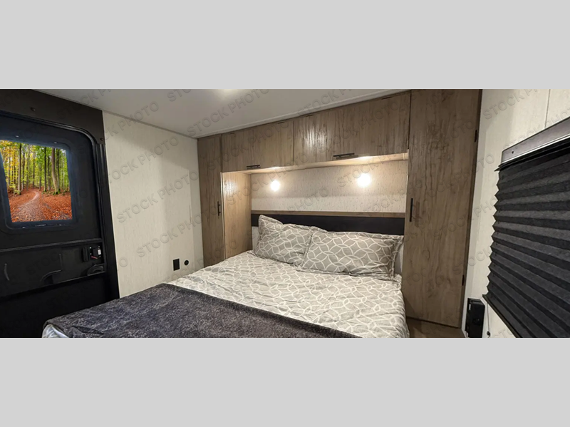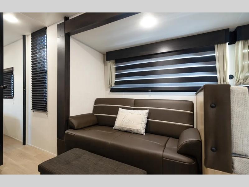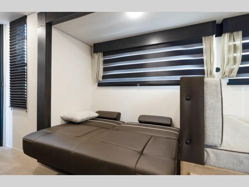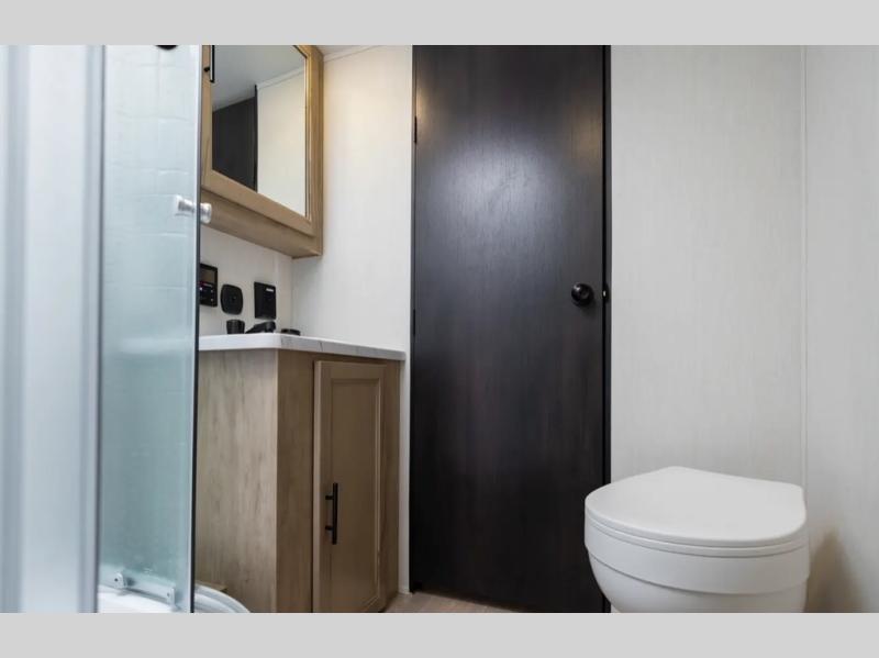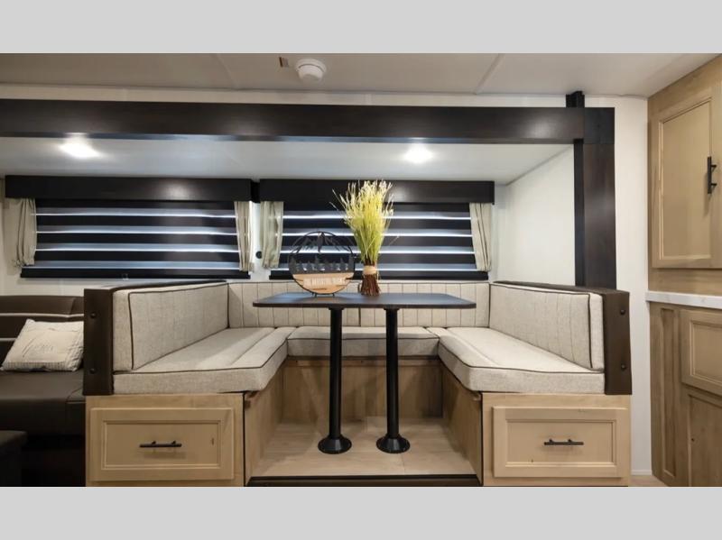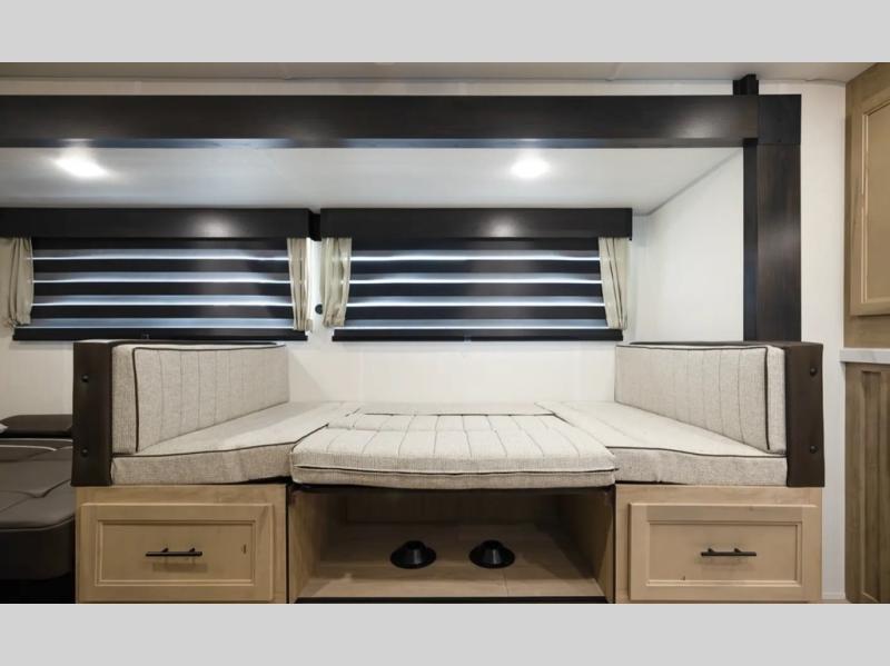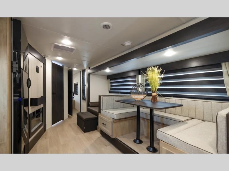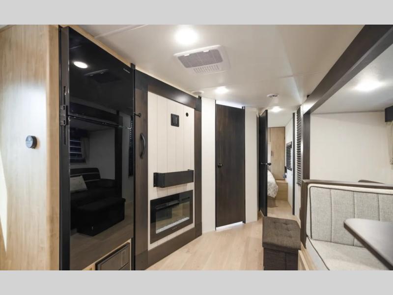 Since this travel trailer features dual entry doors, you can enter in through the rear master bedroom or the front kitchen; how convenient! The kitchen includes ample counter space and all the appliances to prep meals, along with a pantry up front and a hidden pantry behind the fireplace. Your crew can get comfortable on the sofa or play a game around the U-shaped dinette, although you may just find yourselves outdoors since there is an outside kitchen and a power awning with LED lights. The dual entry bath will let you enter in through the main living area, plus it has a private entrance into the bedroom. Here, you'll find an RV king bed, dual wardrobes for your things, and USB ports to keep your electronics charged!