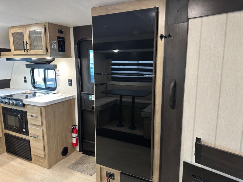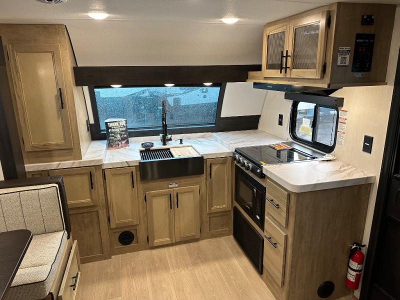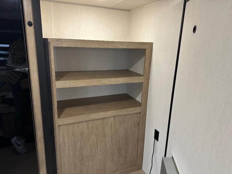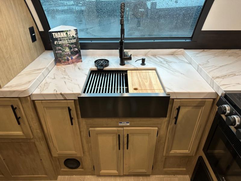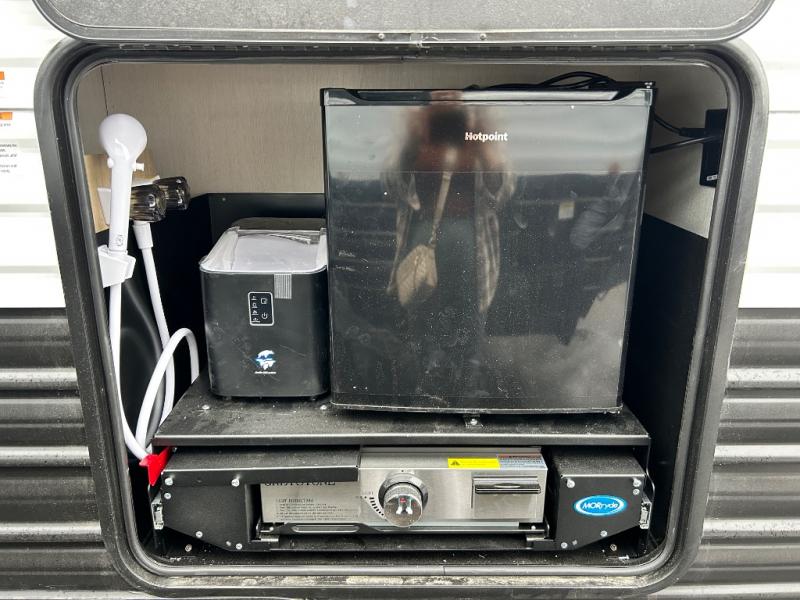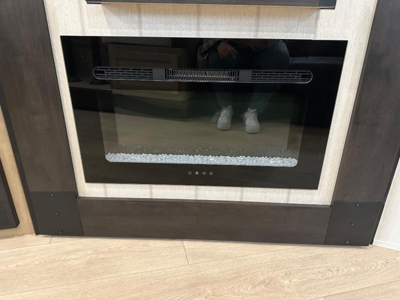 Since this travel trailer features dual entry doors, you can enter in through the rear master bedroom or the front kitchen; how convenient! The kitchen includes ample counter space and all the appliances to prep meals, along with a pantry up front and a hidden pantry behind the fireplace. Your crew can get comfortable on the sofa or play a game at the booth dinette, although you may just find yourselves outdoors since there is an outside kitchen and a power awning with LED lights. The dual entry bath will let you enter in through the main living area, plus it has a private entrance into the bedroom. Here, you'll find an RV king bed, dual wardrobes for your things, and USB ports to keep your electronics charged!