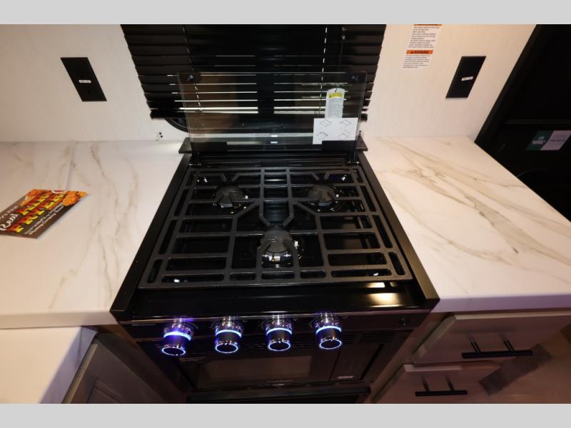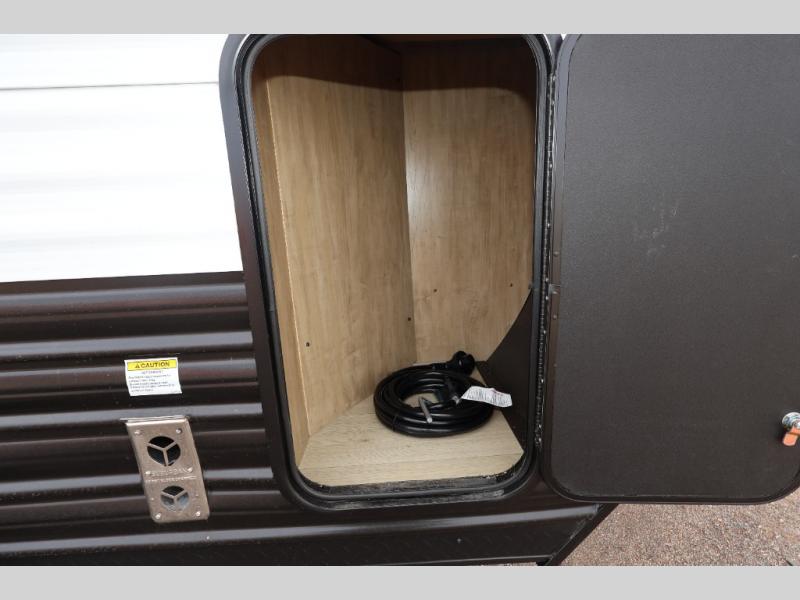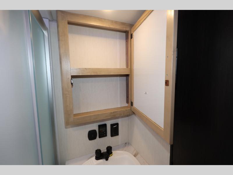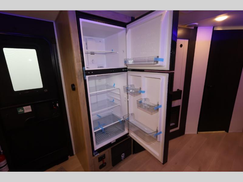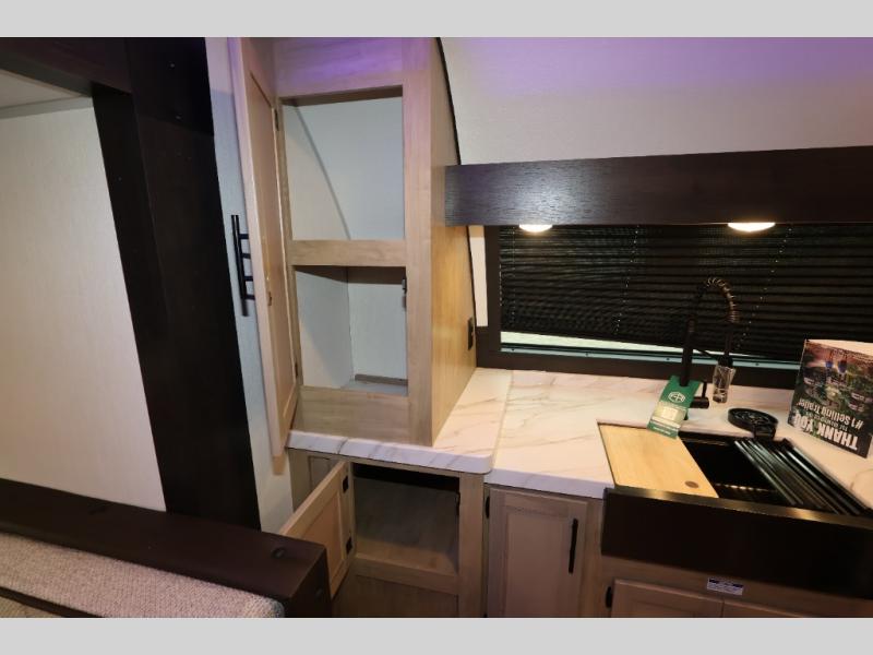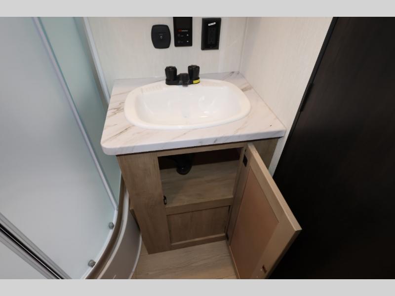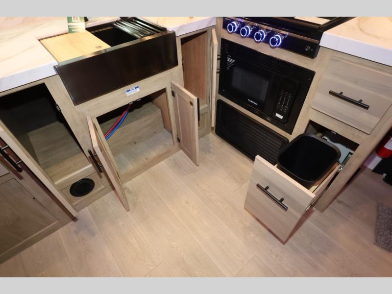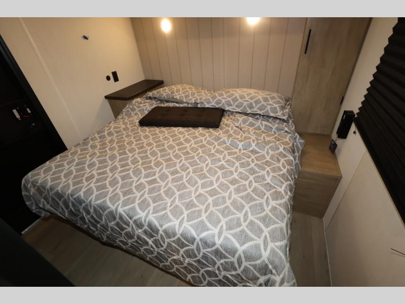 Since this travel trailer features dual entry doors, you can enter in through the rear master bedroom or the front kitchen; how convenient! The kitchen includes ample counter space and all the appliances to prep meals, along with a pantry up front and a hidden pantry behind the fireplace. Your crew can get comfortable on the sofa or play a game at the booth dinette, although you may just find yourselves outdoors since there is an outside kitchen and a power awning with LED lights. The dual entry bath will let you enter in through the main living area, plus it has a private entrance into the bedroom. Here, you'll find an RV king bed, dual wardrobes for your things, and USB ports to keep your electronics charged!