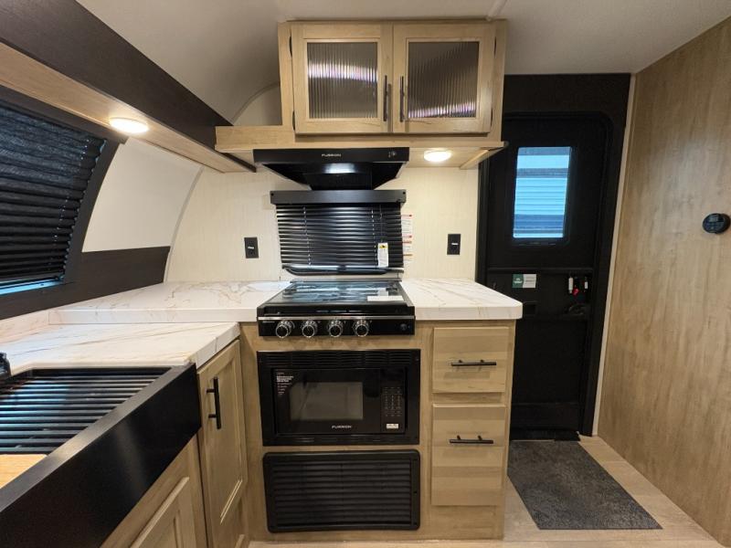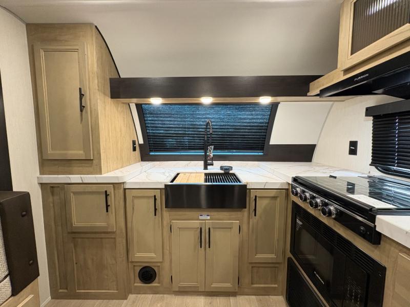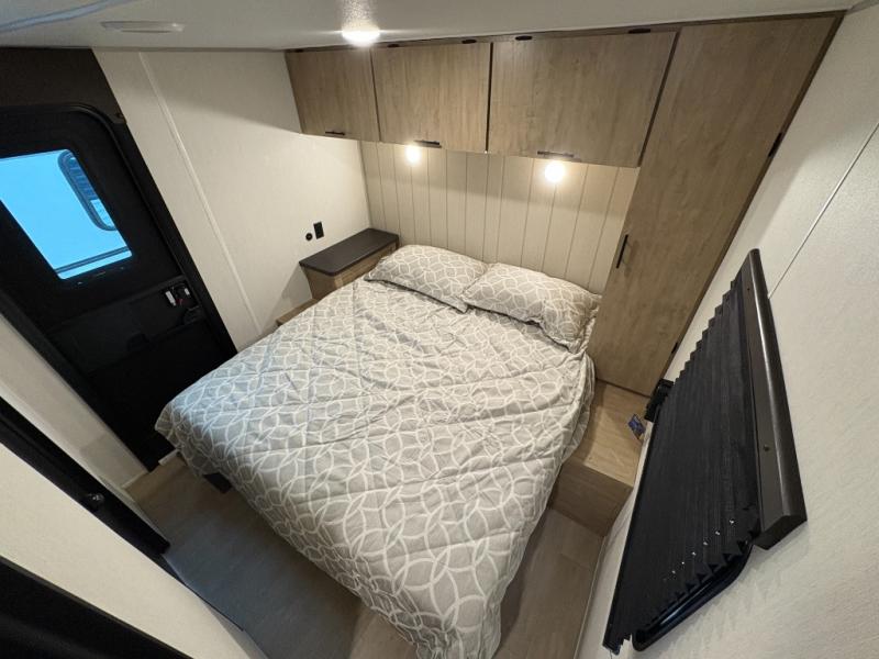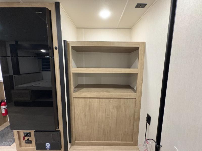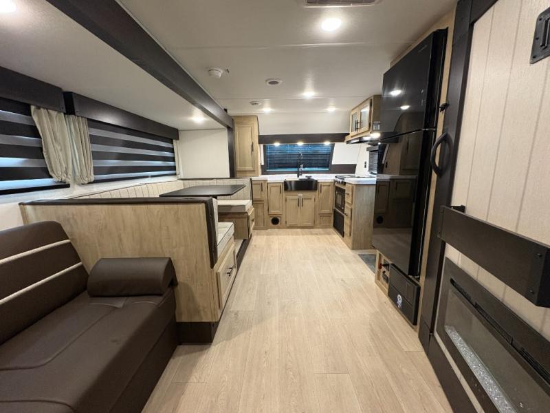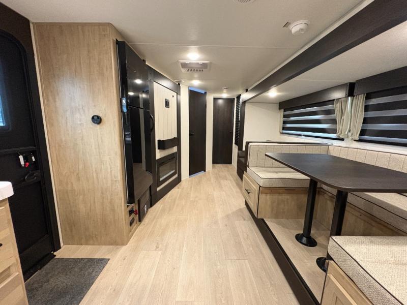Since this travel trailer features dual entry doors, you can enter in through the rear master bedroom or the front kitchen; how convenient! The kitchen includes ample counter space and all the appliances to prep meals, along with a pantry up front and a hidden pantry behind the fireplace. Your crew can get comfortable on the sofa or play a game at the booth dinette, although you may just find yourselves outdoors since there is an outside kitchen and a power awning with LED lights. The dual entry bath will let you enter in through the main living area, plus it has a private entrance into the bedroom. Here, you'll find an RV king bed, dual wardrobes for your things, and USB ports to keep your electronics charged!
