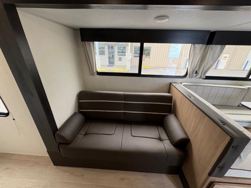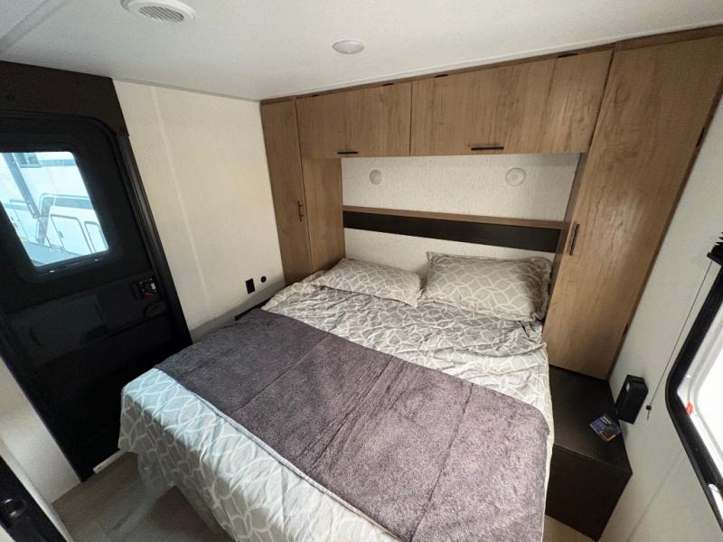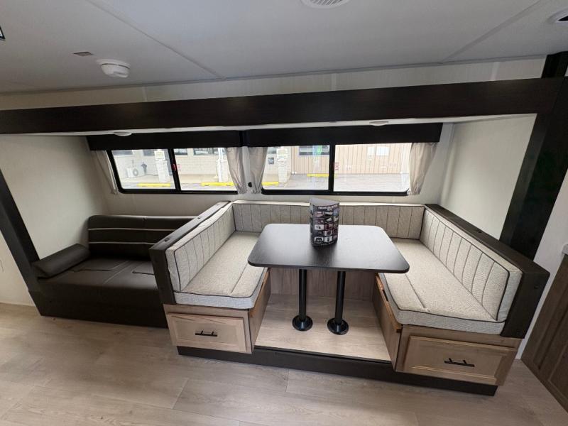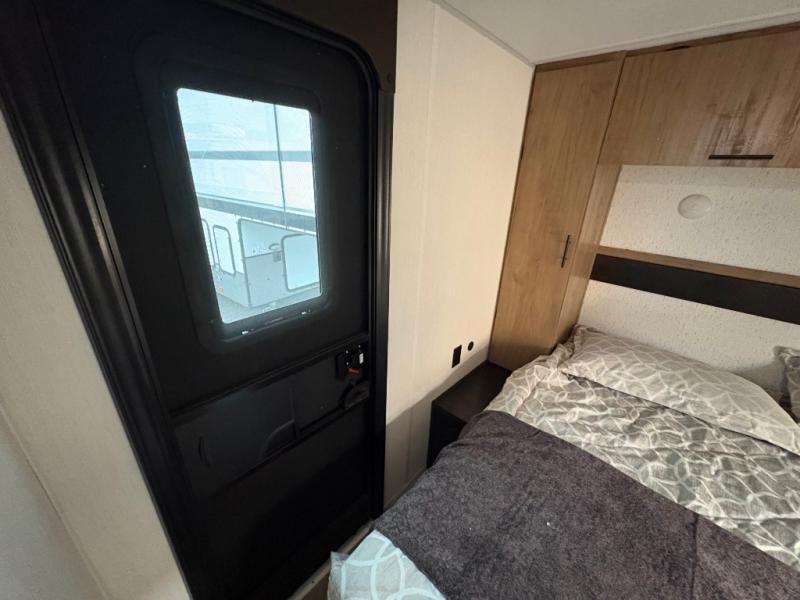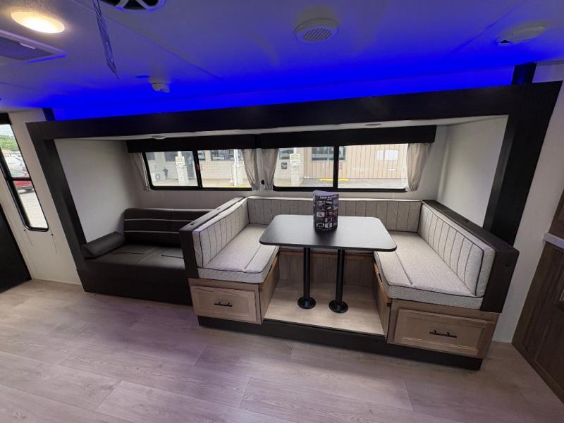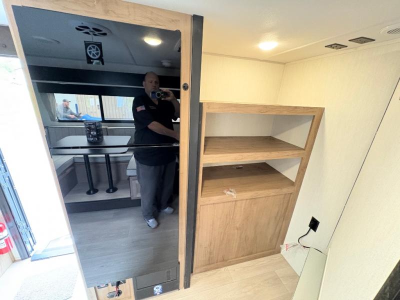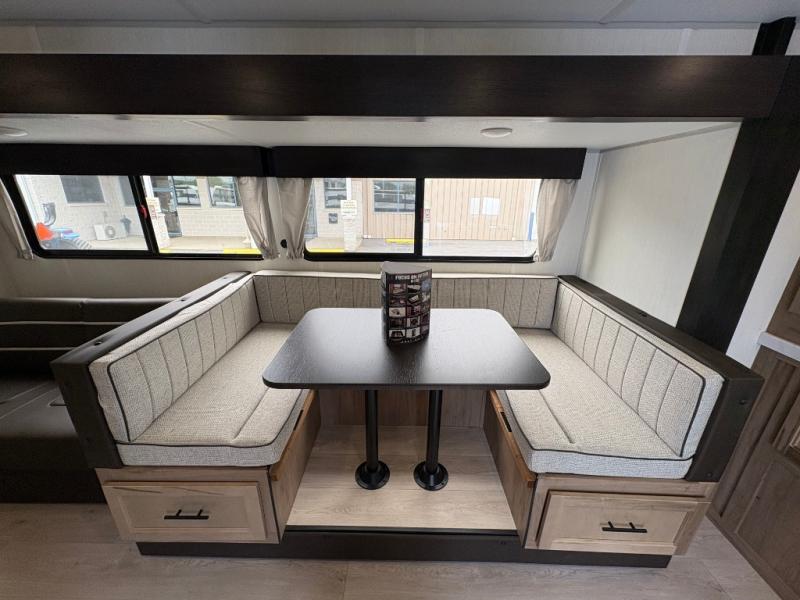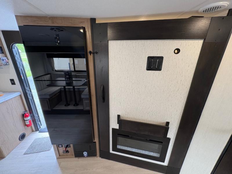 Since this travel trailer features dual entry doors, you can enter in through the rear master bedroom or the front kitchen; how convenient! The kitchen includes ample counter space and all the appliances to prep meals, along with a pantry up front and a hidden pantry behind the fireplace. Your crew can get comfortable on the sofa or play a game around the U-shaped dinette, although you may just find yourselves outdoors since there is an outside kitchen and a power awning with LED lights. The dual entry bath will let you enter in through the main living area, plus it has a private entrance into the bedroom. Here, you'll find an RV king bed, dual wardrobes for your things, and USB ports to keep your electronics charged!