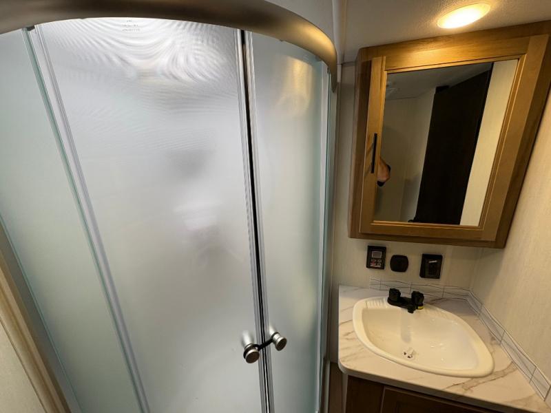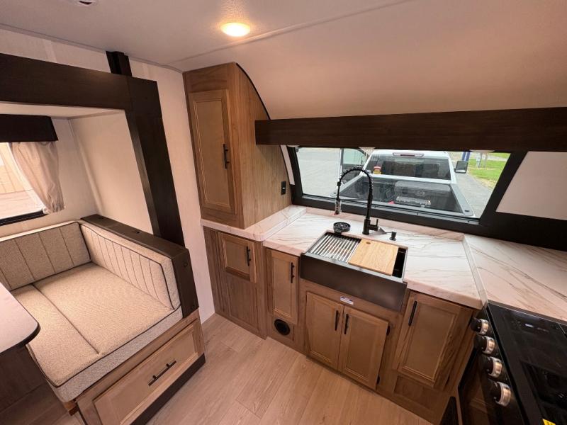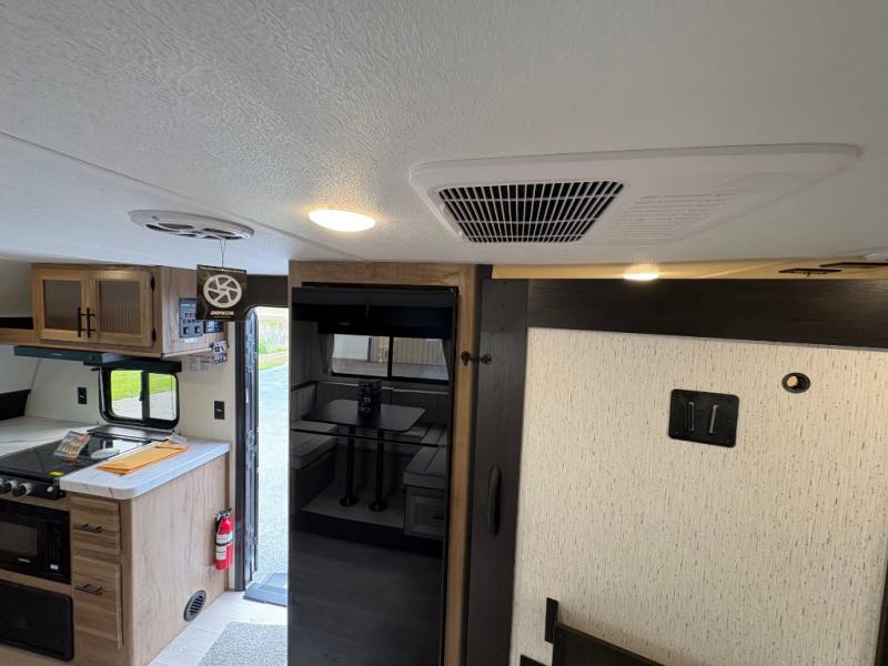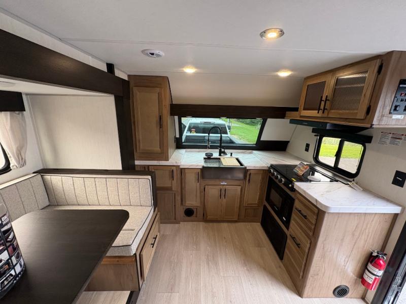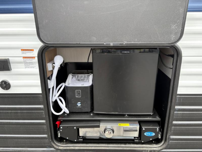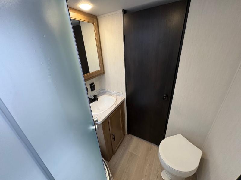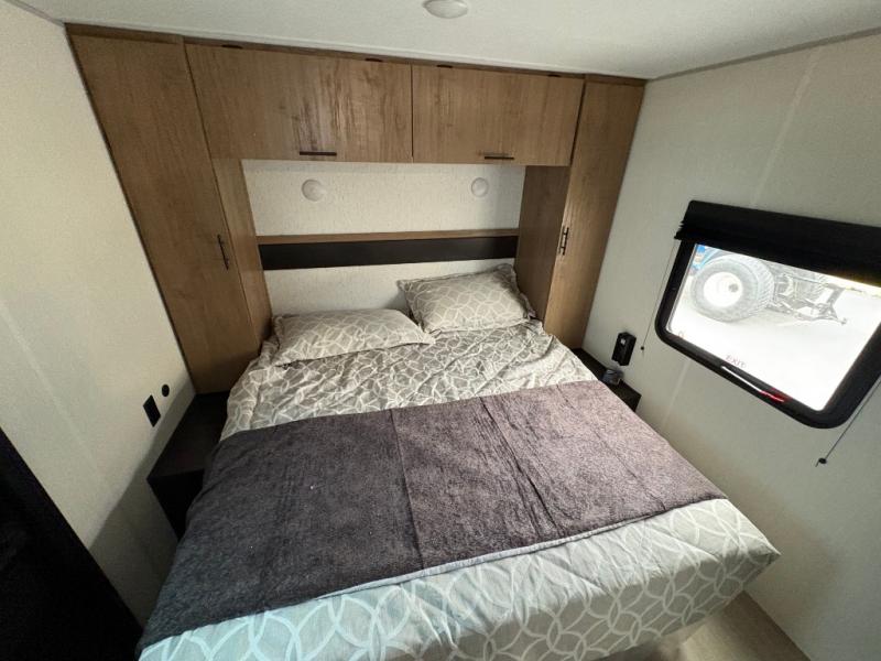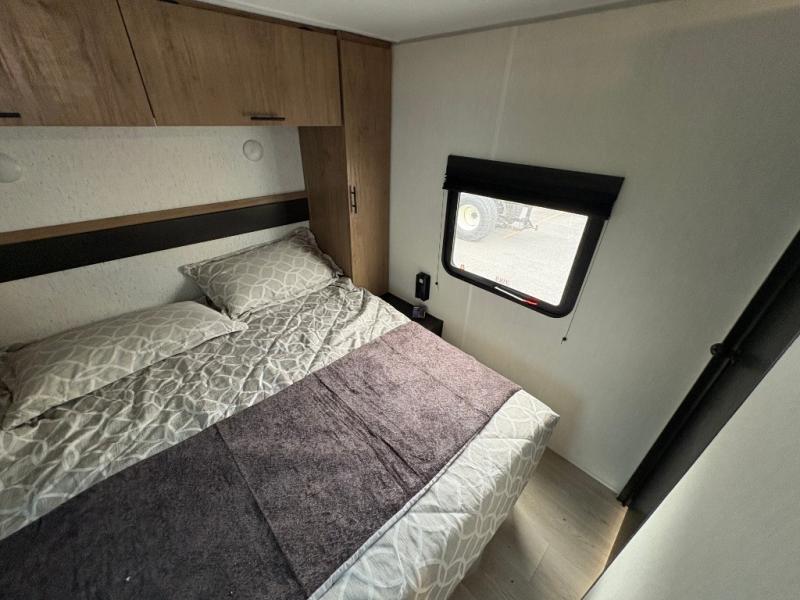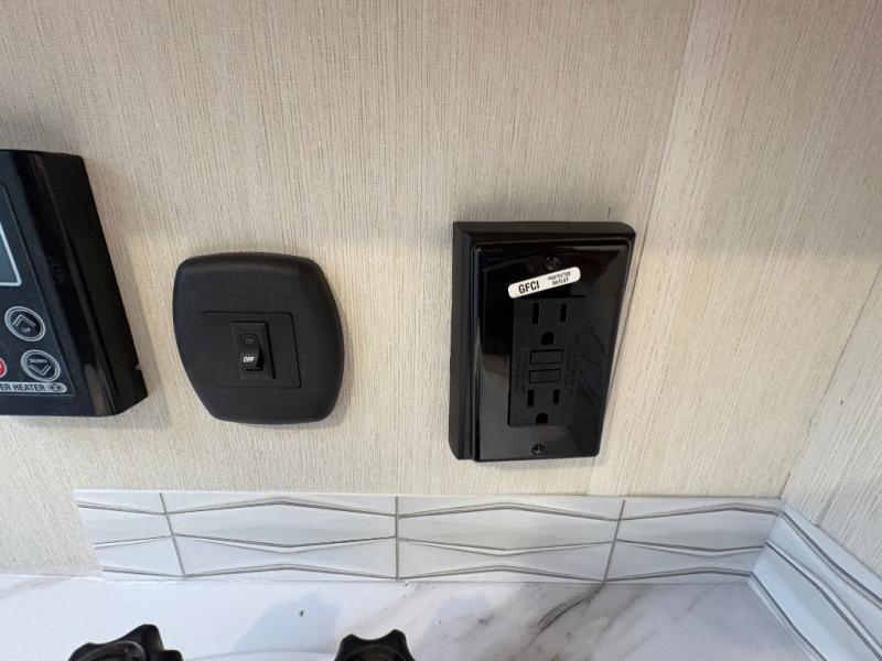 Since this travel trailer features dual entry doors, you can enter in through the rear master bedroom or the front kitchen; how convenient! The kitchen includes ample counter space and all the appliances to prep meals, along with a pantry up front and a hidden pantry behind the fireplace. Your crew can get comfortable on the sofa or play a game around the U-shaped dinette, although you may just find yourselves outdoors since there is an outside kitchen and a power awning with LED lights. The dual entry bath will let you enter in through the main living area, plus it has a private entrance into the bedroom. Here, you'll find an RV king bed, dual wardrobes for your things, and USB ports to keep your electronics charged!