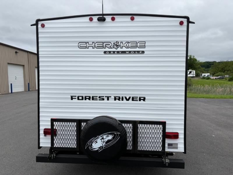 Whether it's a journey that will take you to new locations or a tried-and-true getaway to that favorite and memorable destination, the Forest River Cherokee Grey Wolf travel trailers and toy haulers are going to make the trip worth it every single time! You can travel in confidence with the premium wheel package, seamless roofing membrane with heat reflectivity, Power Gear frame technology with space-saver rail design, and Cherokee back-up camera system. The Cherokee Grey Wolf's interior is highly attractive with its stainless steel kitchen suite package and premium bedding ensemble and comforter. You will also find a black waste tank flush-out kit, an outside shower with hot and cold water, an armored underbelly tank enclosure, and an RV grill quick connect.
