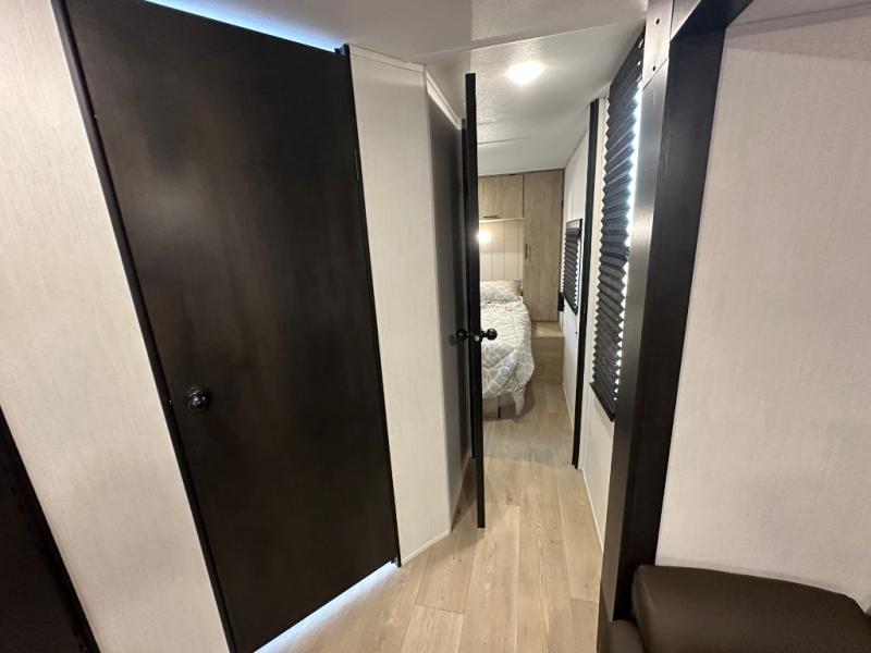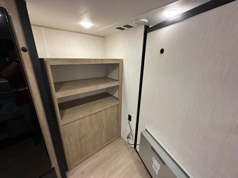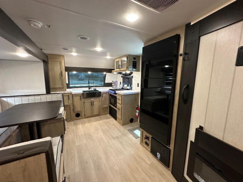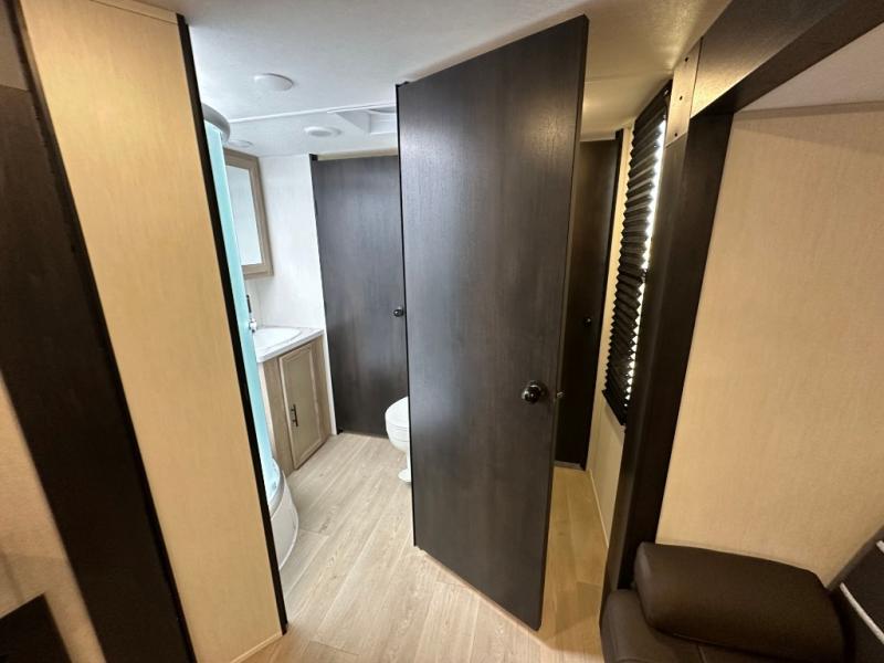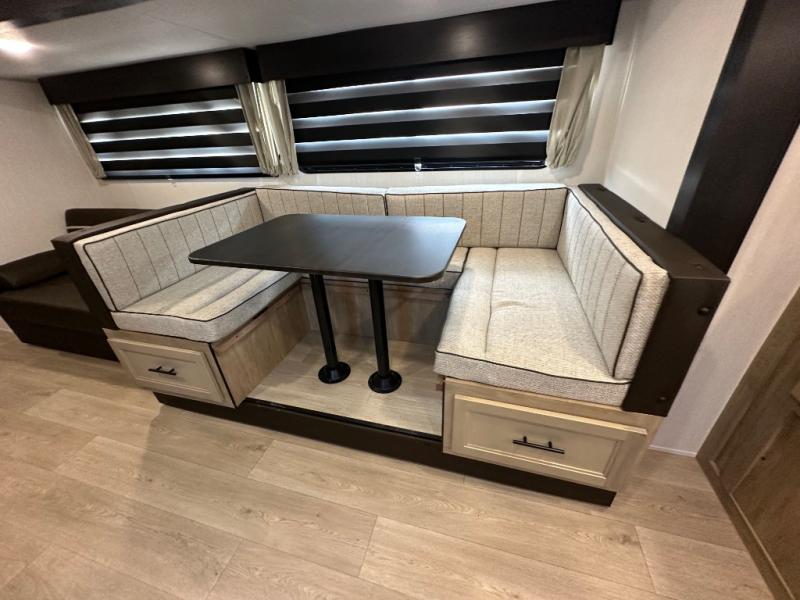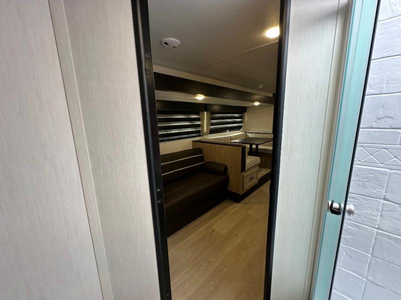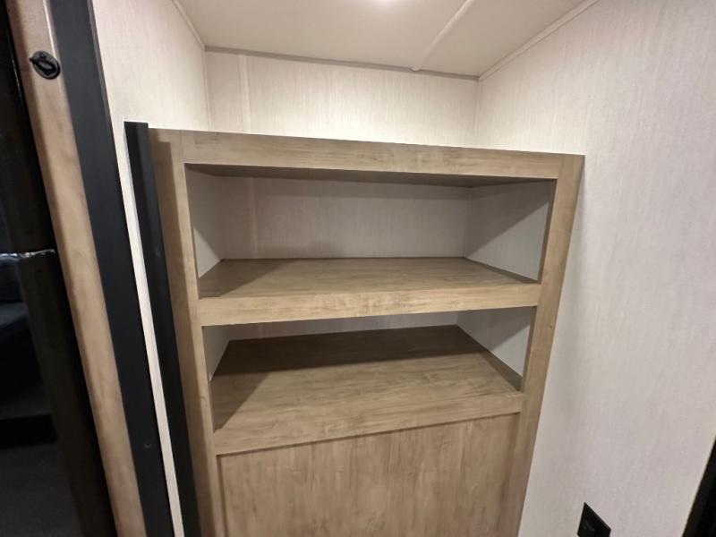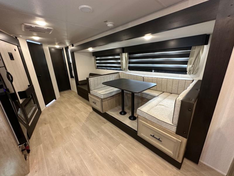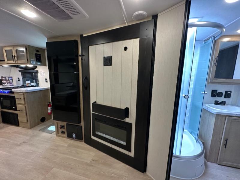 Since this travel trailer features dual entry doors, you can enter in through the rear master bedroom or the front kitchen; how convenient! The kitchen includes ample counter space and all the appliances to prep meals, along with a pantry up front and a hidden pantry behind the fireplace. Your crew can get comfortable on the sofa or play a game around the U-shaped dinette, although you may just find yourselves outdoors since there is an outside kitchen and a power awning with LED lights. The dual entry bath will let you enter in through the main living area, plus it has a private entrance into the bedroom. Here, you'll find an RV king bed, a wardrobe for your things, and USB ports to keep your electronics charged!