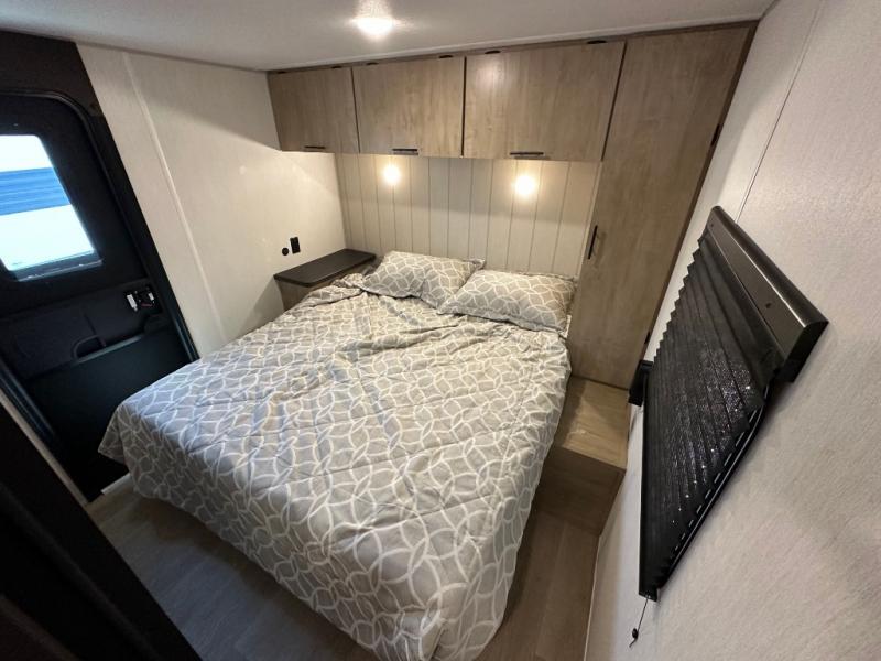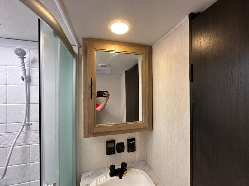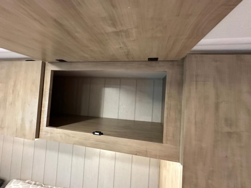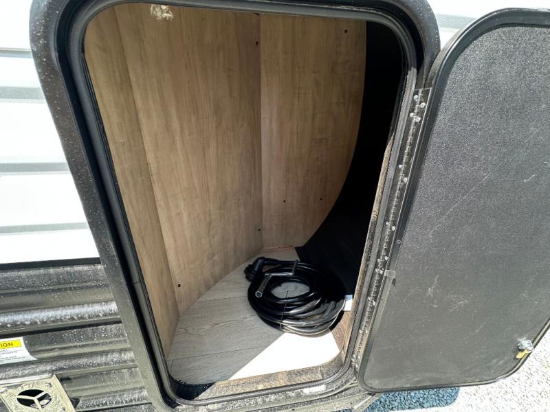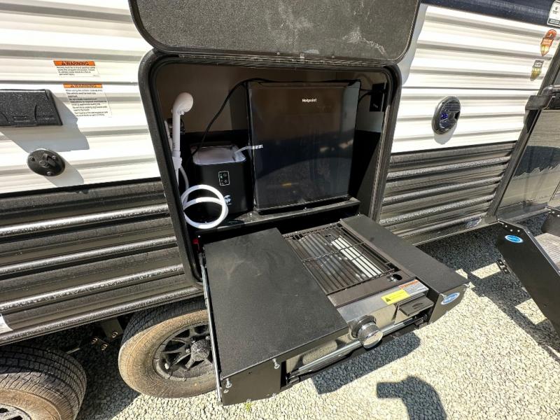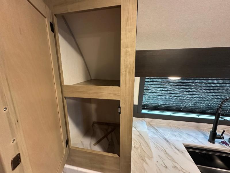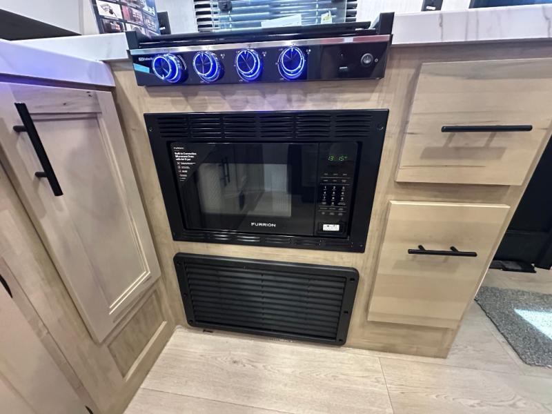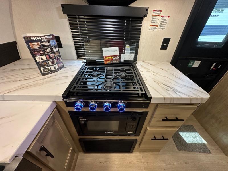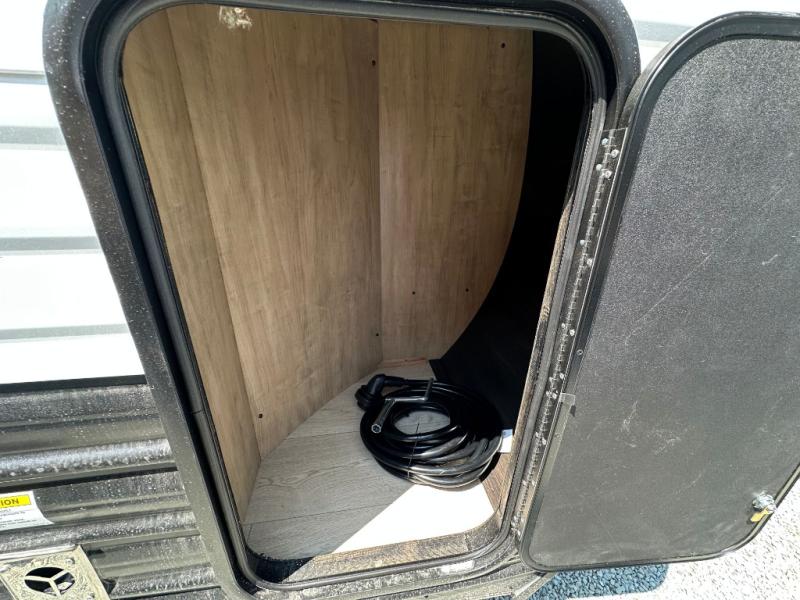 Since this travel trailer features dual entry doors, you can enter in through the rear master bedroom or the front kitchen; how convenient! The kitchen includes ample counter space and all the appliances to prep meals, along with a pantry up front and a hidden pantry behind the fireplace. Your crew can get comfortable on the sofa or play a game around the U-shaped dinette, although you may just find yourselves outdoors since there is an outside kitchen and a power awning with LED lights. The dual entry bath will let you enter in through the main living area, plus it has a private entrance into the bedroom. Here, you'll find an RV king bed, a wardrobe for your things, and USB ports to keep your electronics charged!