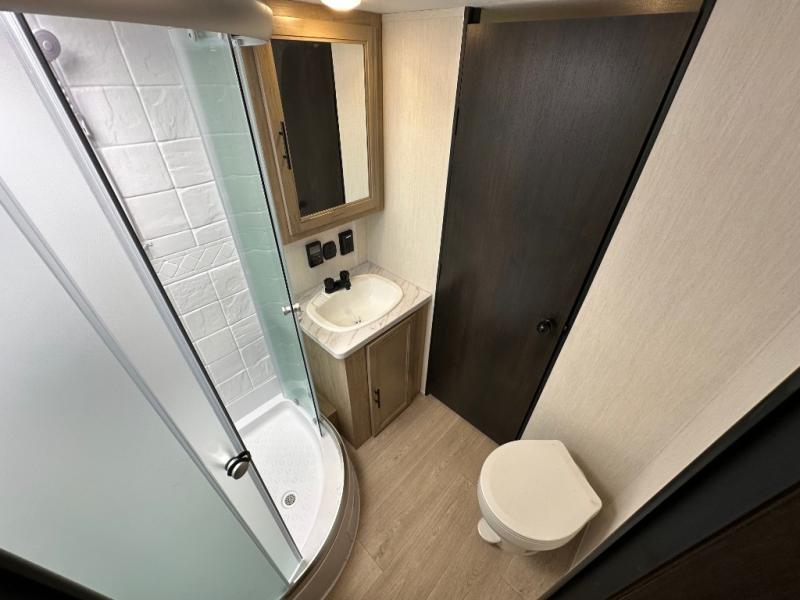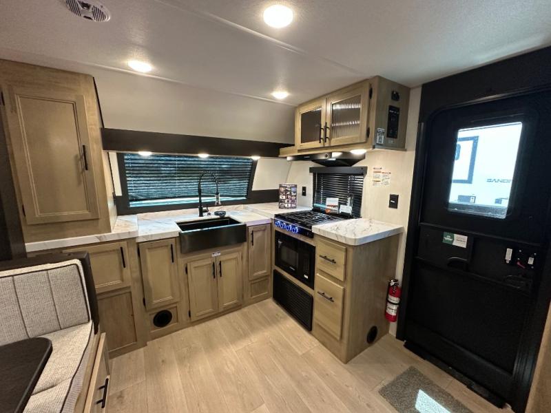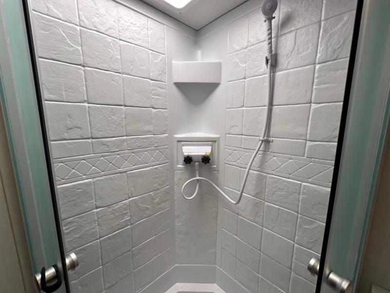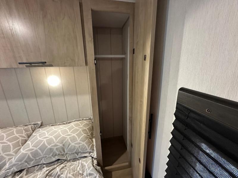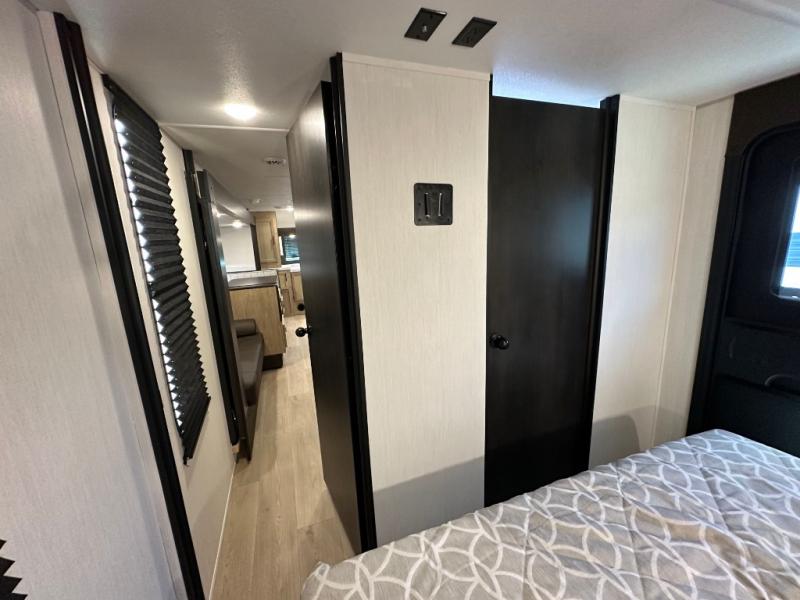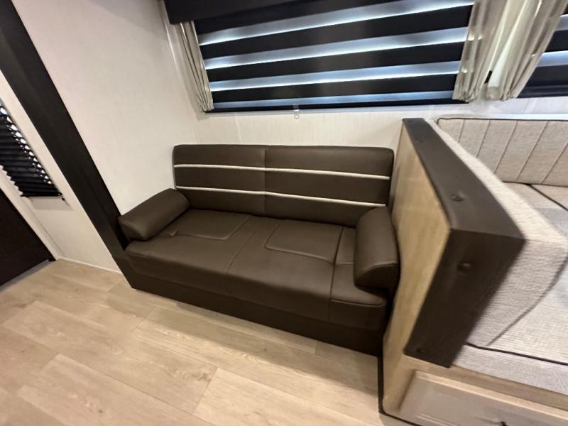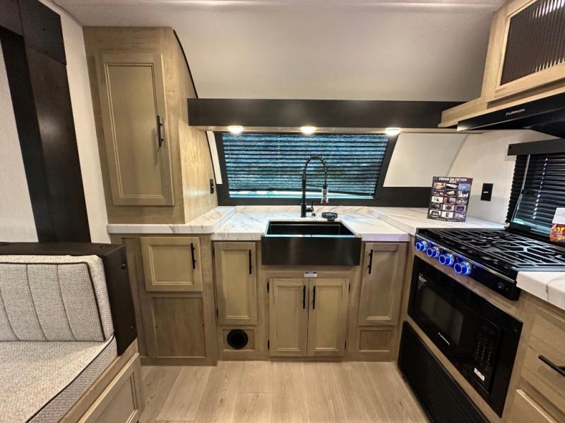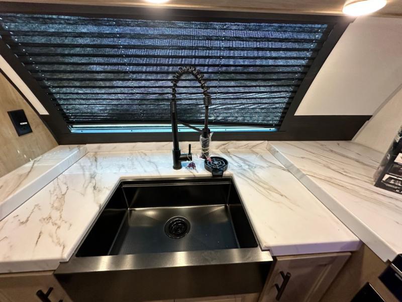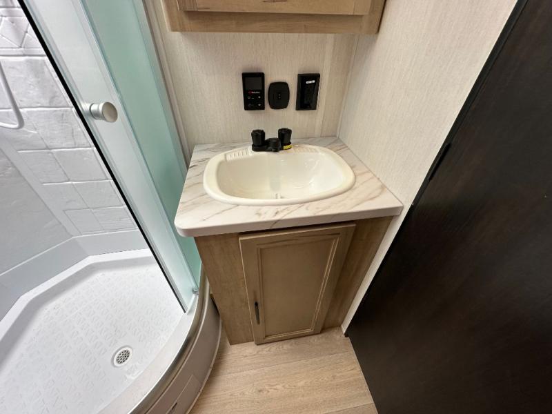 Since this travel trailer features dual entry doors, you can enter in through the rear master bedroom or the front kitchen; how convenient! The kitchen includes ample counter space and all the appliances to prep meals, along with a pantry up front and a hidden pantry behind the fireplace. Your crew can get comfortable on the sofa or play a game around the U-shaped dinette, although you may just find yourselves outdoors since there is an outside kitchen and a power awning with LED lights. The dual entry bath will let you enter in through the main living area, plus it has a private entrance into the bedroom. Here, you'll find an RV king bed, a wardrobe for your things, and USB ports to keep your electronics charged!