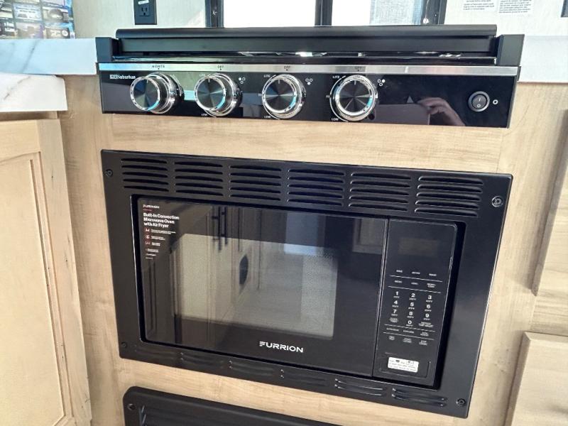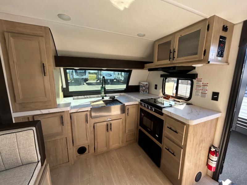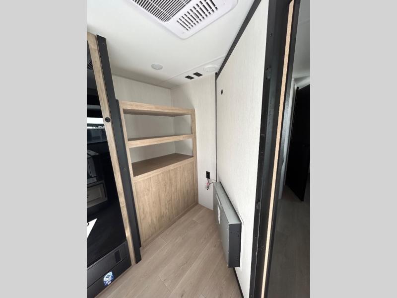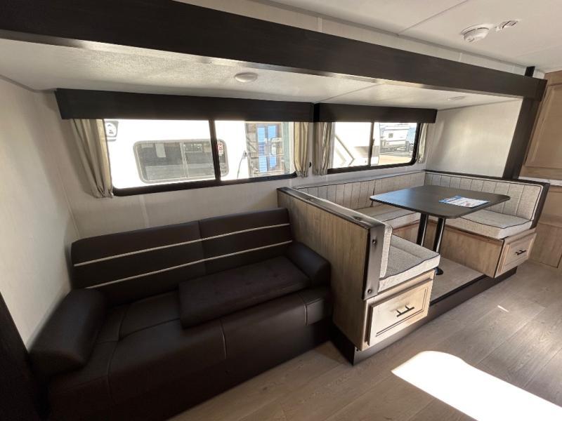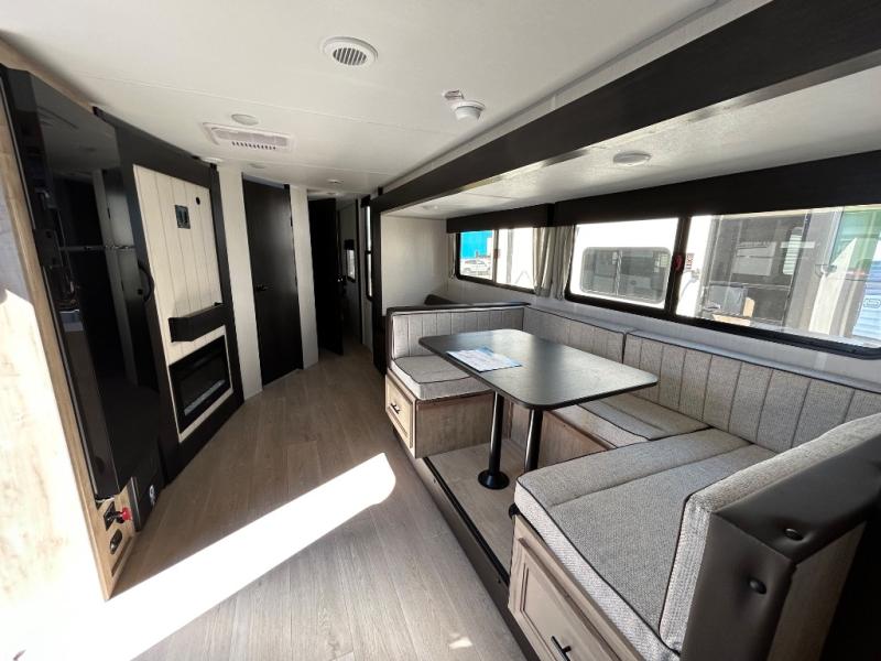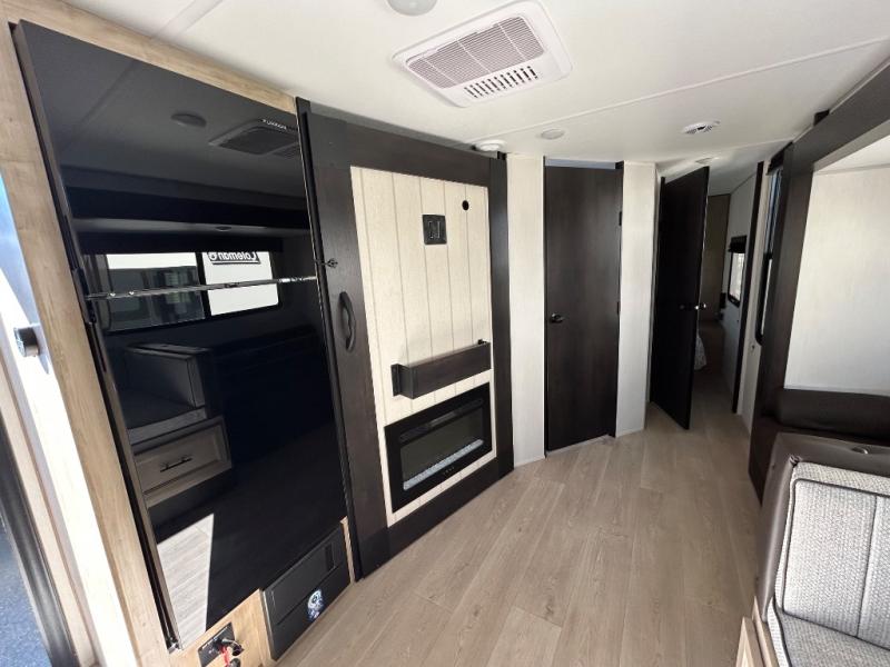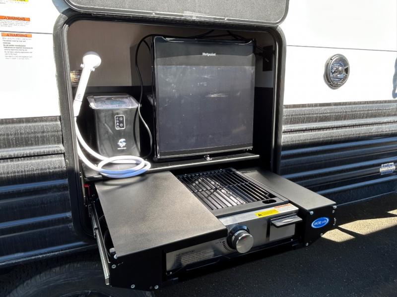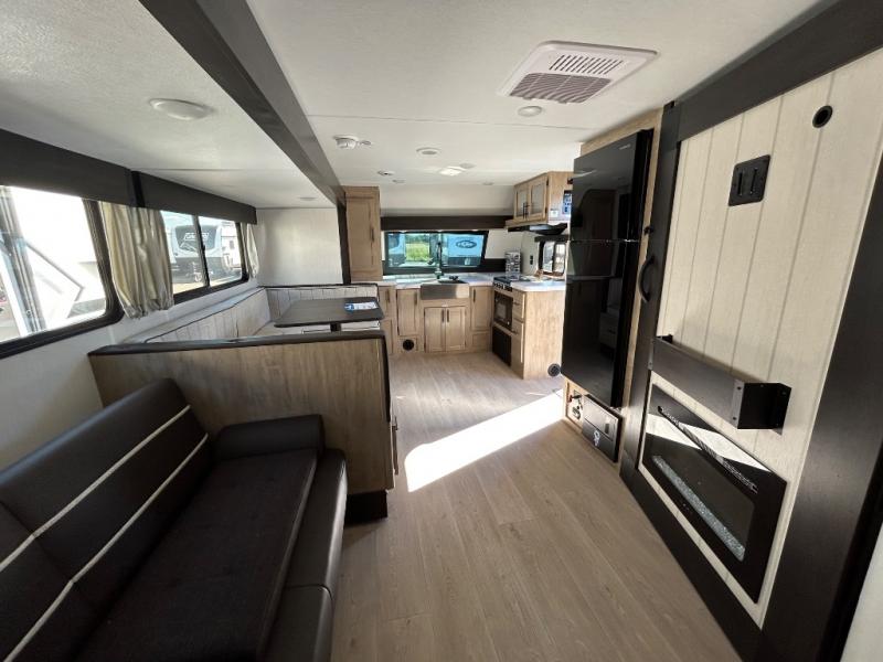 Since this travel trailer features dual entry doors, you can enter in through the rear master bedroom or the front kitchen; how convenient! The kitchen includes ample counter space and all the appliances to prep meals, along with a pantry up front and a hidden pantry behind the fireplace. Your crew can get comfortable on the sofa or play a game around the U-shaped dinette, although you may just find yourselves outdoors since there is an outside kitchen and a power awning with LED lights. The dual entry bath will let you enter in through the main living area, plus it has a private entrance into the bedroom. Here, you'll find an RV king bed, a wardrobe for your things, and USB ports to keep your electronics charged!