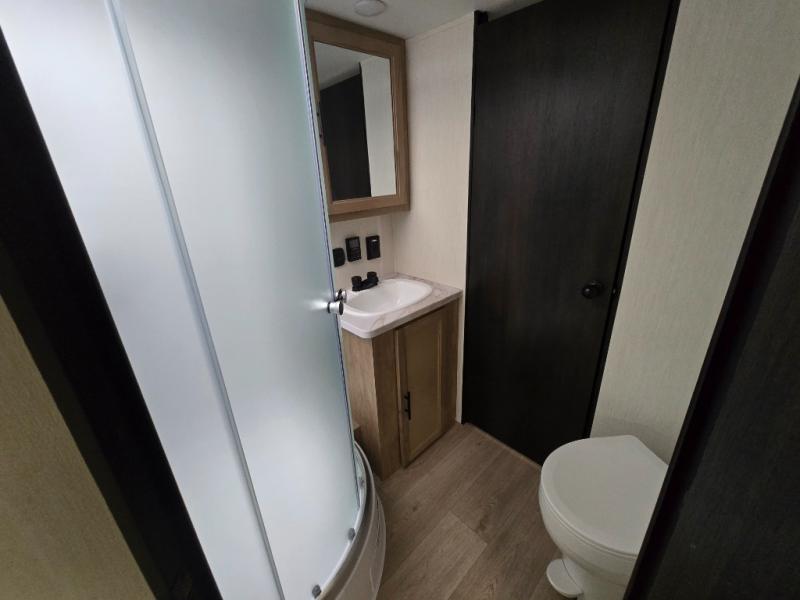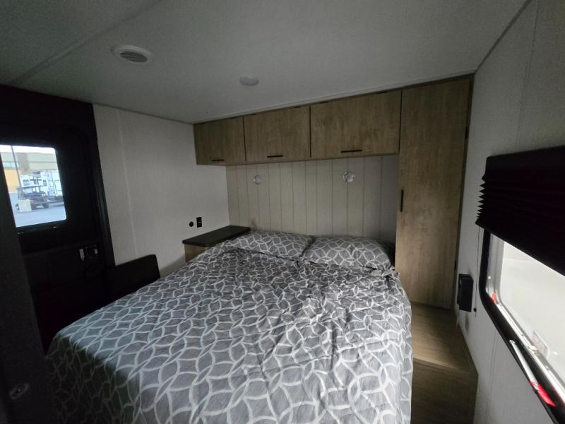 Since this travel trailer features dual entry doors, you can enter in through the rear master bedroom or the front kitchen; how convenient! The kitchen includes ample counter space and all the appliances to prep meals, along with a pantry up front and a hidden pantry behind the fireplace. Your crew can get comfortable on the sofa or play a game around the U-shaped dinette, although you may just find yourselves outdoors since there is an outside kitchen and a power awning with LED lights. The dual entry bath will let you enter in through the main living area, plus it has a private entrance into the bedroom. Here, you'll find an RV king bed, a wardrobe for your things, and USB ports to keep your electronics charged!