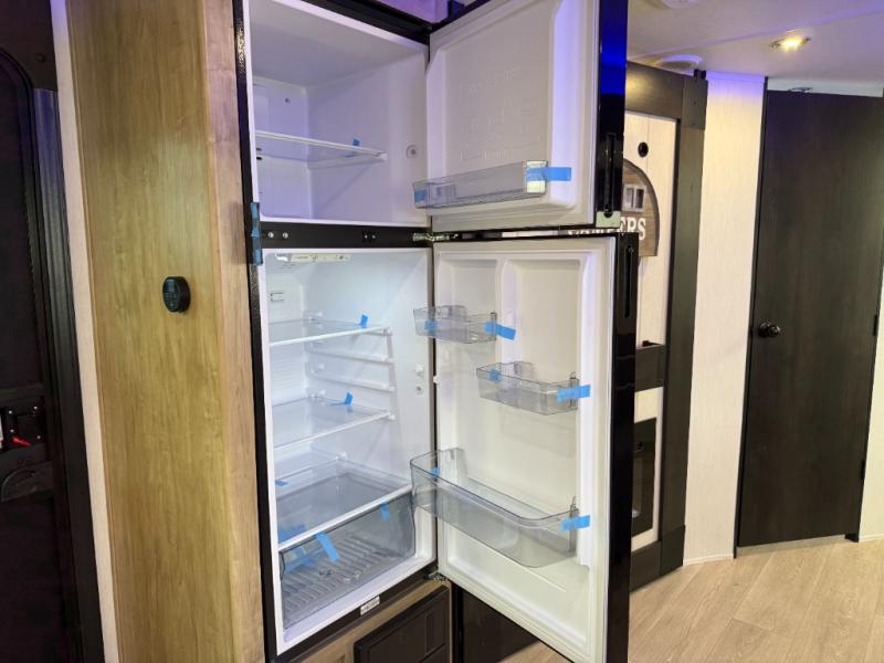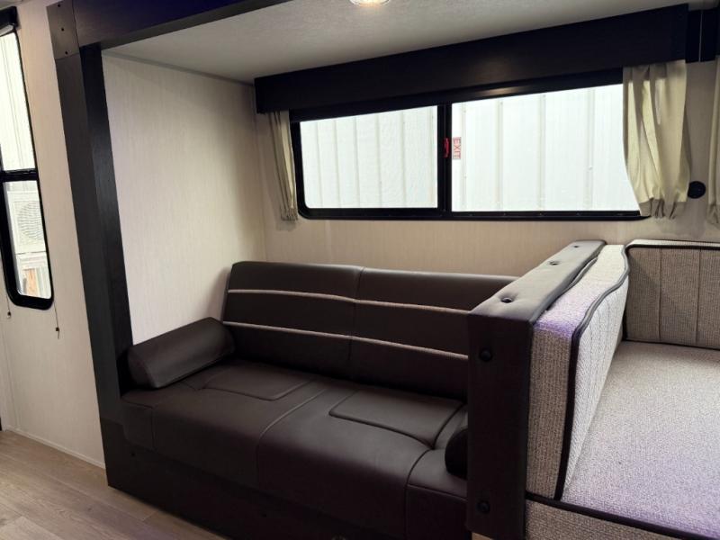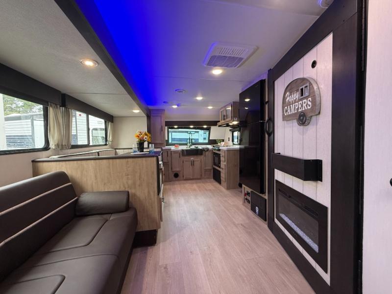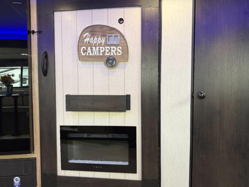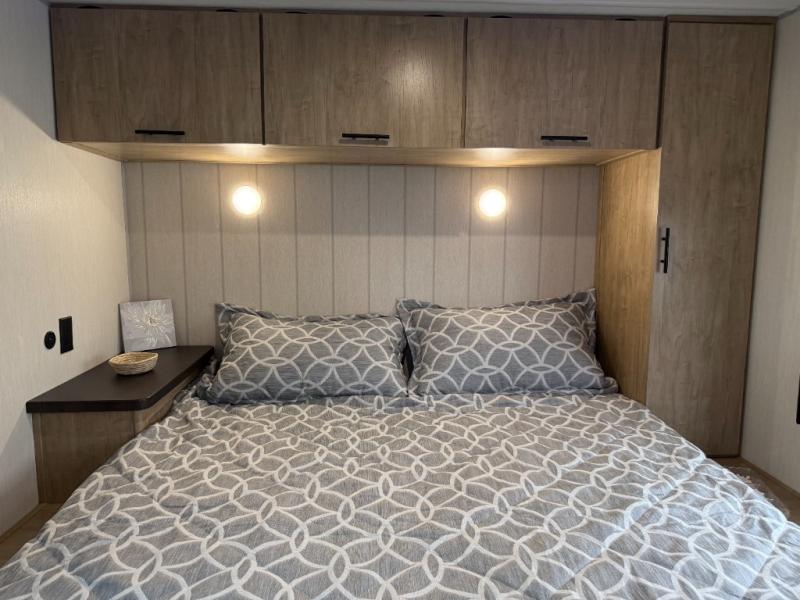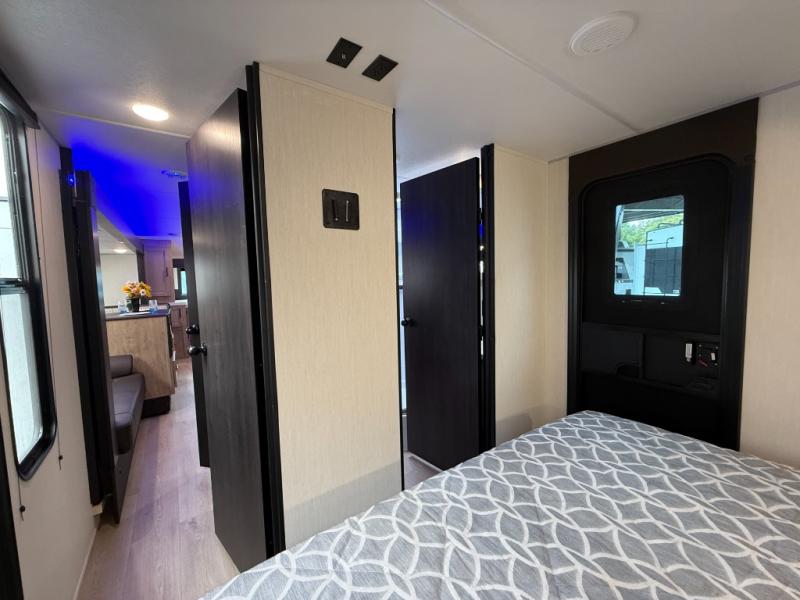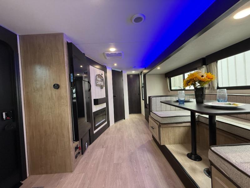 Since this travel trailer features dual entry doors, you can enter in through the rear master bedroom or the front kitchen; how convenient! The kitchen includes ample counter space and all the appliances to prep meals, along with a pantry up front and a hidden pantry behind the fireplace. Your crew can get comfortable on the sofa or play a game around the U-shaped dinette, although you may just find yourselves outdoors since there is an outside kitchen and a power awning with LED lights. The dual entry bath will let you enter in through the main living area, plus it has a private entrance into the bedroom. Here, you'll find an RV king bed, a wardrobe for your things, and USB ports to keep your electronics charged!