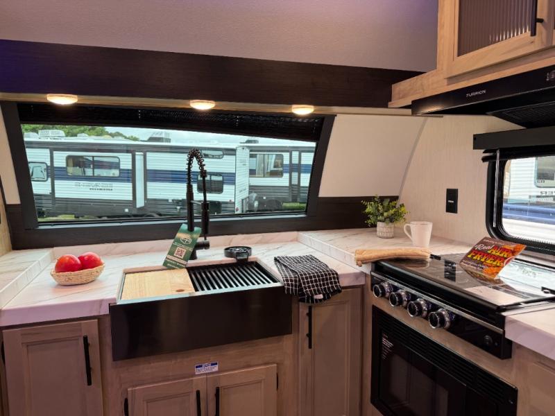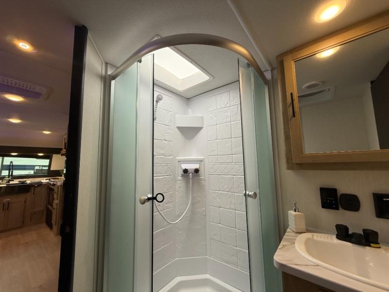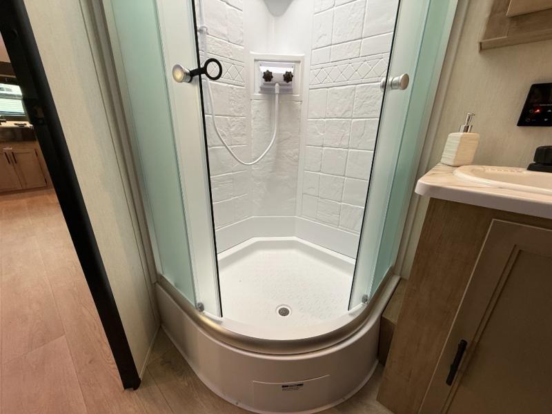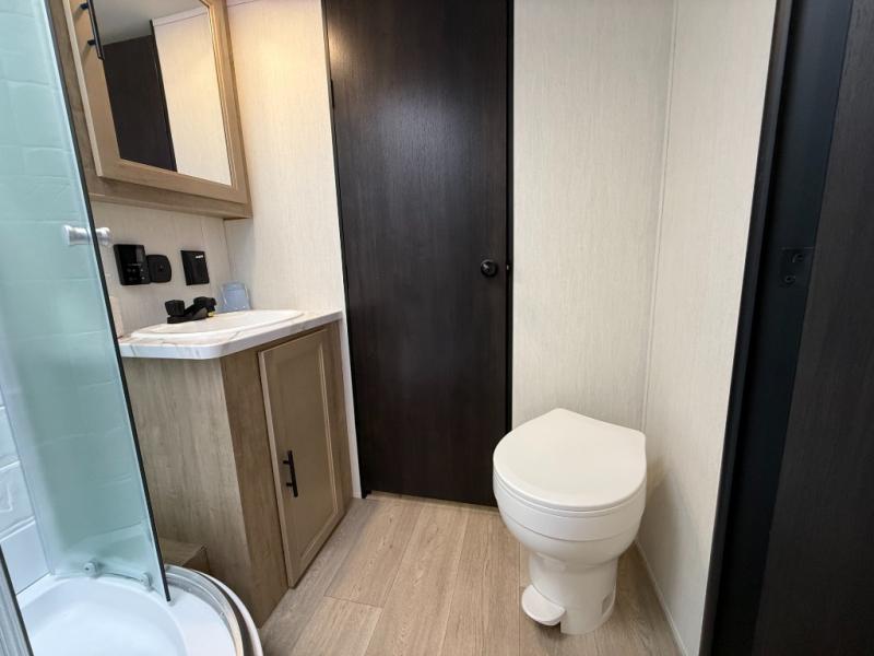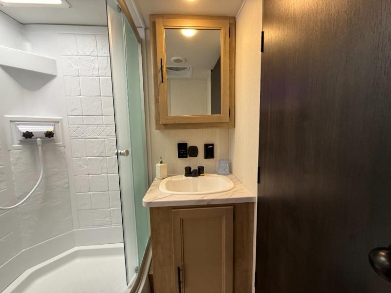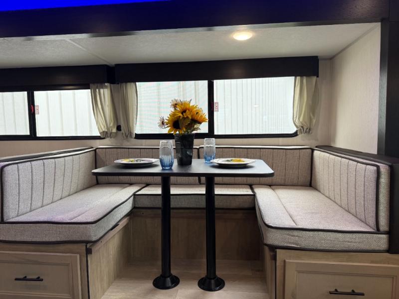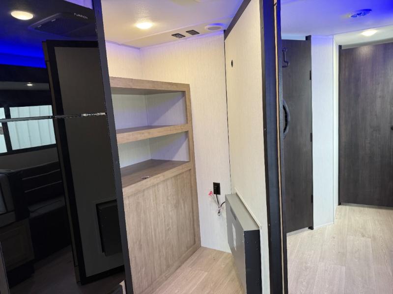 Since this travel trailer features dual entry doors, you can enter in through the rear master bedroom or the front kitchen; how convenient! The kitchen includes ample counter space and all the appliances to prep meals, along with a pantry up front and a hidden pantry behind the fireplace. Your crew can get comfortable on the sofa or play a game around the U-shaped dinette, although you may just find yourselves outdoors since there is an outside kitchen and a power awning with LED lights. The dual entry bath will let you enter in through the main living area, plus it has a private entrance into the bedroom. Here, you'll find an RV king bed, a wardrobe for your things, and USB ports to keep your electronics charged!