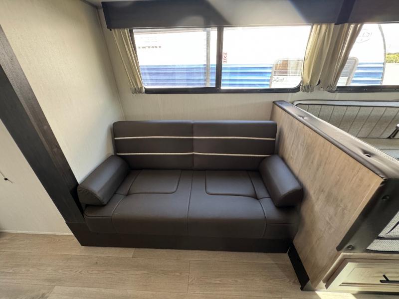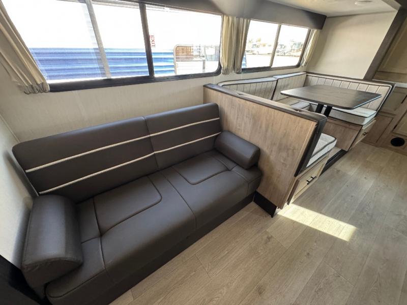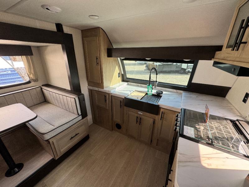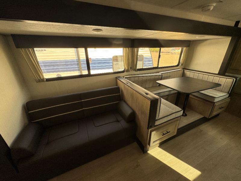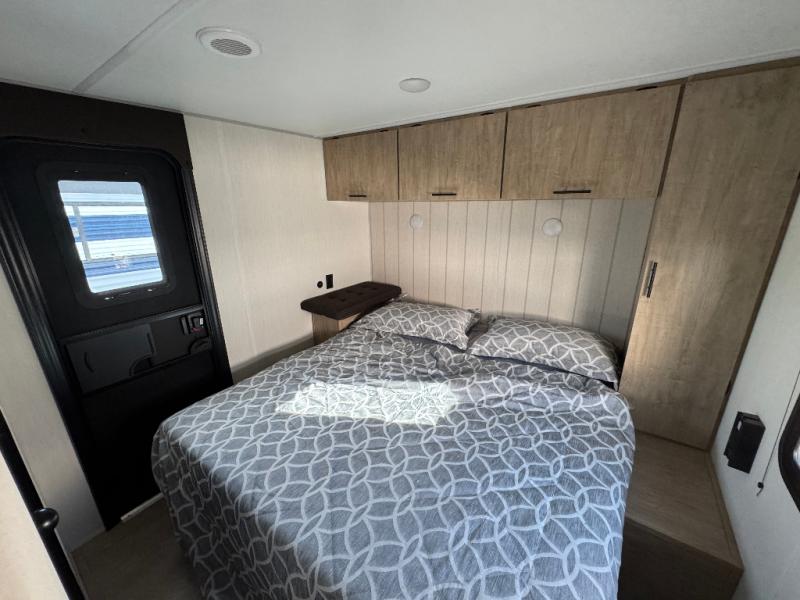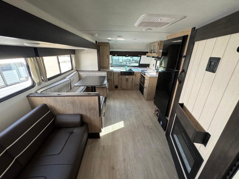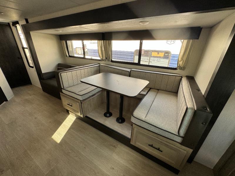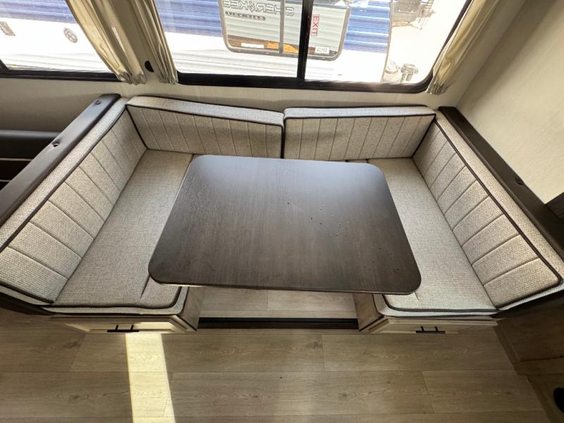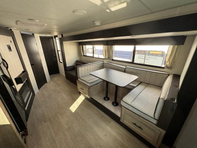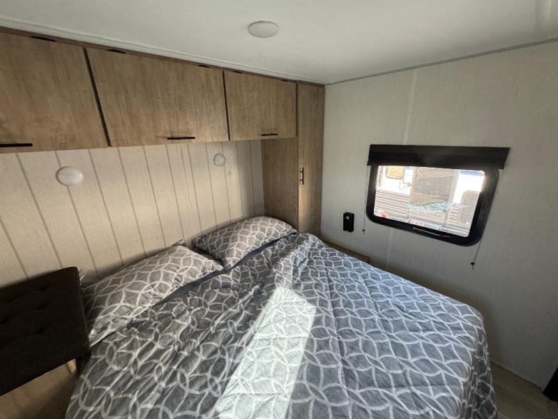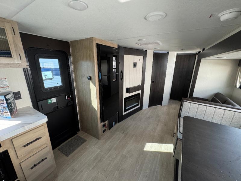 Since this travel trailer features dual entry doors, you can enter in through the rear master bedroom or the front kitchen; how convenient! The kitchen includes ample counter space and all the appliances to prep meals, along with a pantry up front and a hidden pantry behind the fireplace. Your crew can get comfortable on the sofa or play a game around the U-shaped dinette, although you may just find yourselves outdoors since there is an outside kitchen and a power awning with LED lights. The dual entry bath will let you enter in through the main living area, plus it has a private entrance into the bedroom. Here, you'll find an RV king bed, a wardrobe for your things, and USB ports to keep your electronics charged!