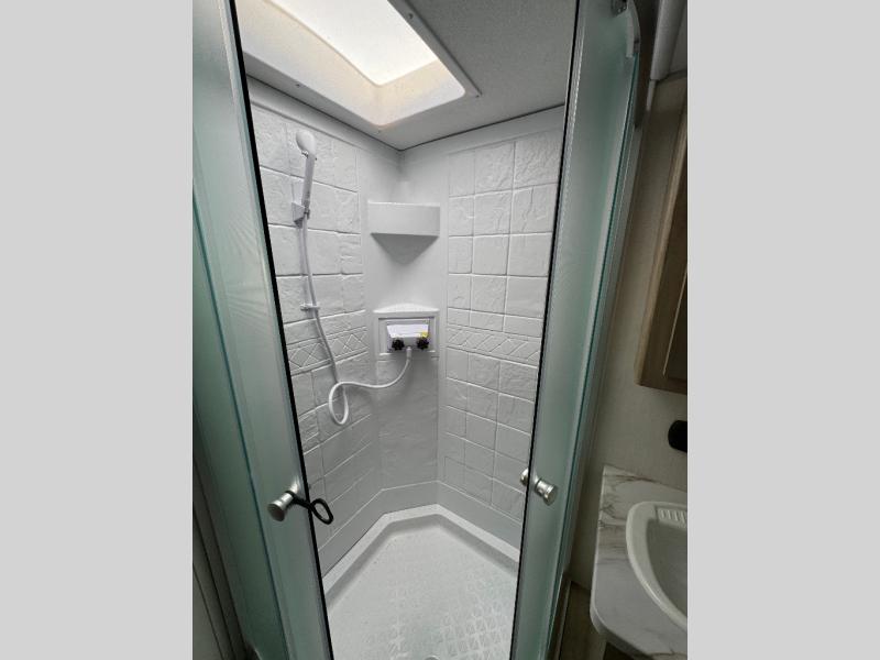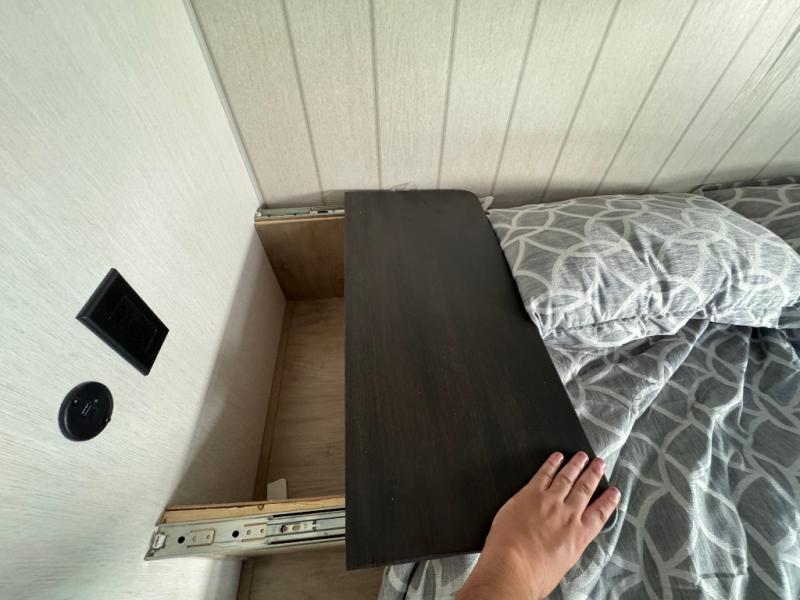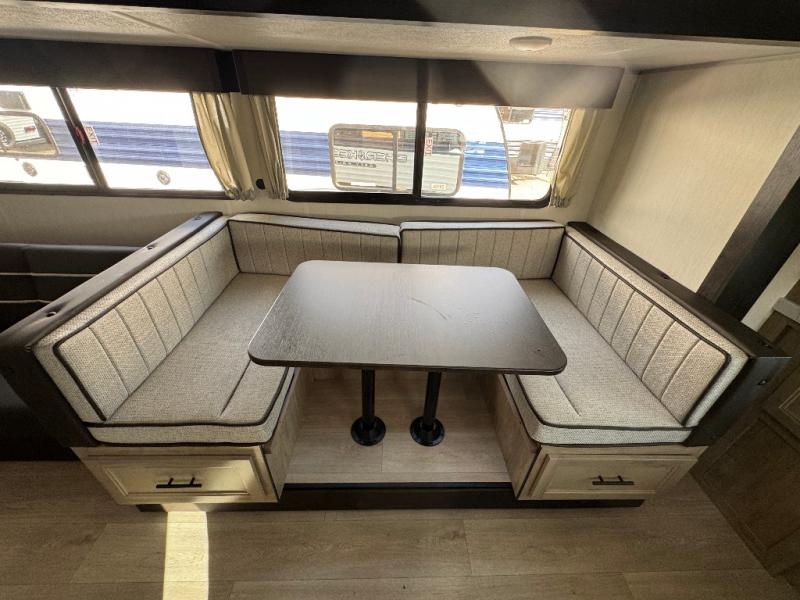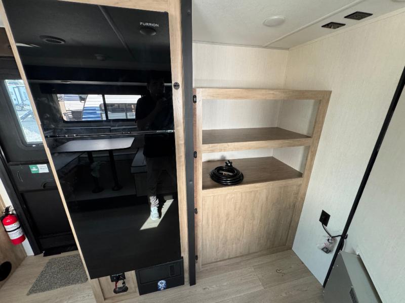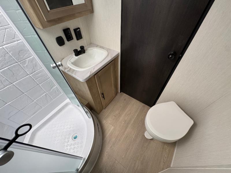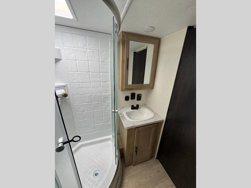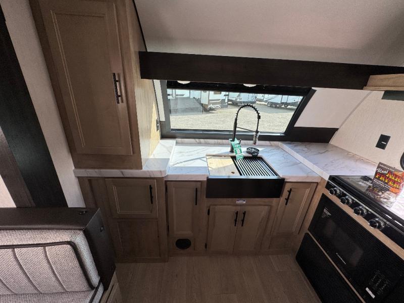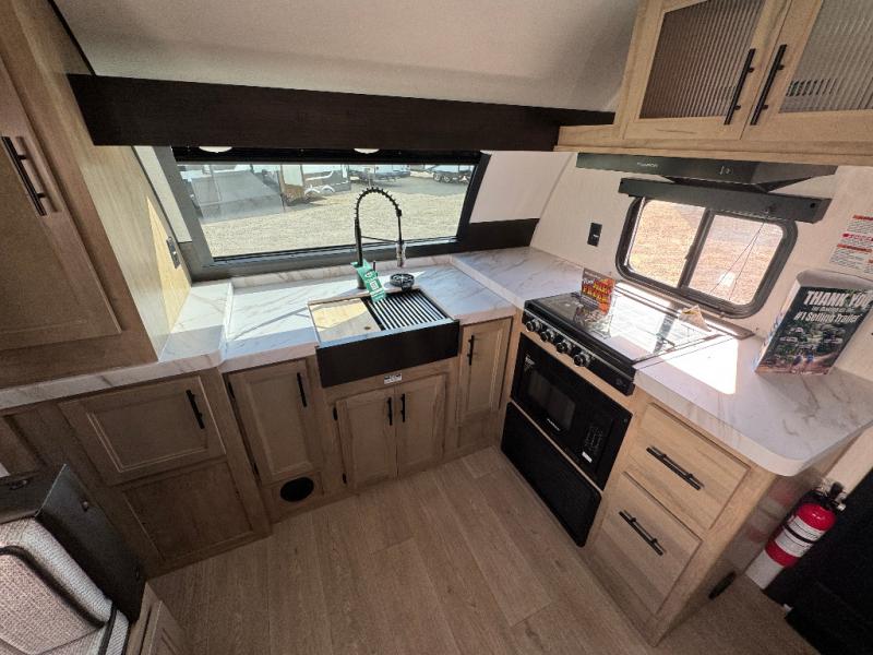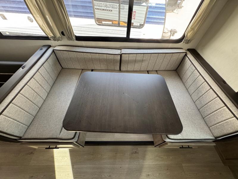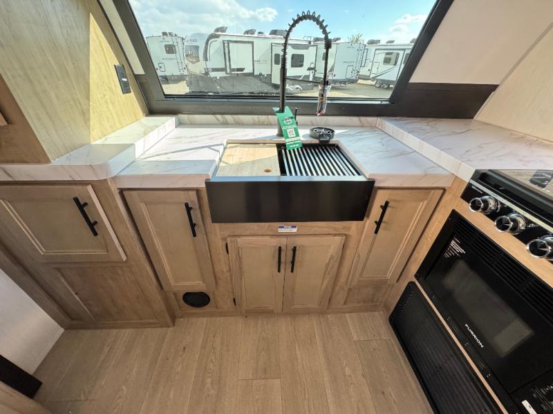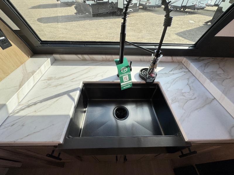 Since this travel trailer features dual entry doors, you can enter in through the rear master bedroom or the front kitchen; how convenient! The kitchen includes ample counter space and all the appliances to prep meals, along with a pantry up front and a hidden pantry behind the fireplace. Your crew can get comfortable on the sofa or play a game around the U-shaped dinette, although you may just find yourselves outdoors since there is an outside kitchen and a power awning with LED lights. The dual entry bath will let you enter in through the main living area, plus it has a private entrance into the bedroom. Here, you'll find an RV king bed, a wardrobe for your things, and USB ports to keep your electronics charged!