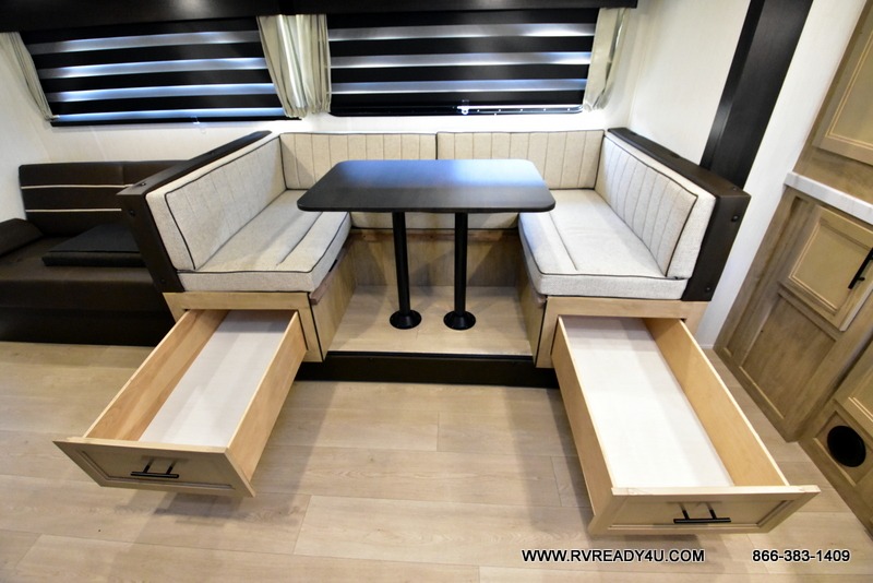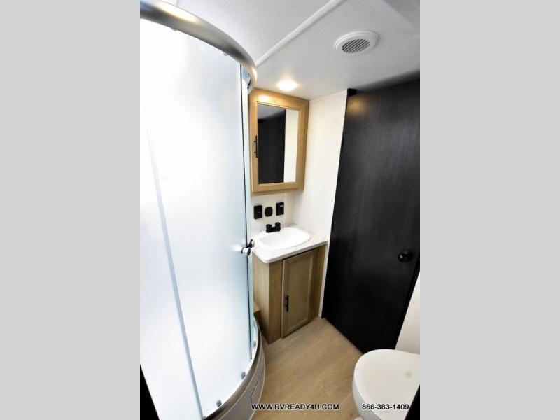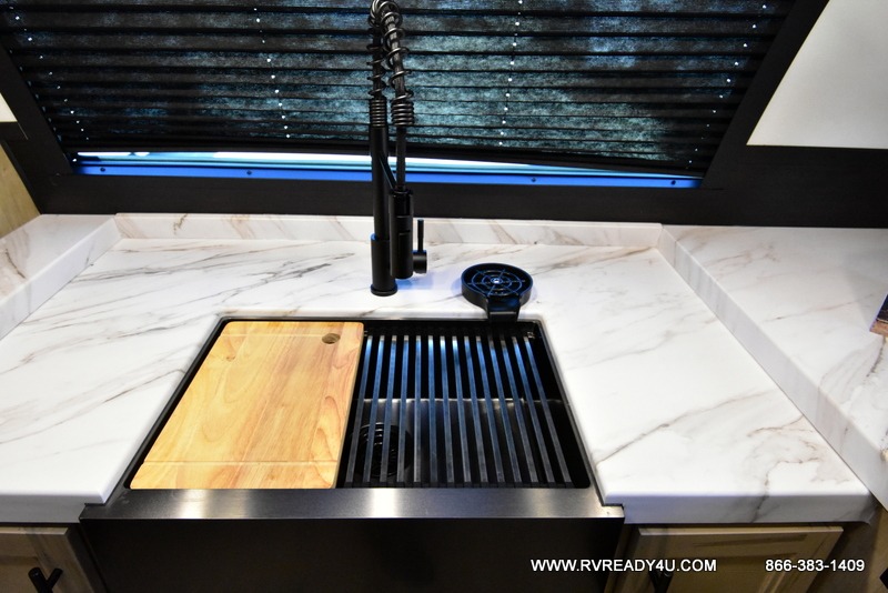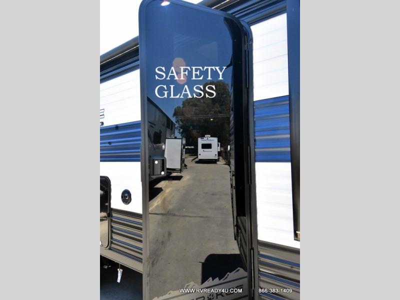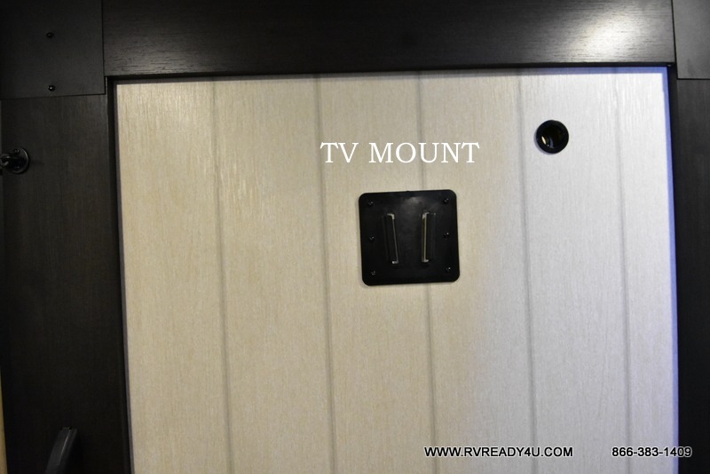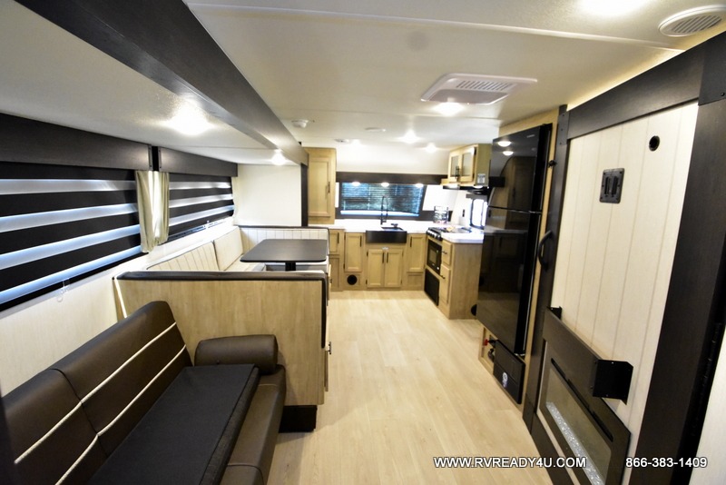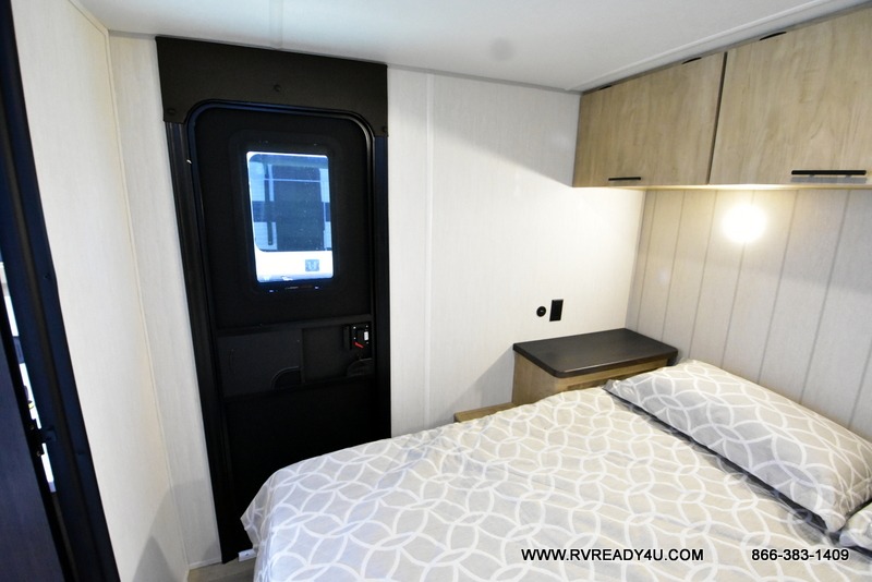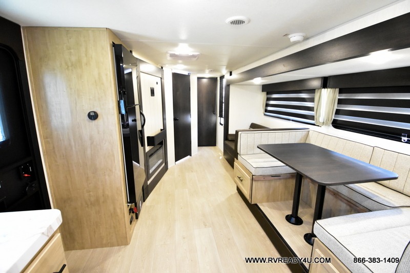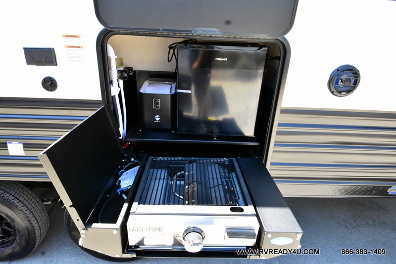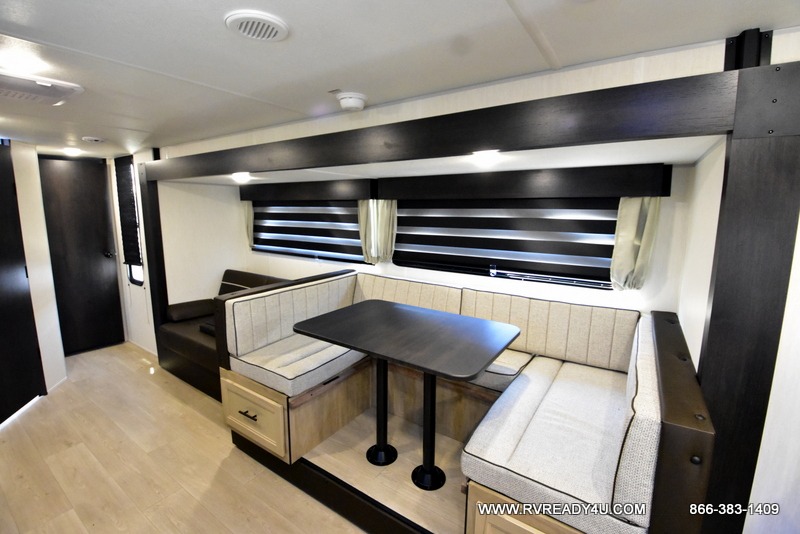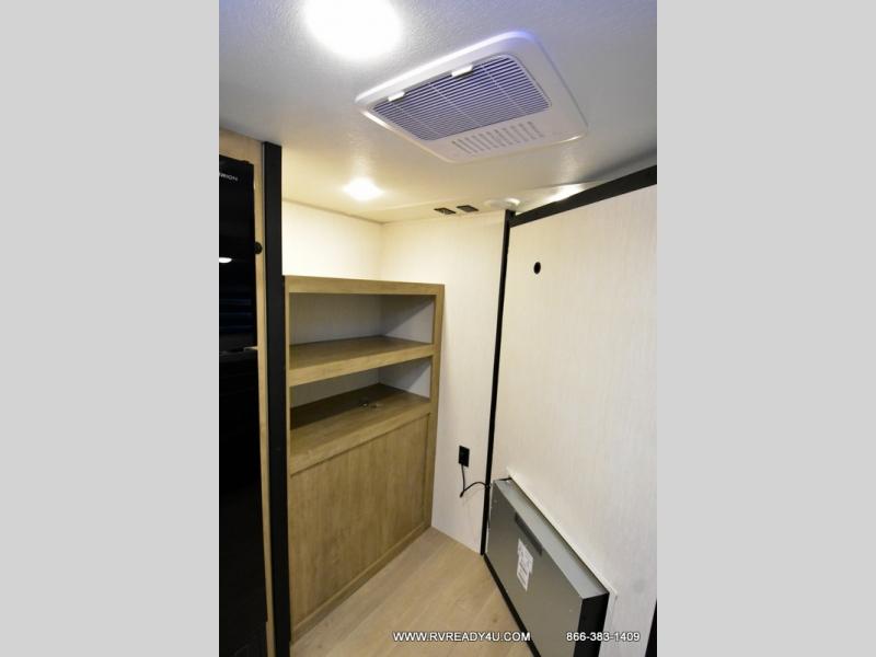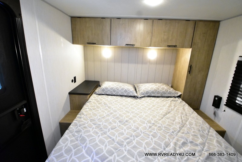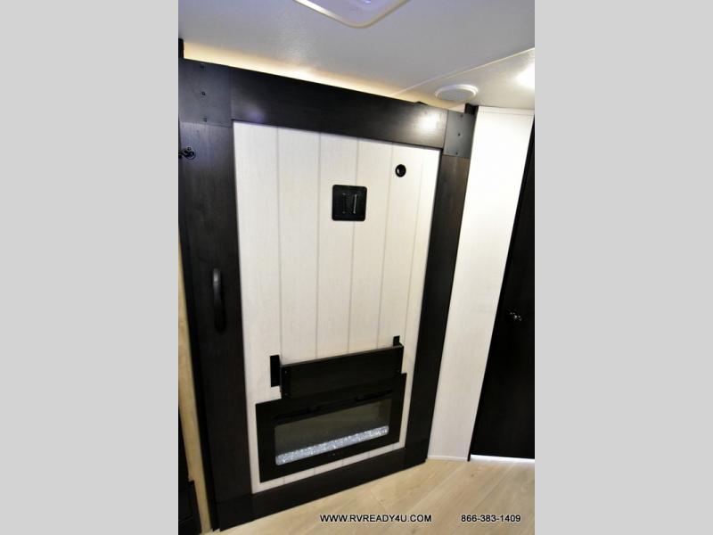 Since this travel trailer features dual entry doors, you can enter in through the rear master bedroom or the front kitchen; how convenient! The kitchen includes ample counter space and all the appliances to prep meals, along with a pantry up front and a hidden pantry behind the fireplace. Your crew can get comfortable on the sofa or play a game around the U-shaped dinette, although you may just find yourselves outdoors since there is an outside kitchen and a power awning with LED lights. The dual entry bath will let you enter in through the main living area, plus it has a private entrance into the bedroom. Here, you'll find an RV king bed, a wardrobe for your things, and USB ports to keep your electronics charged!