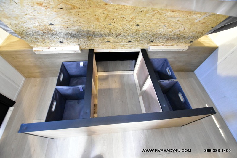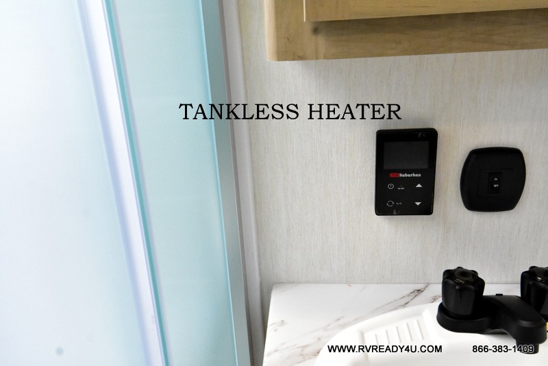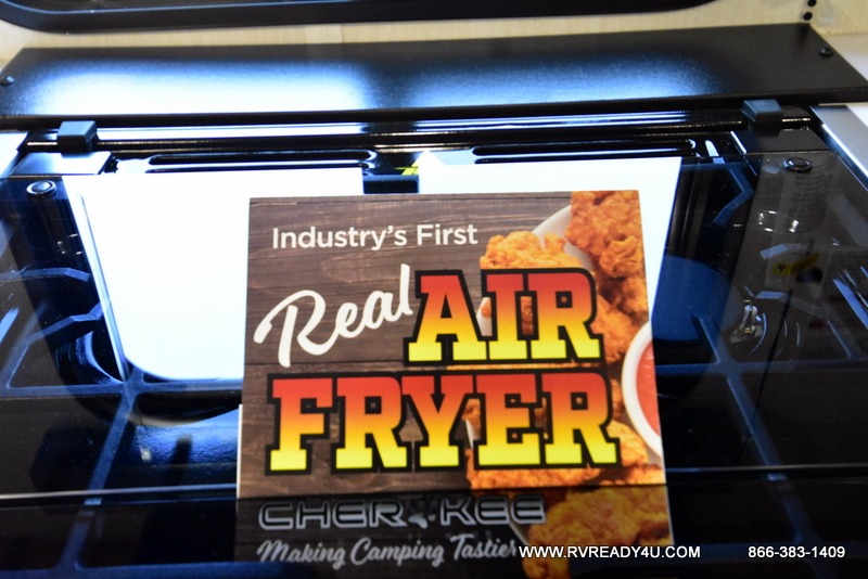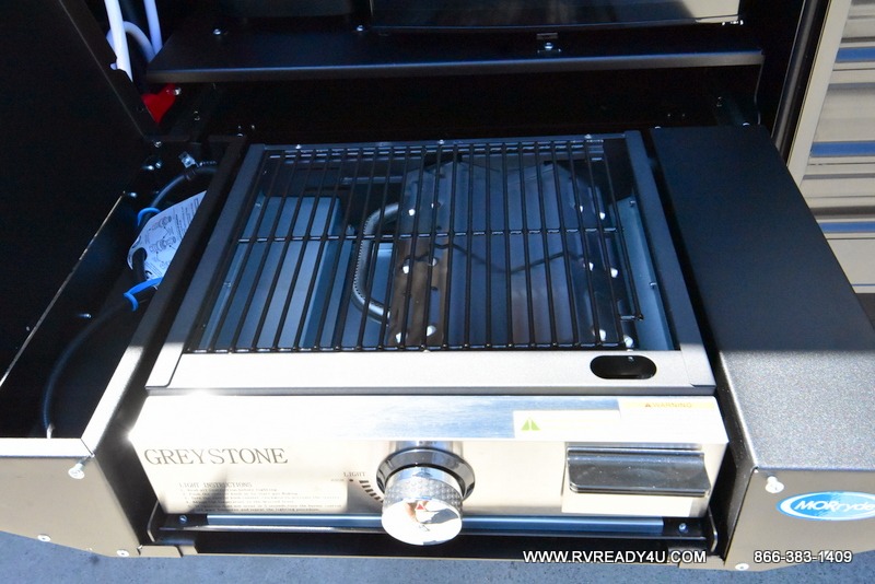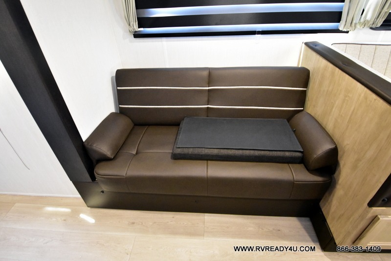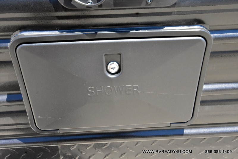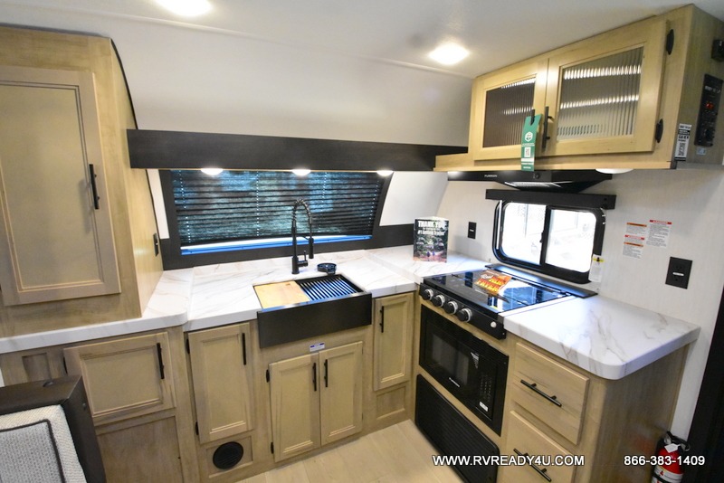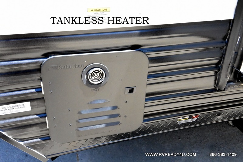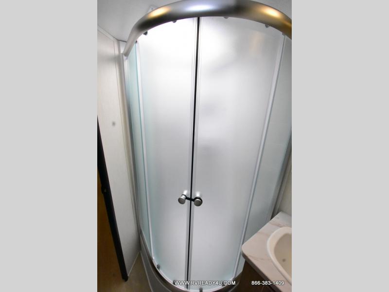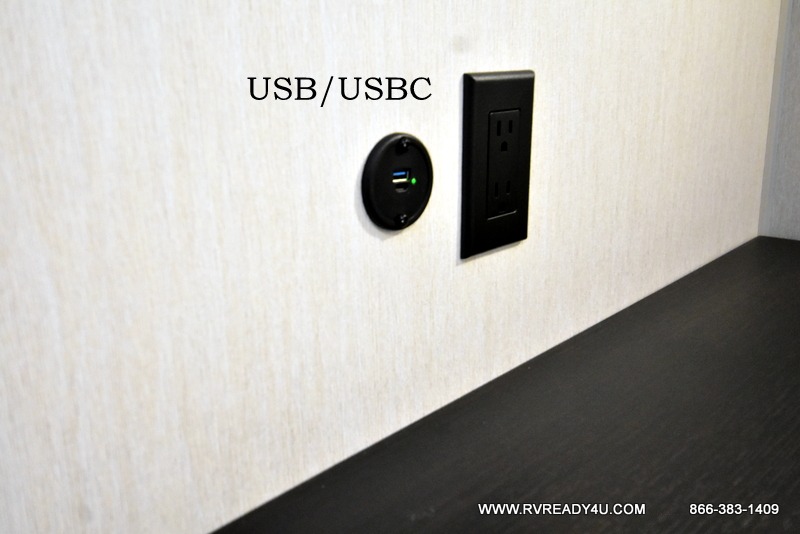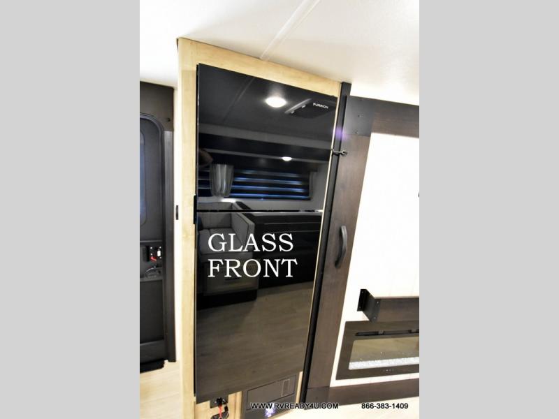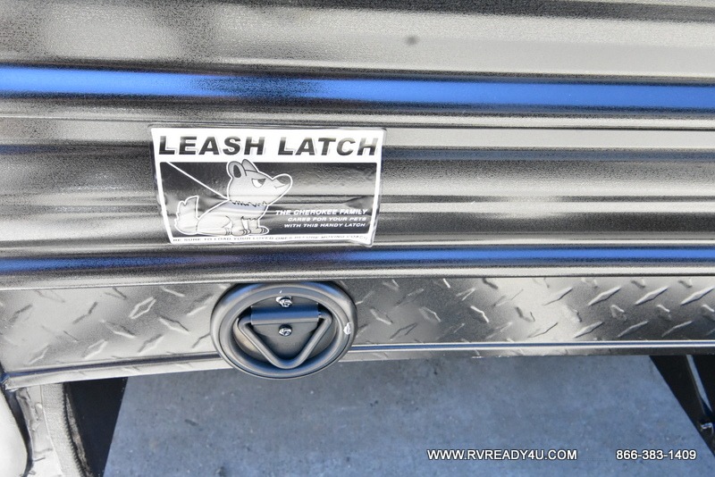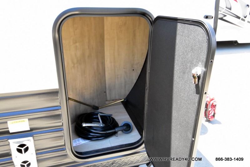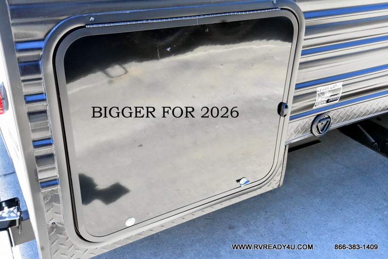 Since this travel trailer features dual entry doors, you can enter in through the rear master bedroom or the front kitchen; how convenient! The kitchen includes ample counter space and all the appliances to prep meals, along with a pantry up front and a hidden pantry behind the fireplace. Your crew can get comfortable on the sofa or play a game around the U-shaped dinette, although you may just find yourselves outdoors since there is an outside kitchen and a power awning with LED lights. The dual entry bath will let you enter in through the main living area, plus it has a private entrance into the bedroom. Here, you'll find an RV king bed, a wardrobe for your things, and USB ports to keep your electronics charged!