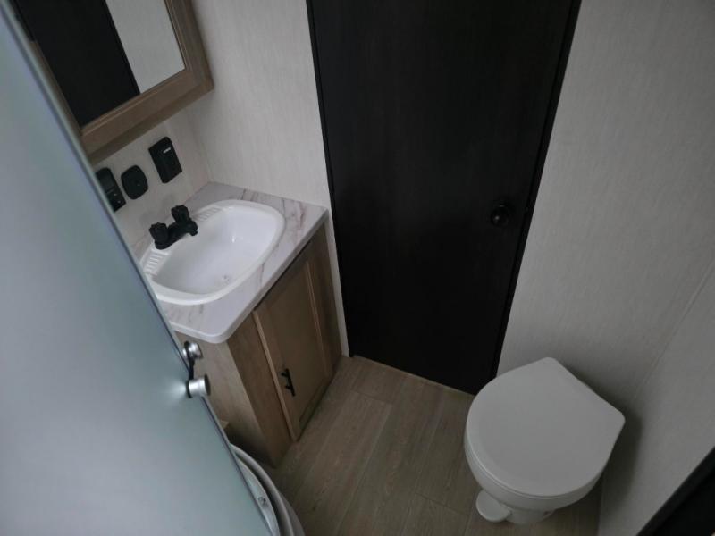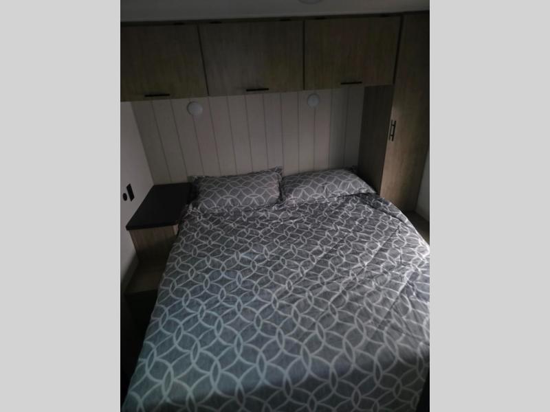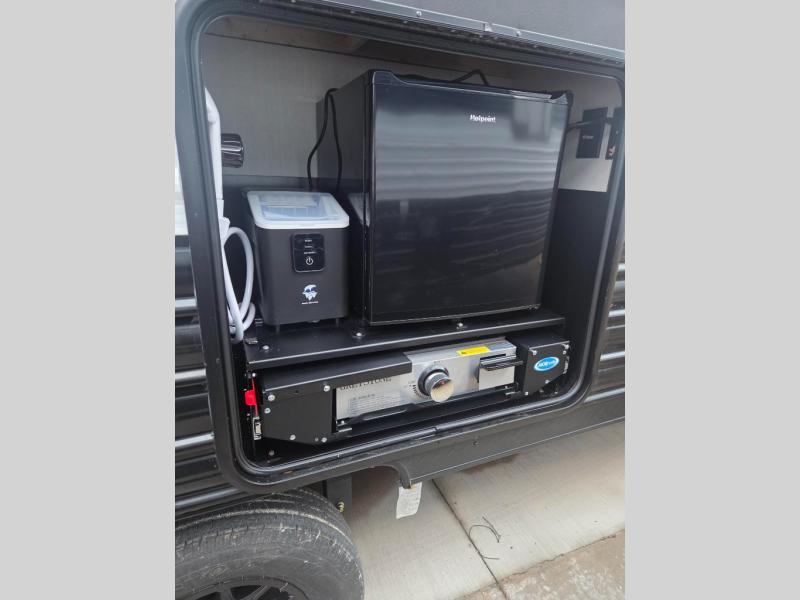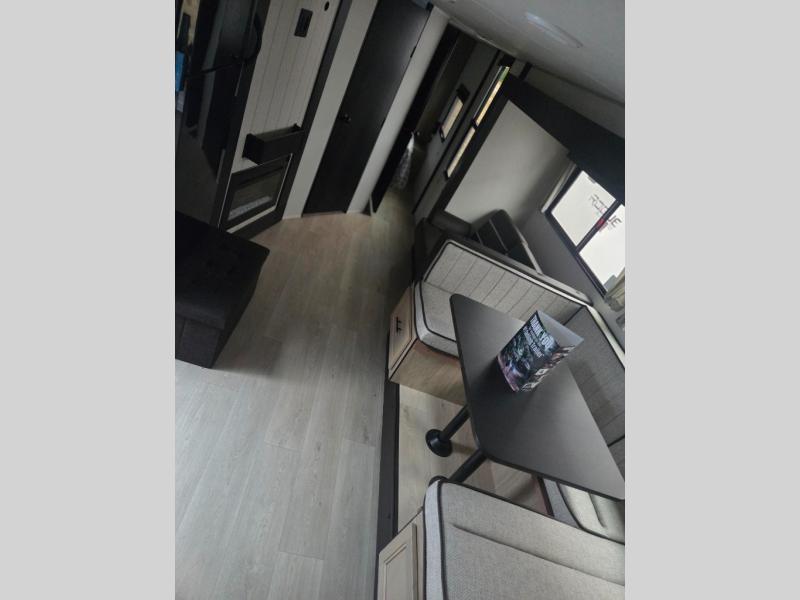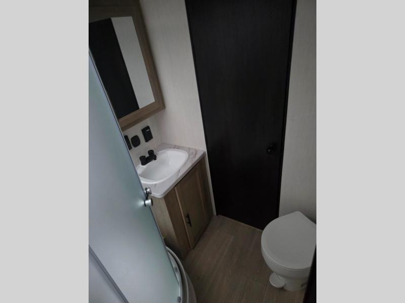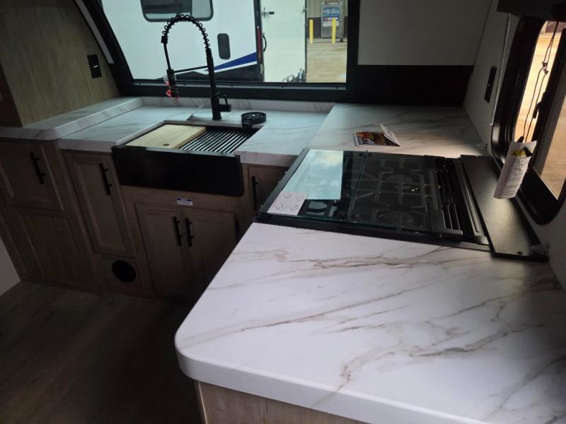 Since this travel trailer features dual entry doors, you can enter in through the rear master bedroom or the front kitchen; how convenient! The kitchen includes ample counter space and all the appliances to prep meals, along with a pantry up front and a hidden pantry behind the fireplace. Your crew can get comfortable on the sofa or play a game around the U-shaped dinette, although you may just find yourselves outdoors since there is an outside kitchen and a power awning with LED lights. The dual entry bath will let you enter in through the main living area, plus it has a private entrance into the bedroom. Here, you'll find an RV king bed, a wardrobe for your things, and USB ports to keep your electronics charged!
